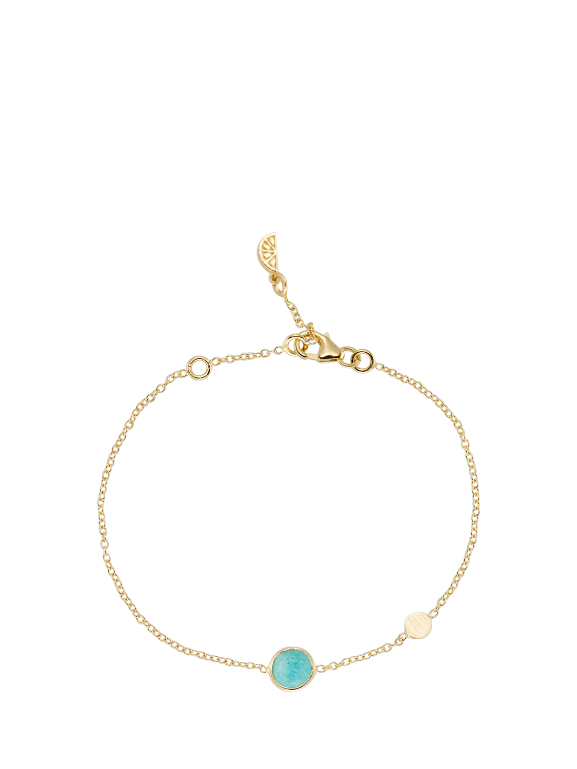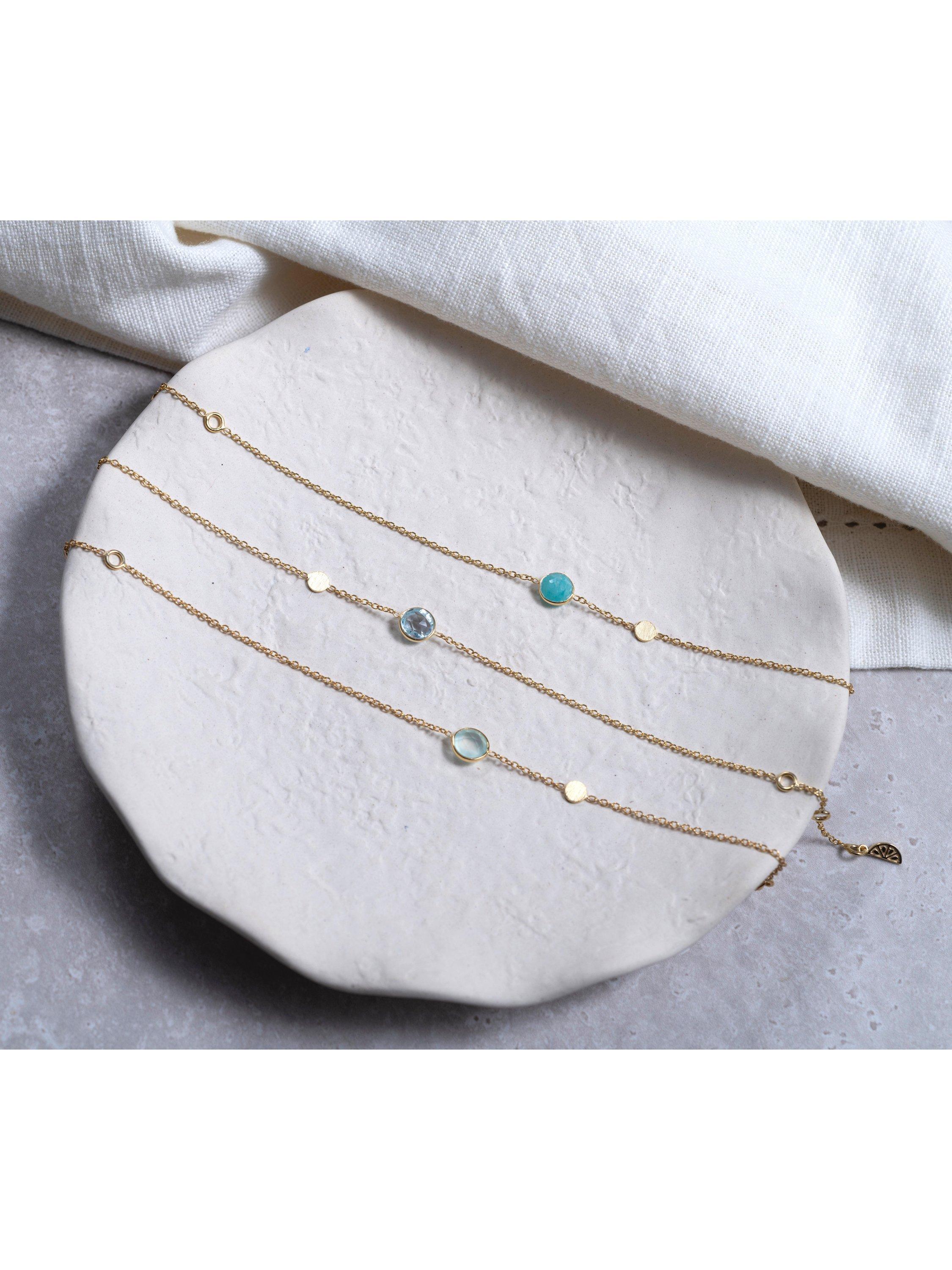 A round Amazonite gemstone and the prettiest brushed disc set on a fine chain bracelet. The bracelet can be worn at three different lengths, ensuring it will fit all wrist sizes.