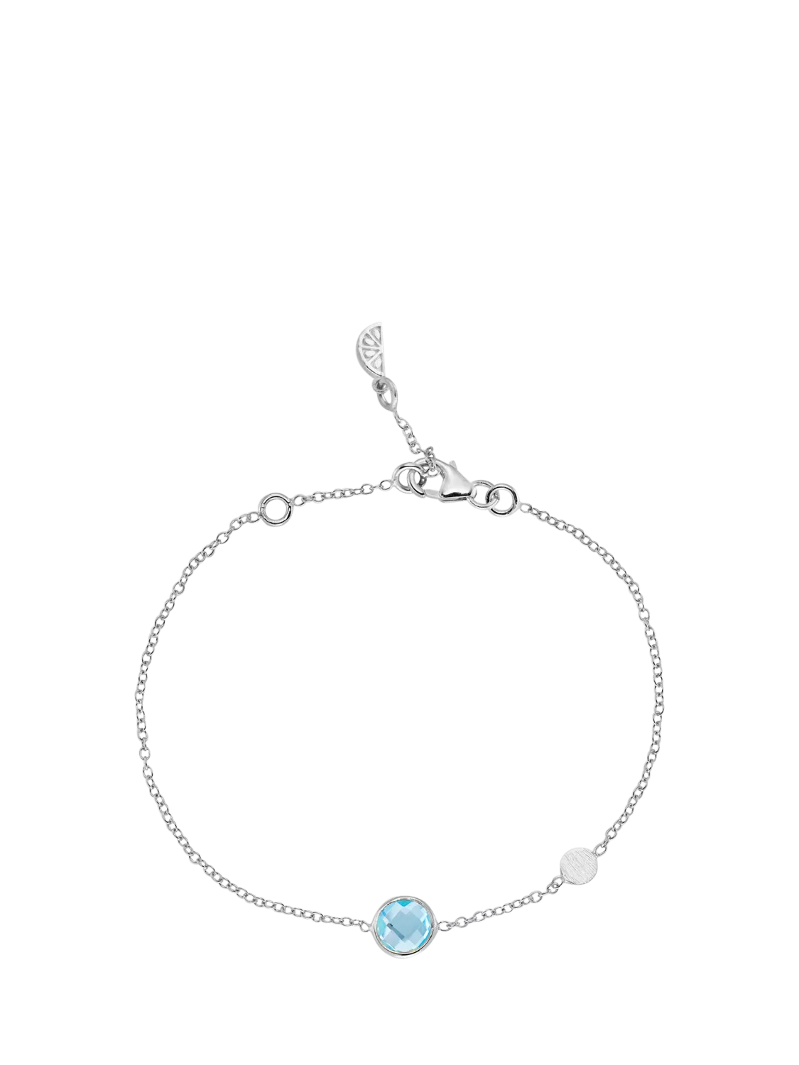 A round Blue Topaz gemstone and the prettiest brushed disc set on a fine chain bracelet. The bracelet can be worn at three different lengths, ensuring it will fit all wrist sizes.