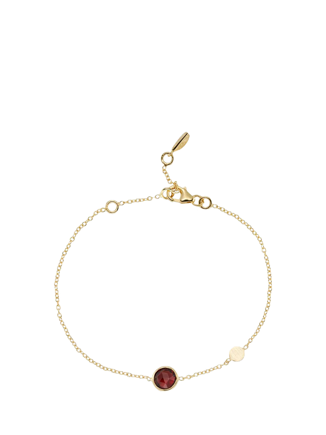 Bright red Garnet gemstone on a pretty chain with a feature brushed disc. This bracelet is inspired by a trip to Sicily and has a lemon charm that hangs by the clasp. Garnet is believed to bring love, luck and loyalty to the wearer.