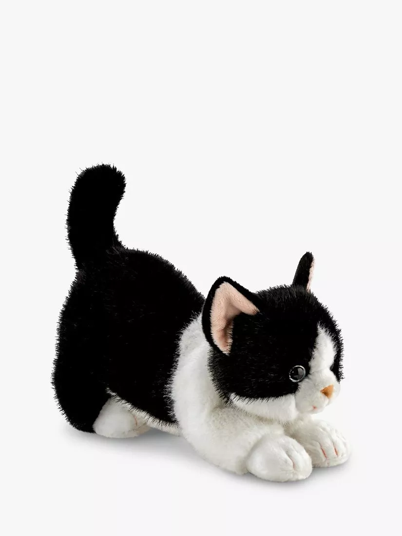 This adorable black-and-white kitten plush is crafted to resemble a real cat, featuring ultra-soft, furry fabric that mimics the texture of a kitten’s fur. The cat is shown in a playful crouching position, with its front paws stretched forward and its tail curved upward, suggesting it’s ready to pounce or play.