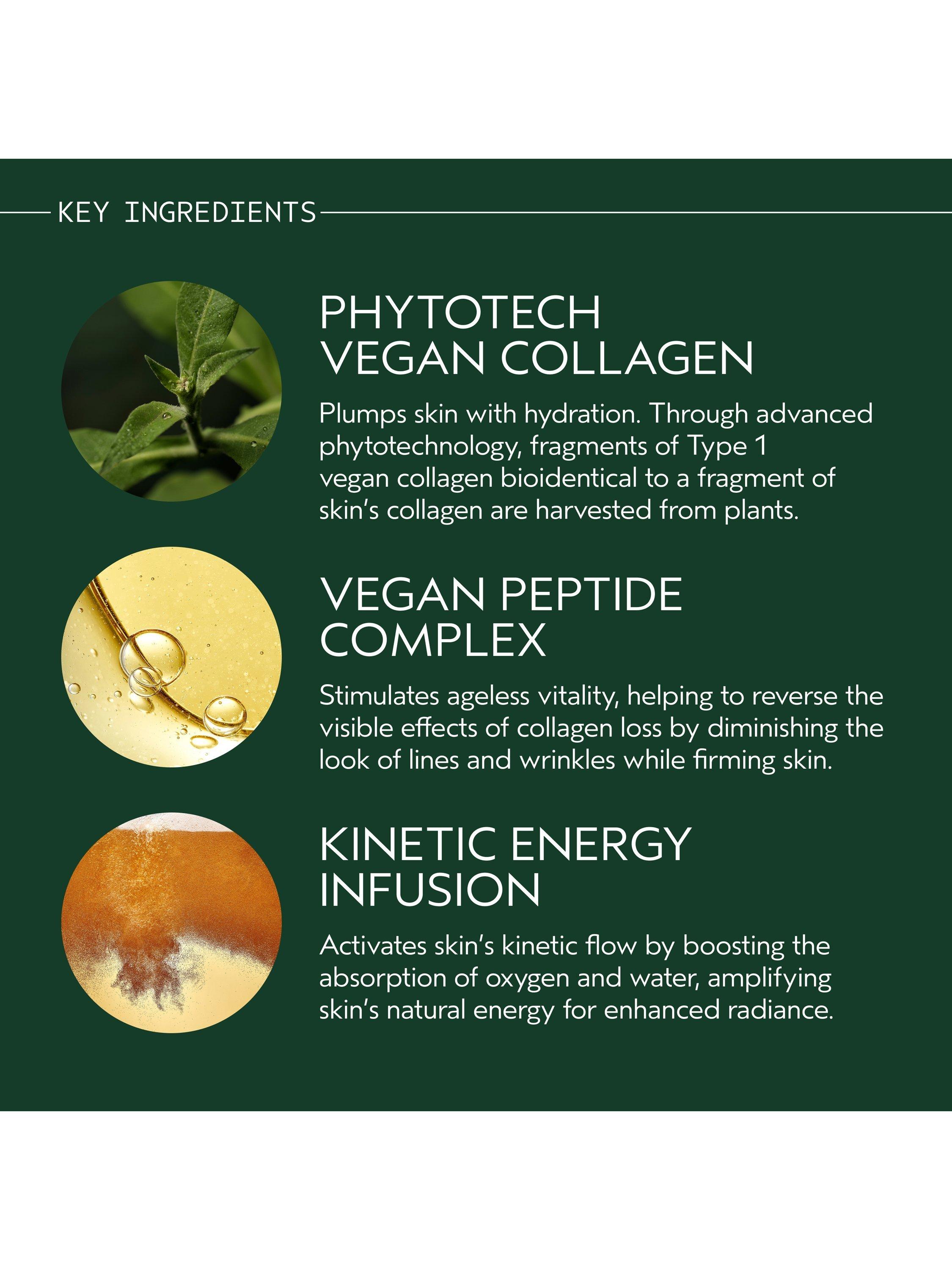 - Vegan Peptide Complex: Stimulates ageless vitality—helping reverse the visible effects of collagen loss by diminishing the look of lines and wrinkles and firming skin