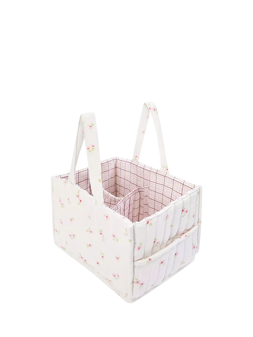 The ideal addition to your baby changing station. Avery Row's quilted nappy caddy has two outer pockets and three inner compartments, perfectly sized for storing nappies, creams and wipes. Handles make the caddy portable, so your baby changing essentials can always be close to hand. Finished in a pretty floral print.