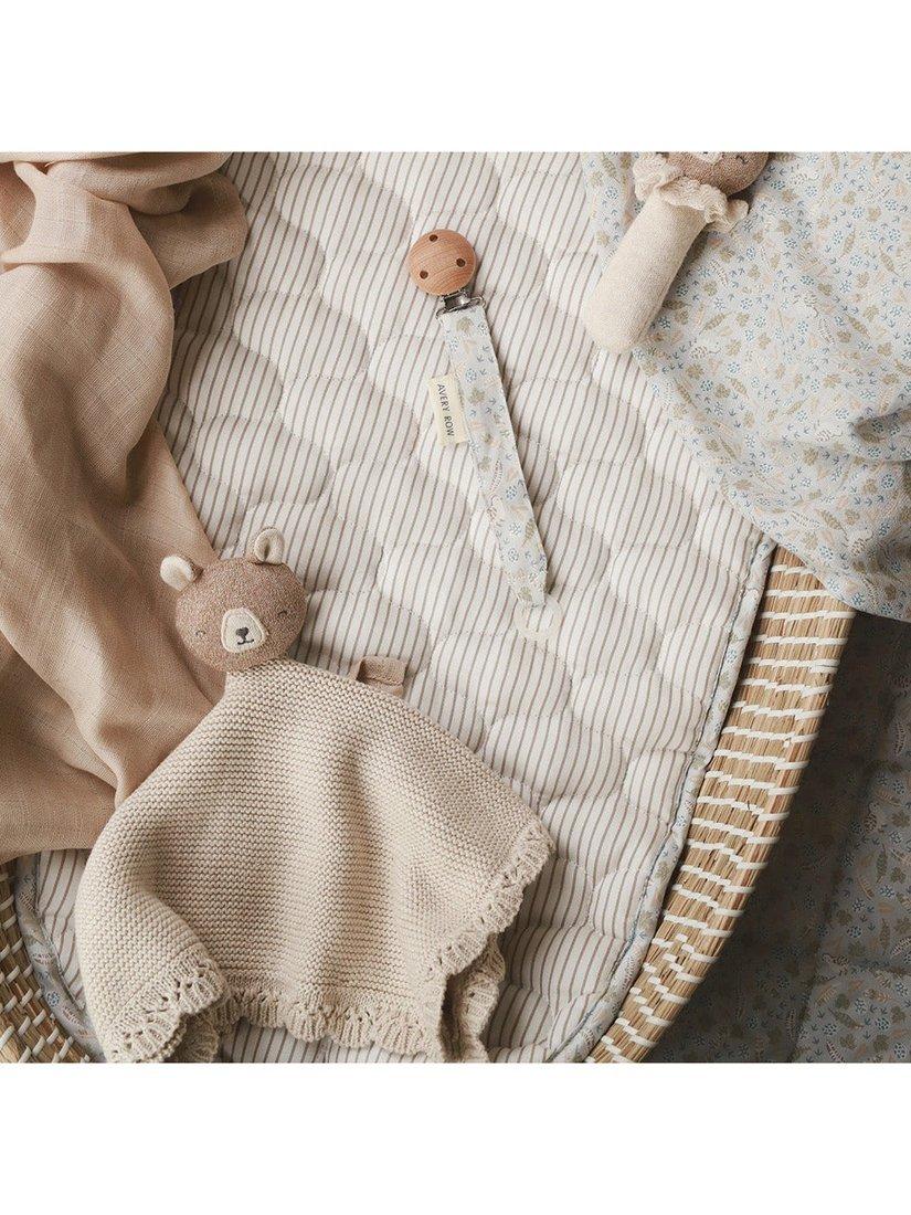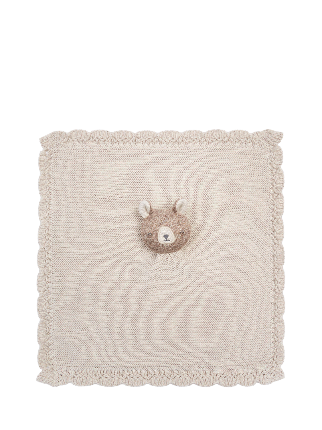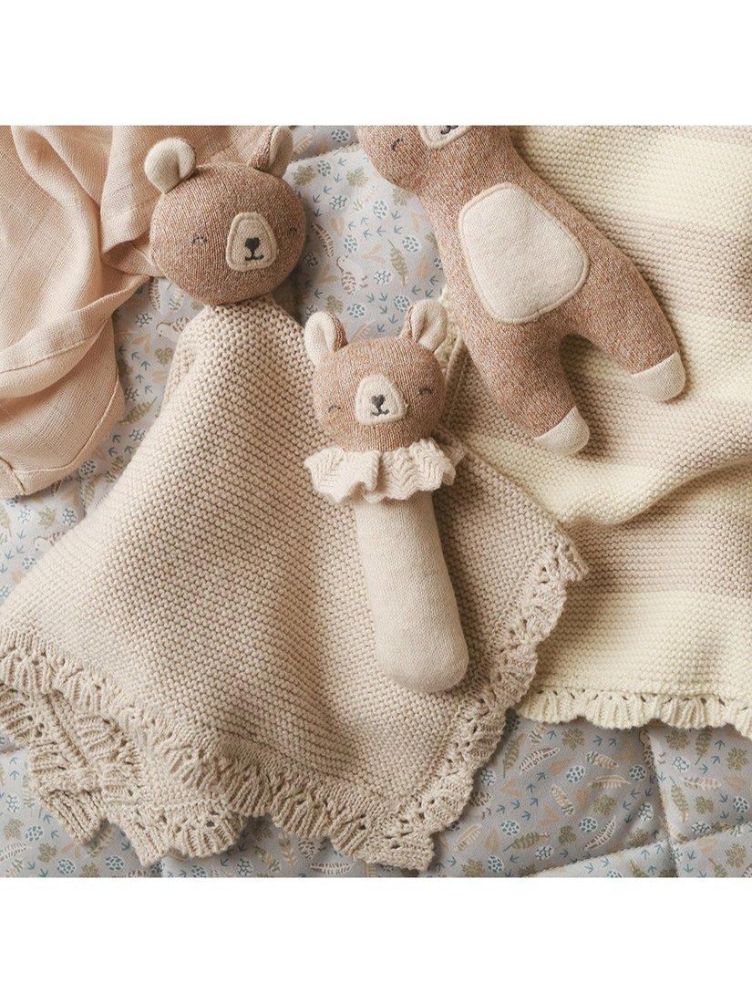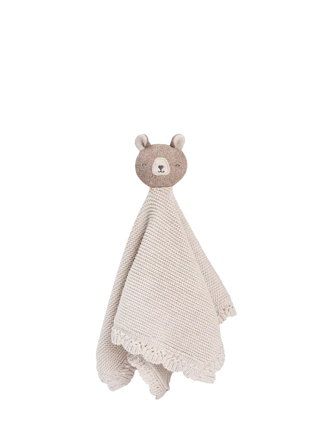 Meet your little one's first friend, the Cuddle Cloths. This sweet brave bear has been designed for little hands to grip and squish, and the scallop edge knitted cloth is perfect for snuggling. Made from organic cotton and organic dyes, the bear cuddle cloth is soft on your little one's skin and kind to the environment. The recycled polyester filling means this toy is lightweight and the knitted cloth gives a sensory element whilst being soothing and snuggly.
