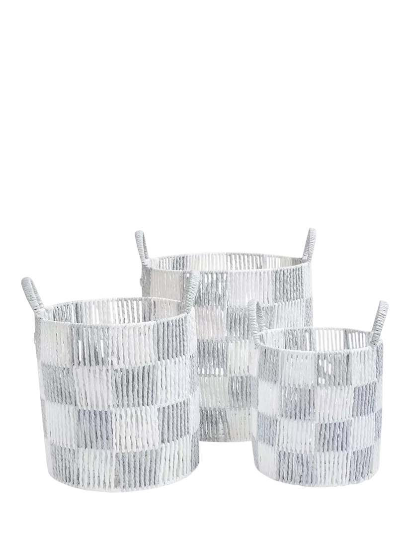 Set of 3 baskets made with paper wrapped around a sturdy wire frame. As they're handwoven and unique, it is to be expected that there may be small imperfections in the weave.