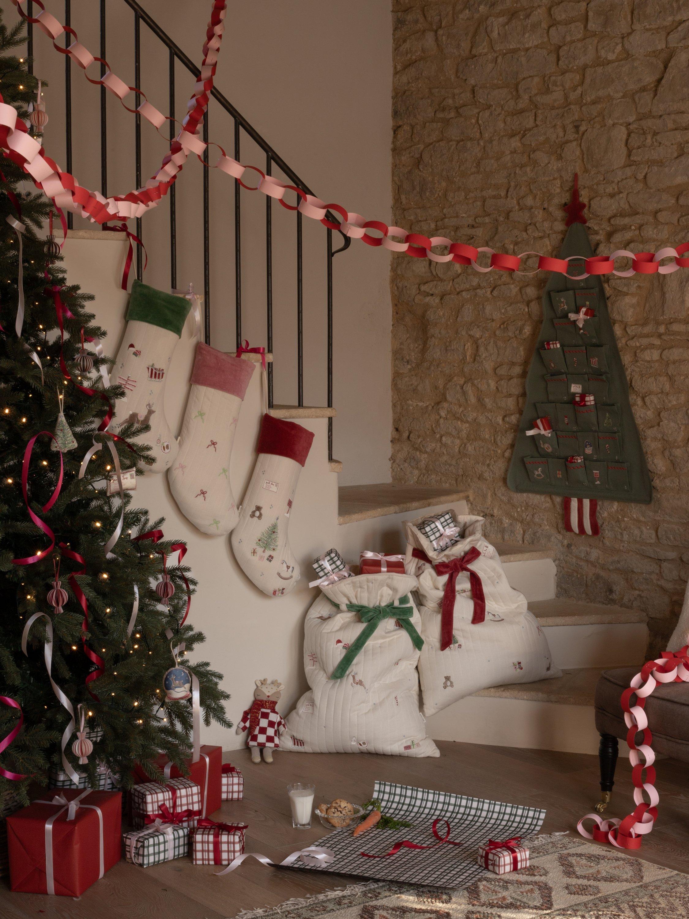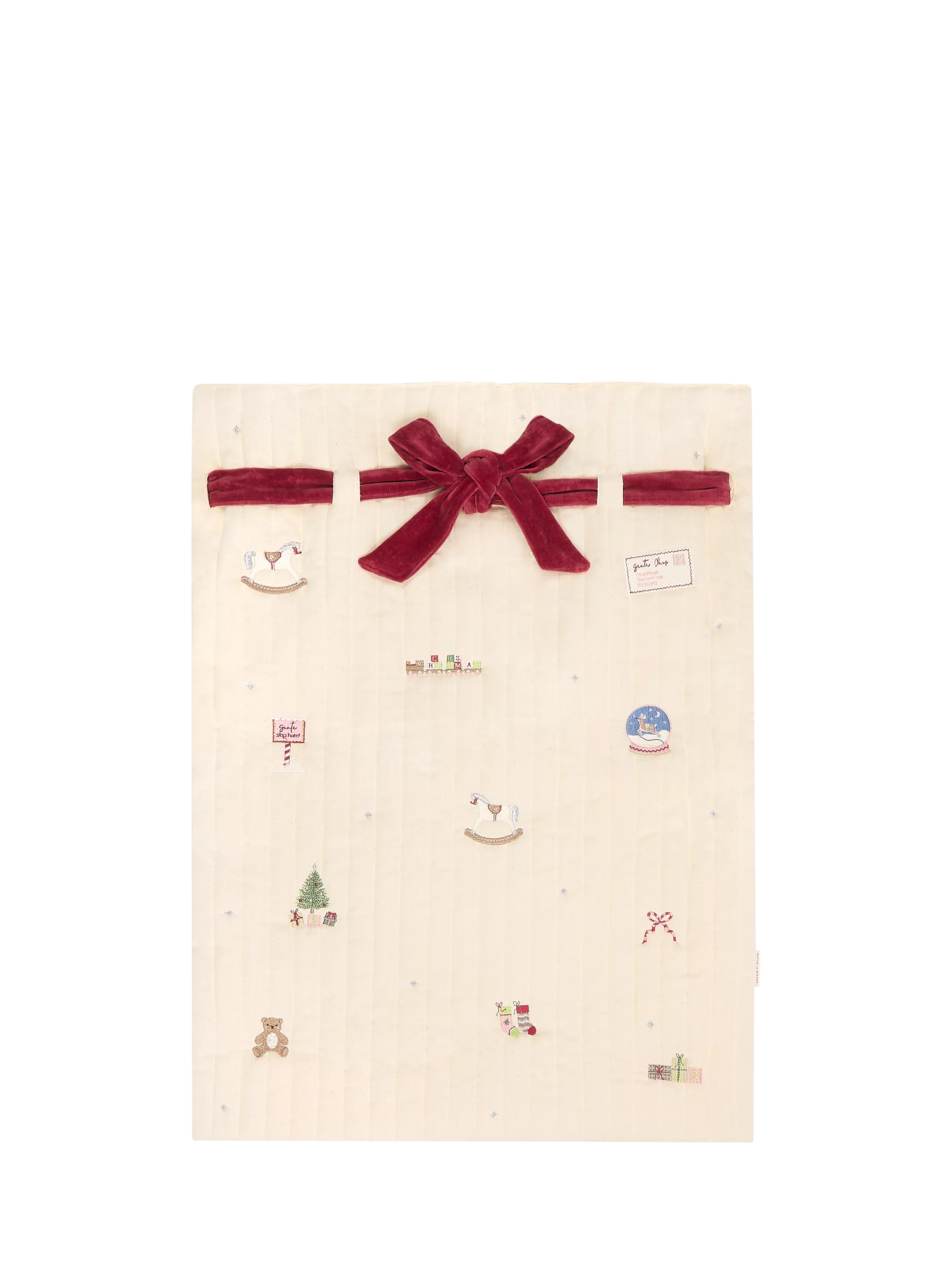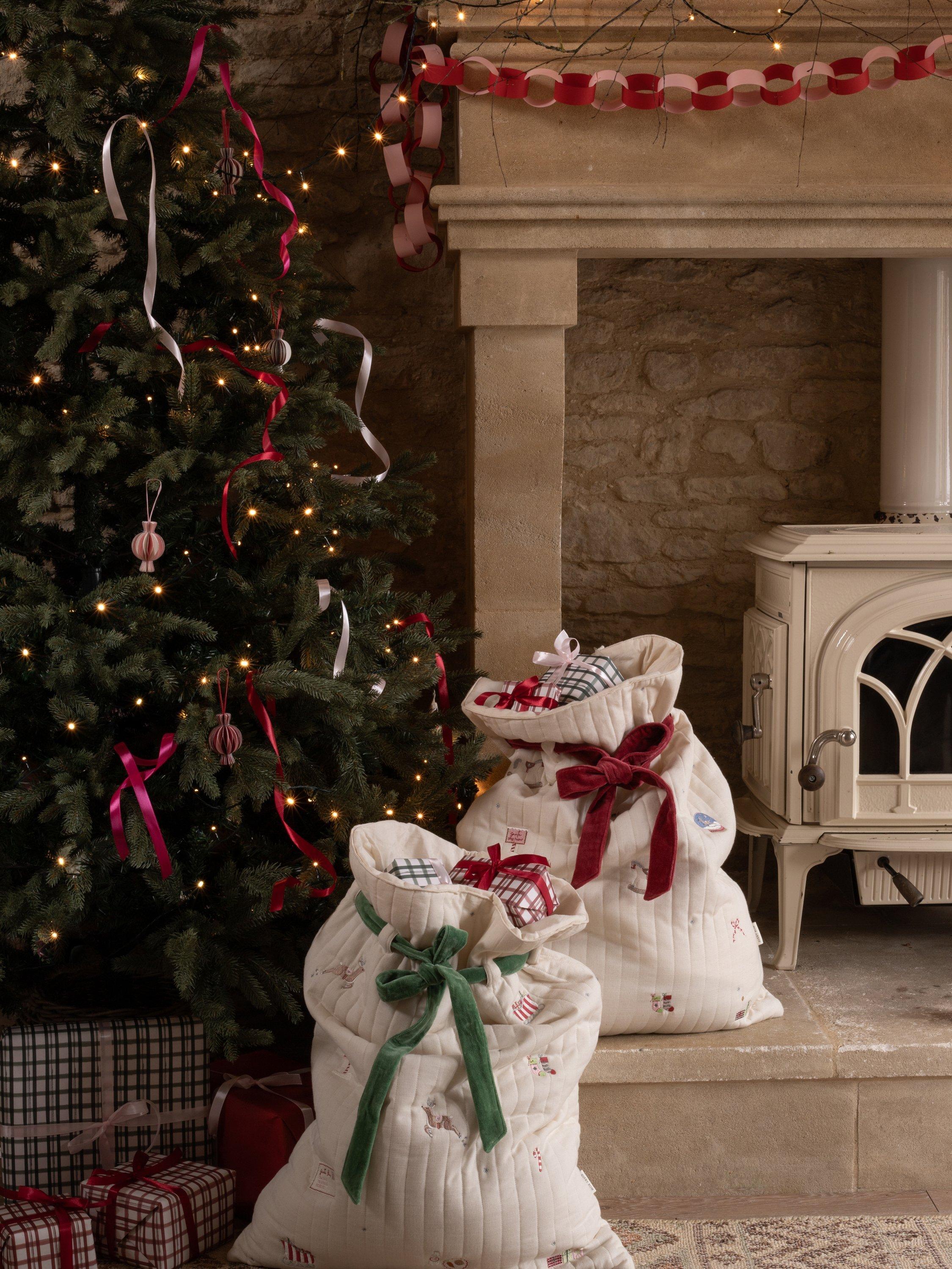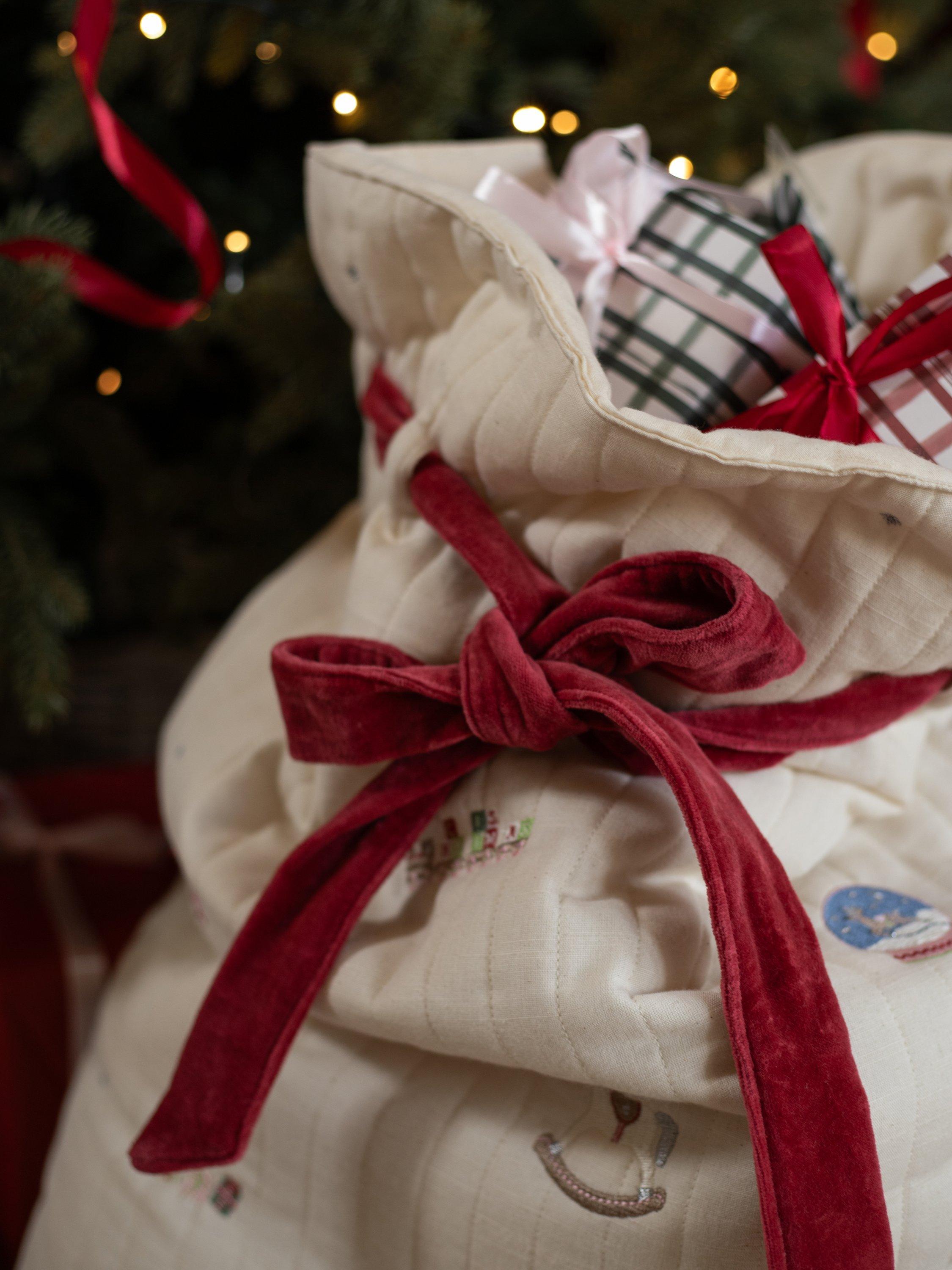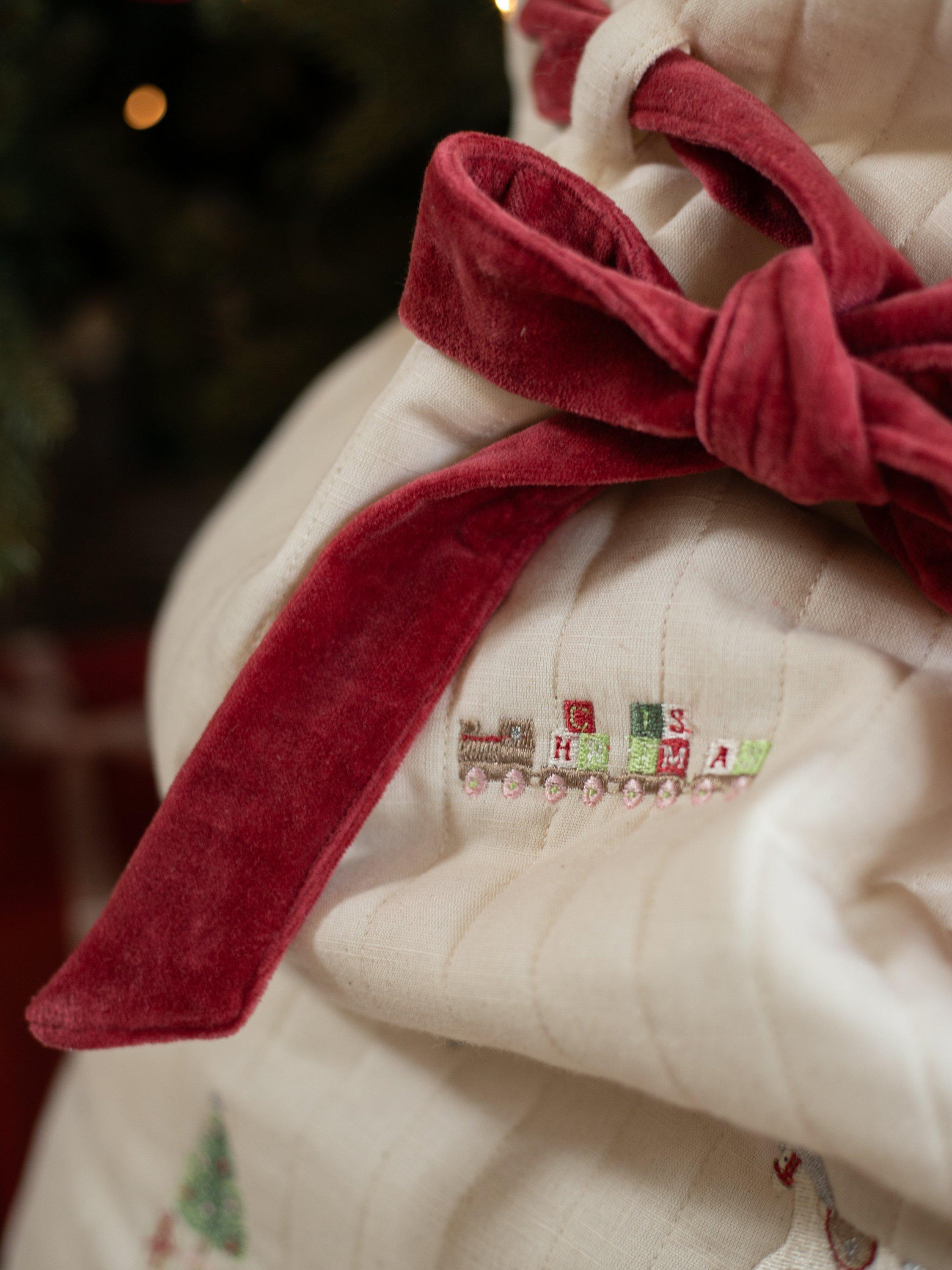 Handy for storing special presents under the tree, or transporting them, all while keeping them out of sight of excited little eyes! Create their favourite tradition for years to come with Avery Row's playful versions of a Christmas classic. Each spacious present sack is made with lightly quilted organic cotton, with embroidery details, topped off with a luxurious velvet tie to keep the presents safe.