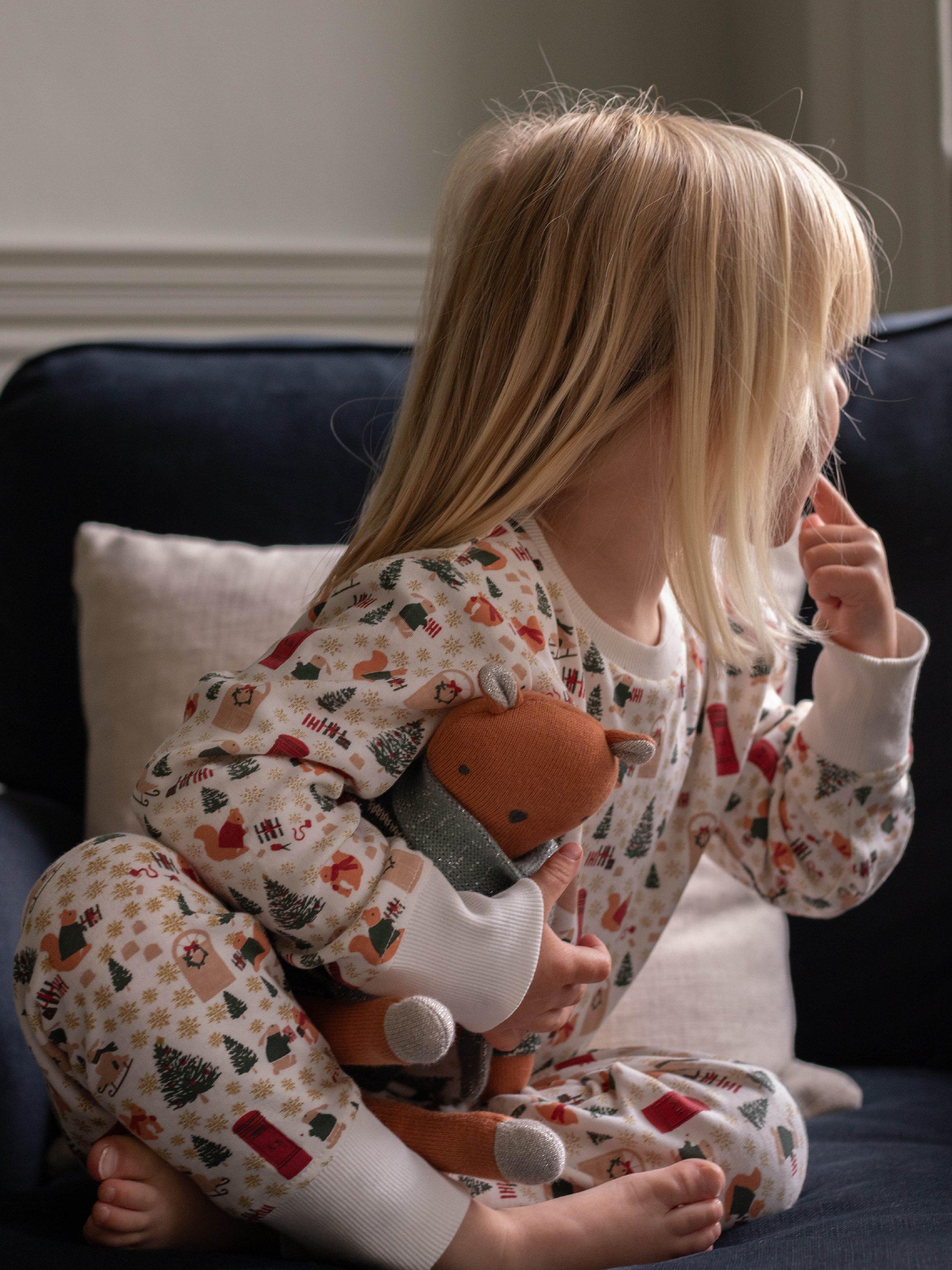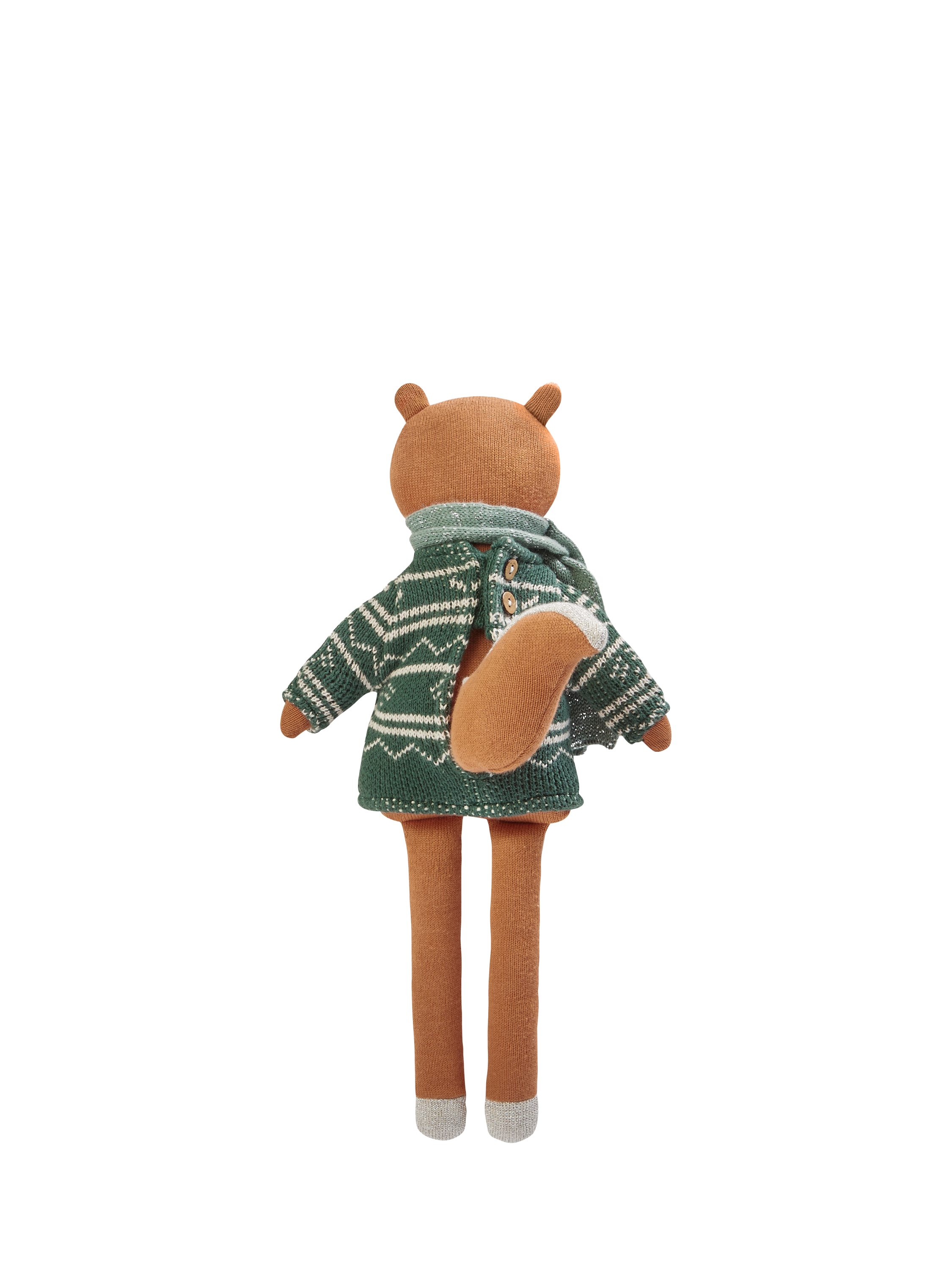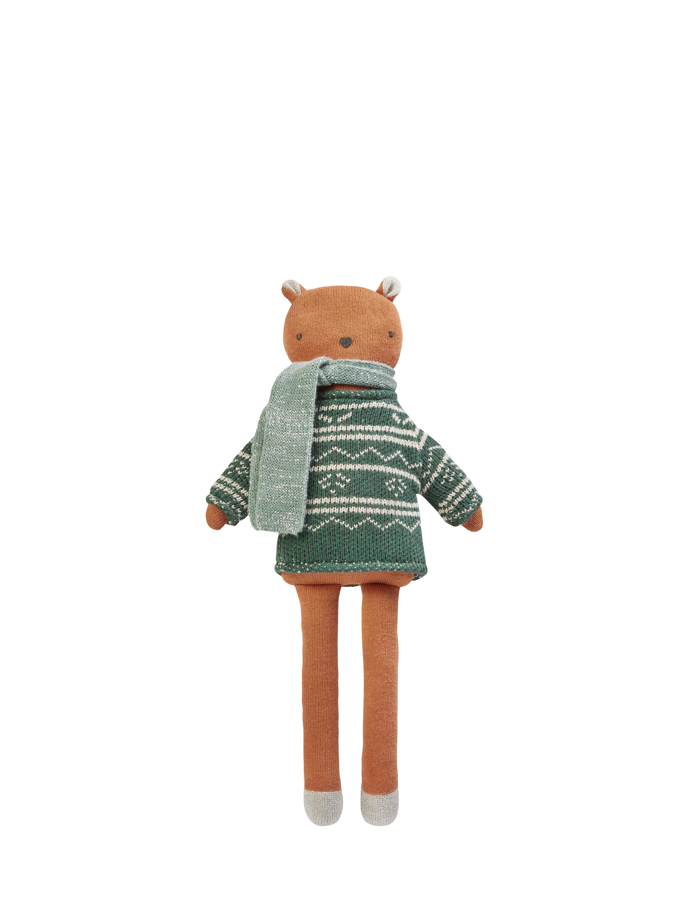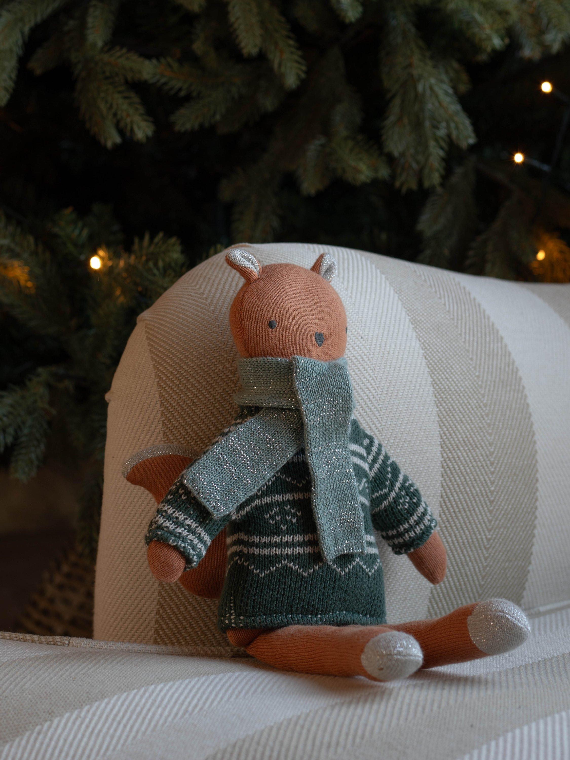 Snuggled up cosy and warm in a Fair Isle knit jumper and scarf, this knitted squirrel toy features sweet embroidered facial features, a bushy tail and metallic details on the ears, feet and tail. Made from 100% cotton and with a polyester filling.
