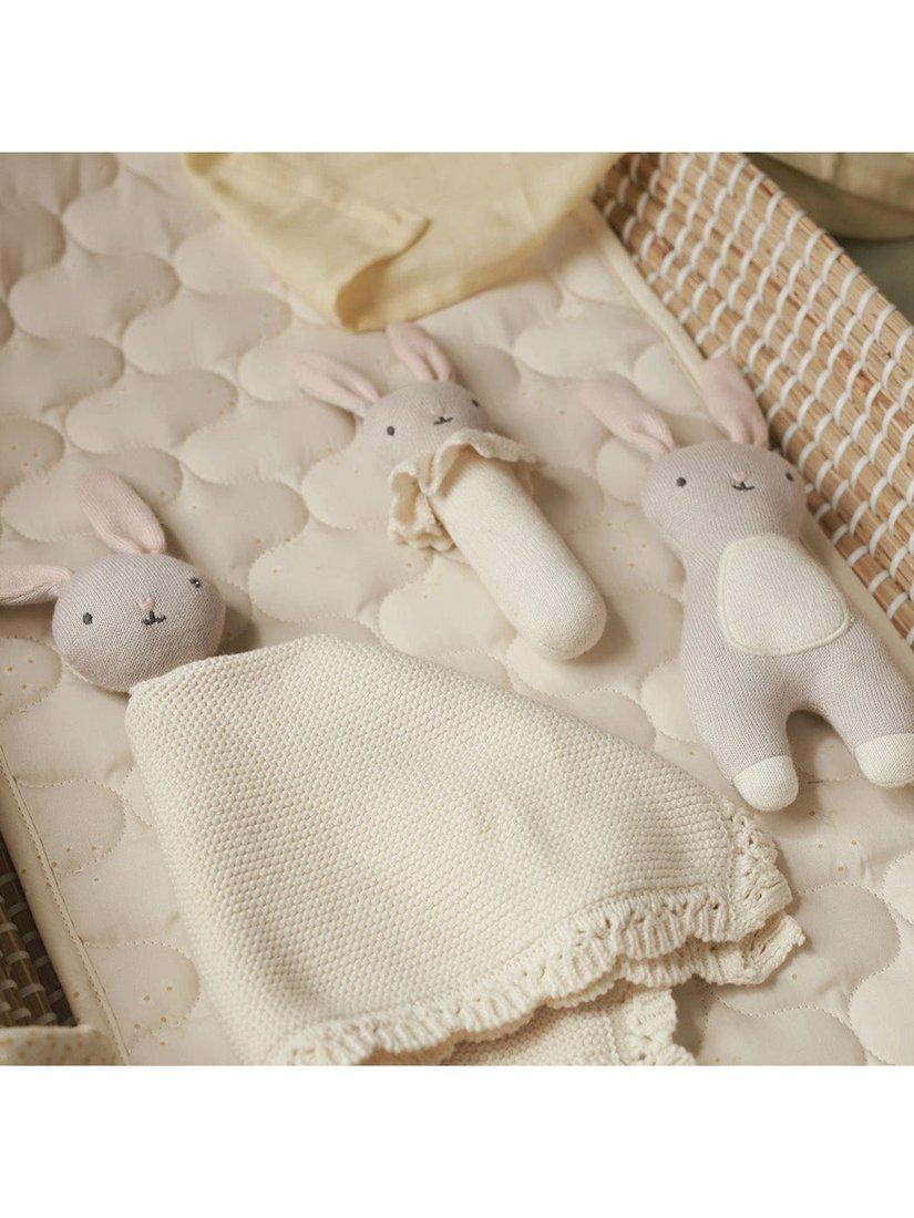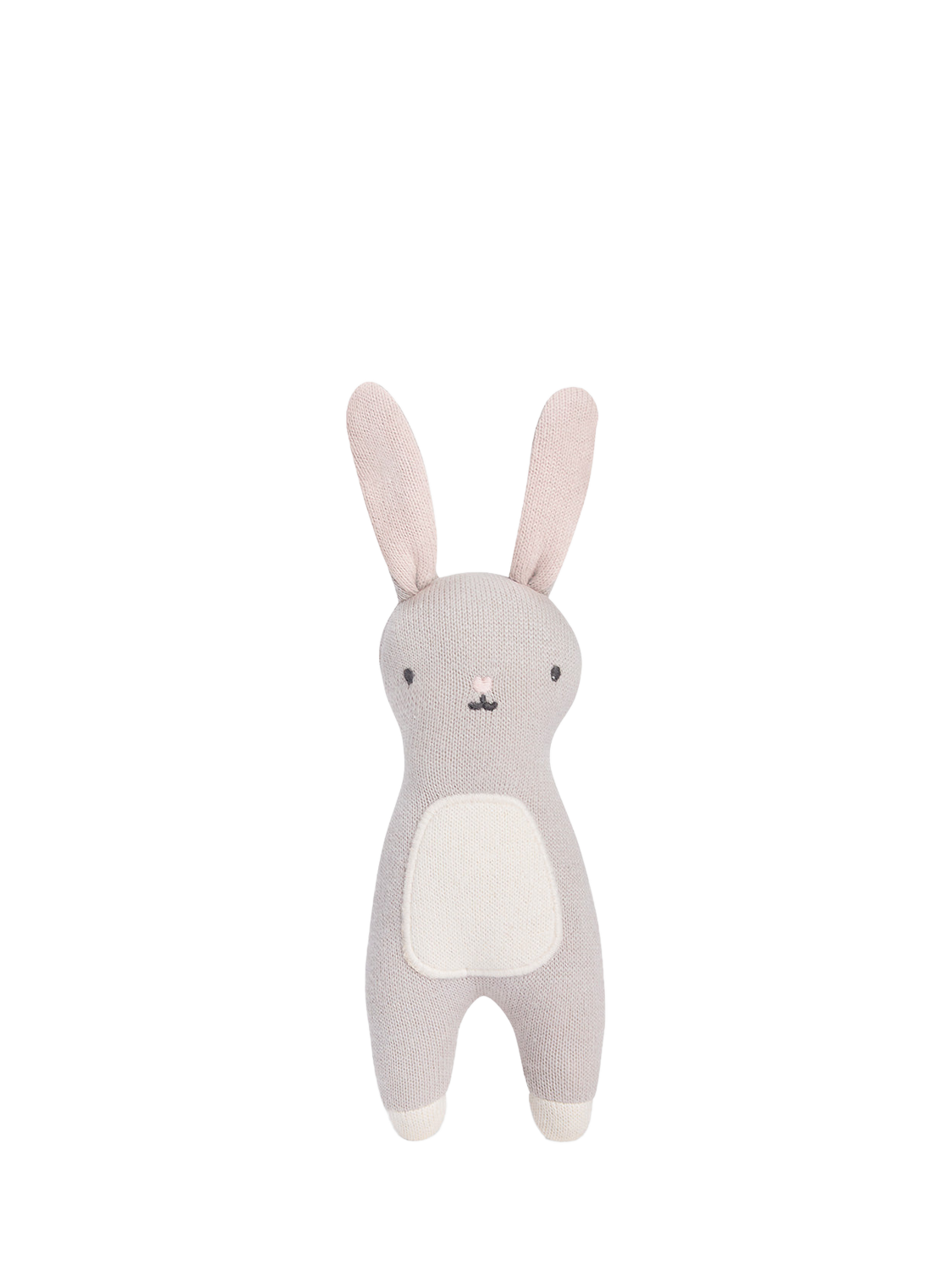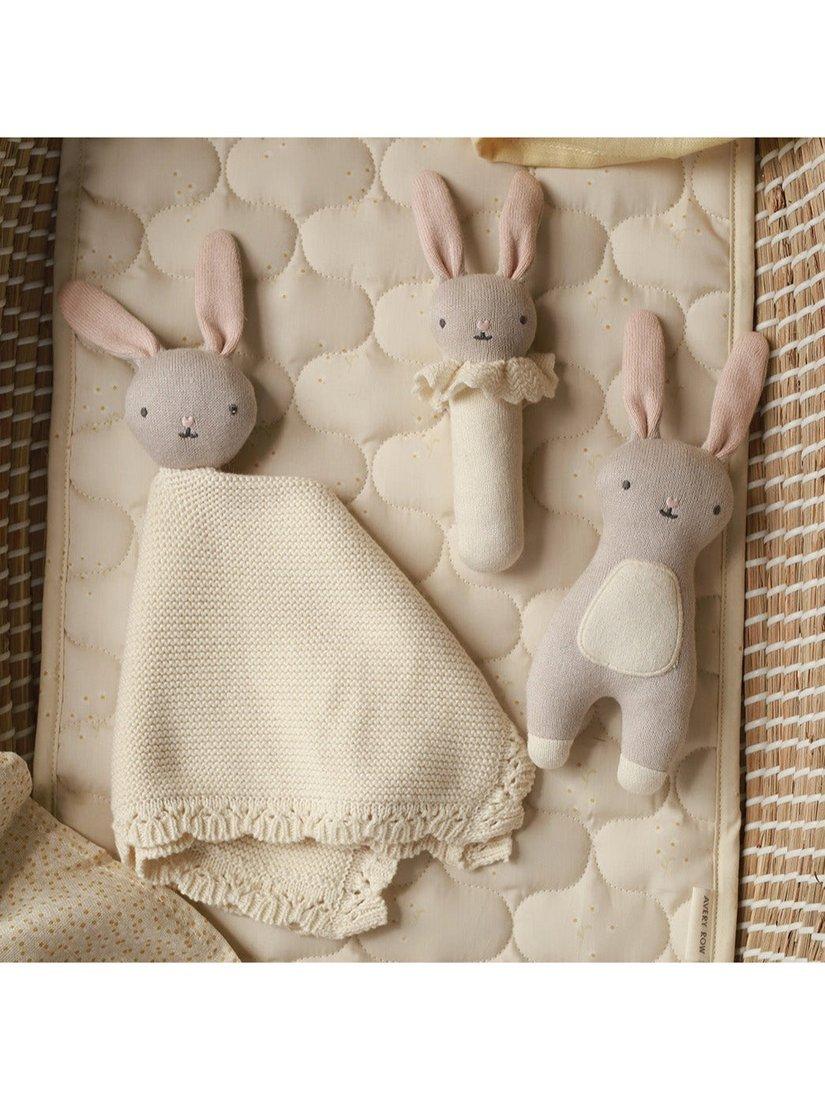Meet your little one's first friend, the Little Hands Toy. This sweet blushing bunny has been designed for little hands to grip, snuggle and squish. Made from organic cotton and organic dyes, the knitted bunny is soft on your little one's skin and kind to the environment. The recycled polyester filling means this toy is lightweight and super snuggly, the perfect companion for the new arrival in your life.
