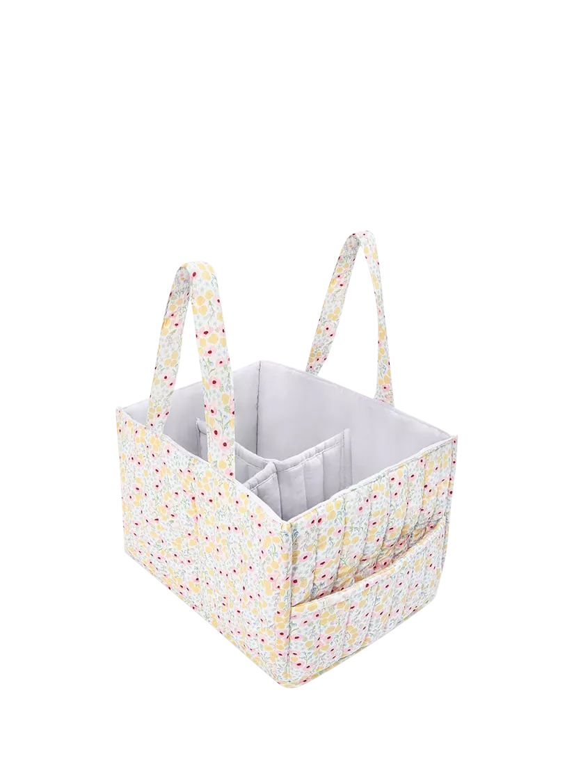 Quilted nappy caddy with 2 outer pockets and 3 inner compartments, perfectly sized for storing nappies, creams and wipes. Handles make the caddy portable, so your baby changing essentials can always be close to hand.