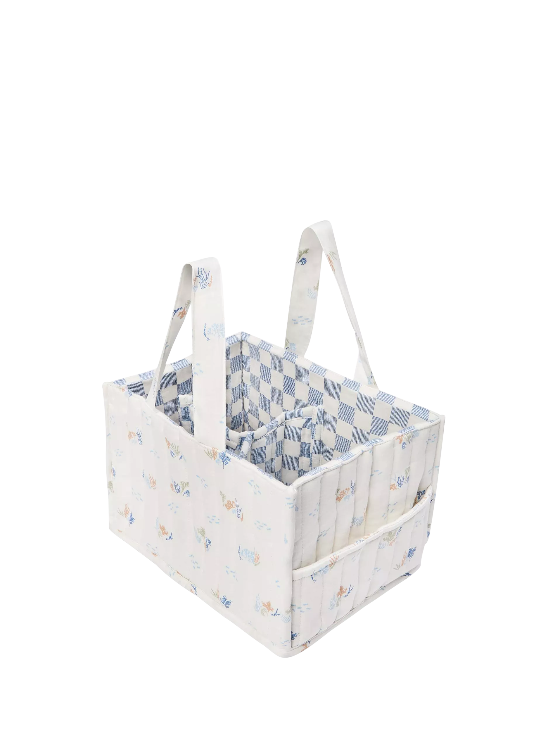 The perfect addition to your baby changing station. This quilted nappy caddy has 2 outer pockets and 3 inner compartments, perfectly sized for storing nappies, creams and wipes. Handles make the caddy portable so your baby changing essentials can always be close to hand.
