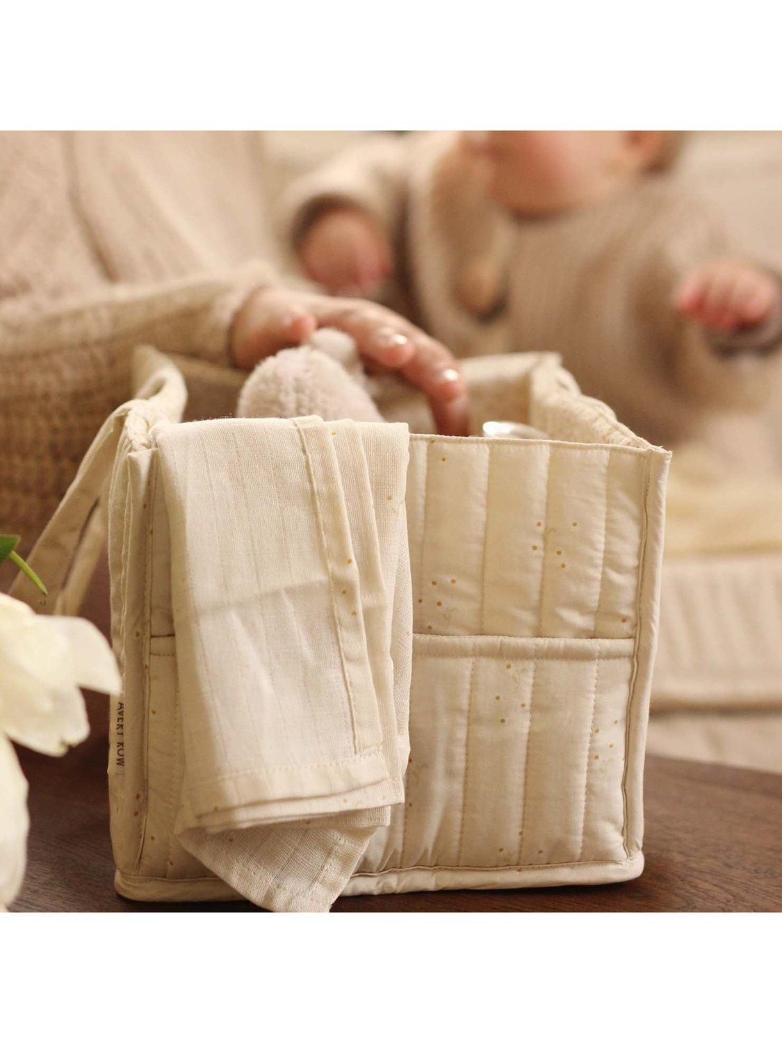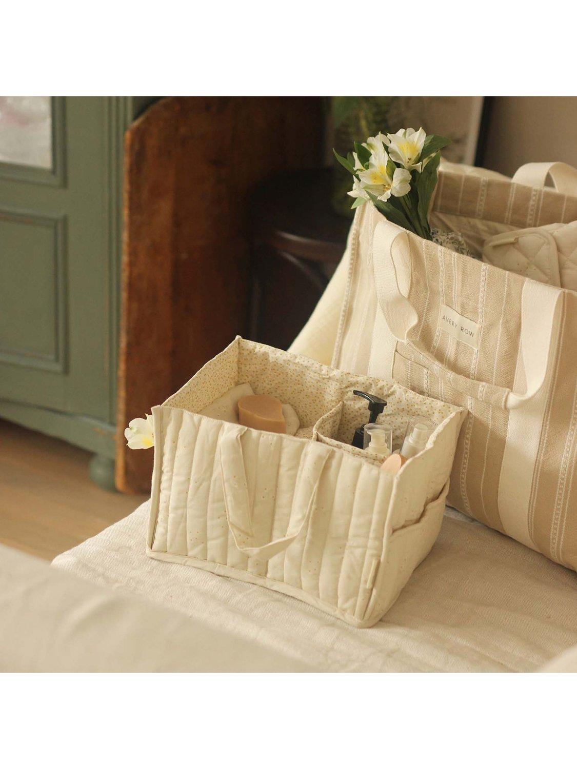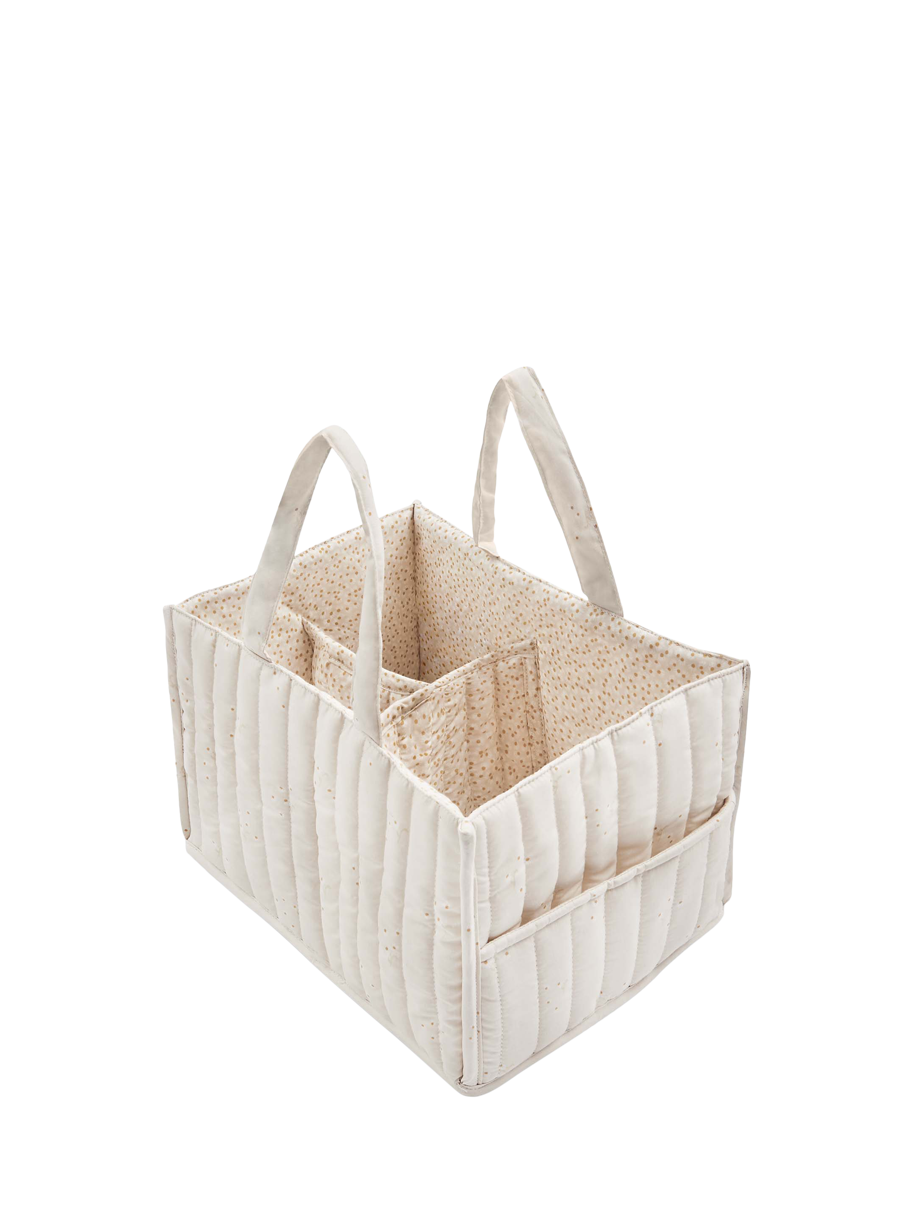 The perfect addition to your baby changing station. This quilted nappy caddy has 2 outer pockets and 3 inner compartments, perfectly sized for storing nappies, creams and wipes. Handles make the caddy portable so your baby changing essentials can always be close to hand.