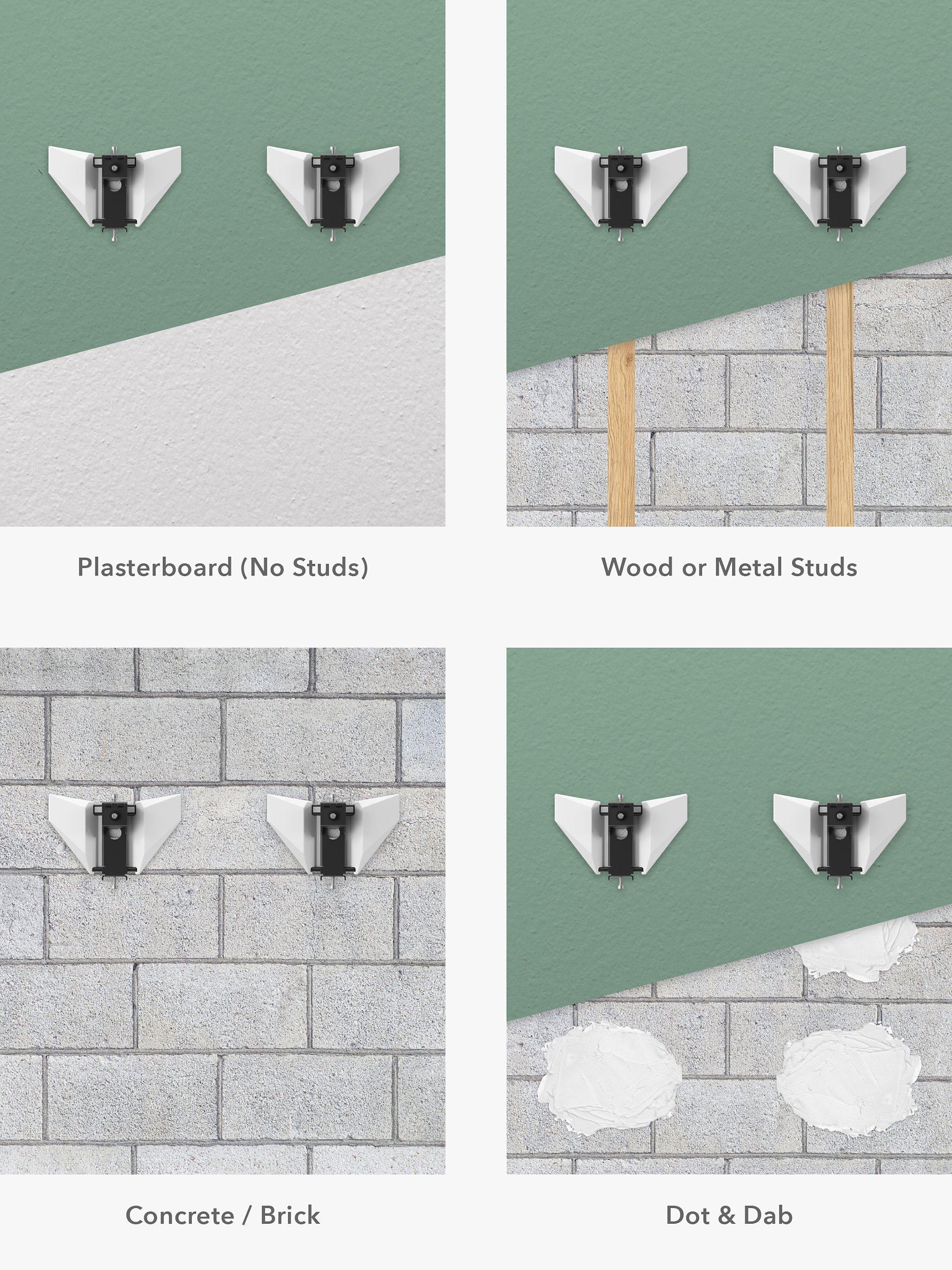 Mount your TV anywhere on any wall, even plasterboard / drywall alone. The Unimax range of products include fixings for wood stud, metal stud, brick, concrete and feature unique mounting toggles that can be used on plasterboard / drywall so you can mount your TV to any of these surfaces or any combination of them. So you can choose the exact position for your TV and are not restricted to using wall stud locations only.
