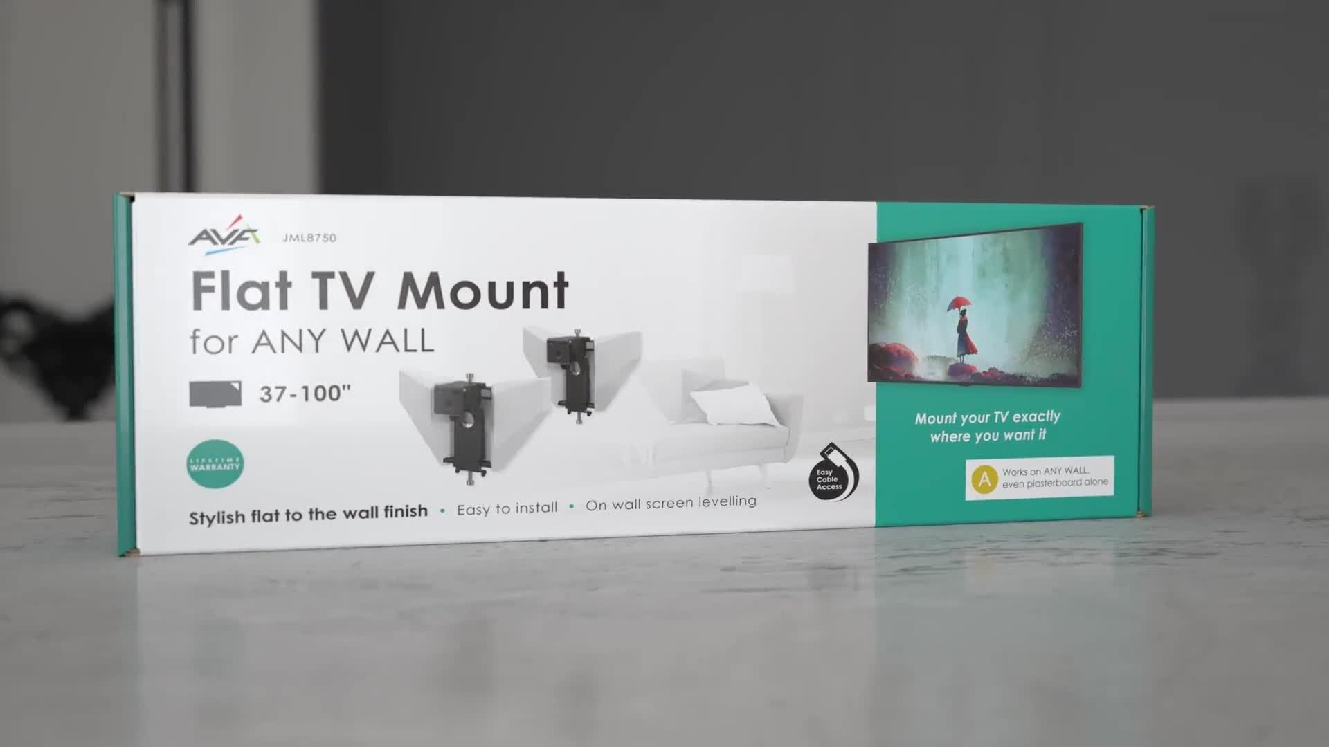 The JML8750 securely holds TVs from 37” up to 100” and 100kg in weight. This low profile, flat-to-the-wall TV mount features integrated screen levelling, which ensures a level installation. Universal two-piece design spans all VESA fixings from 200mm and above and includes a wide range of screws to fit most TVs. Fixings are included for all of the above wall types and a lifetime warranty means you can mount with confidence.