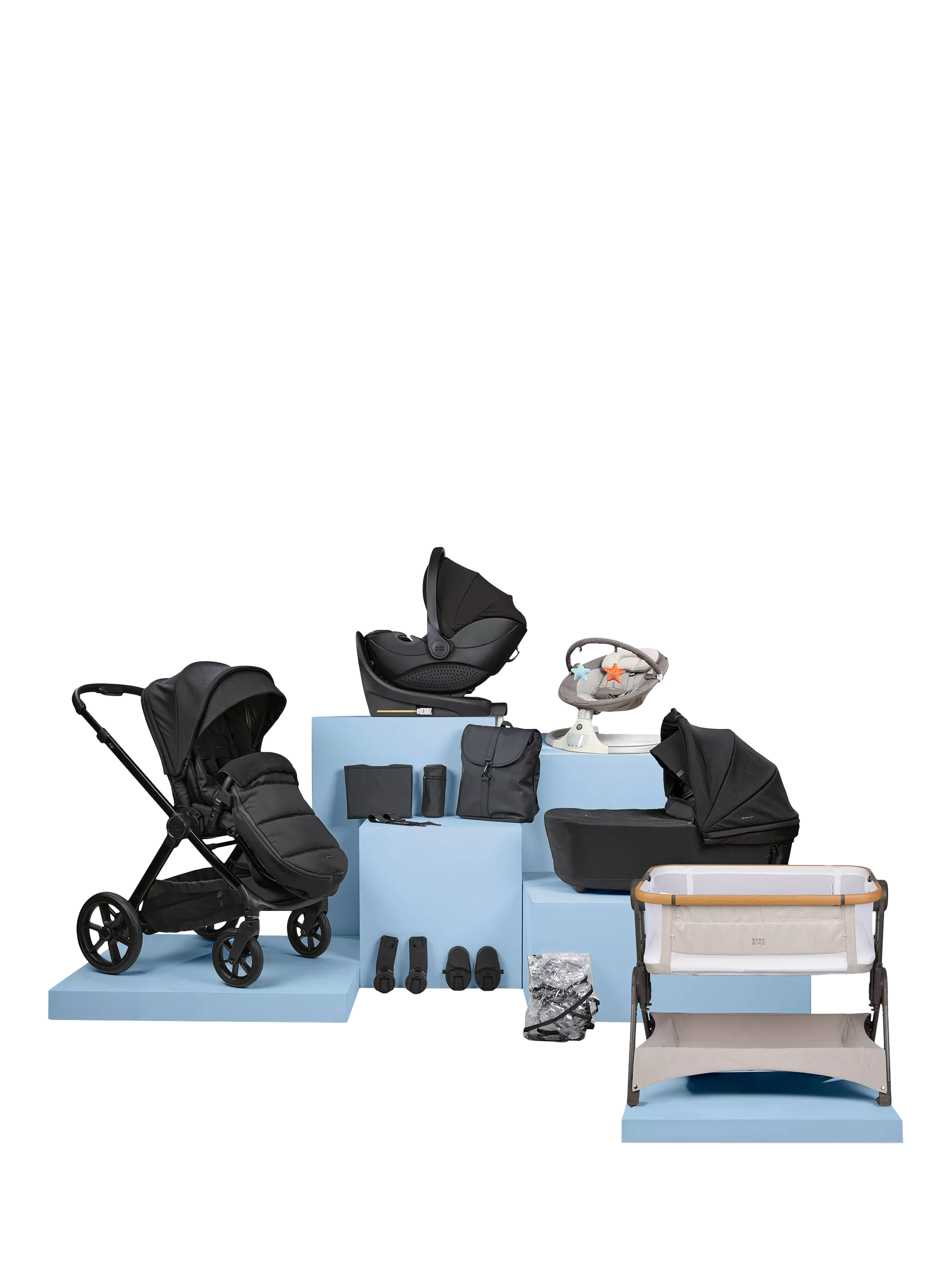 - Raffi seat unit, Raffi chassis/frame, Raffi carry cot, Footmuff, Rain cover, Car seat adapters, Carrycot risers, Changing bag, Stroller clips, Super-size changing mat, Insulated bottle holder, Hera Verto Spin car seat Hera Verto Spin ISOfix base, Hub automatic swing, Bedside and travel crib and Bedside and travel crib carry bag
