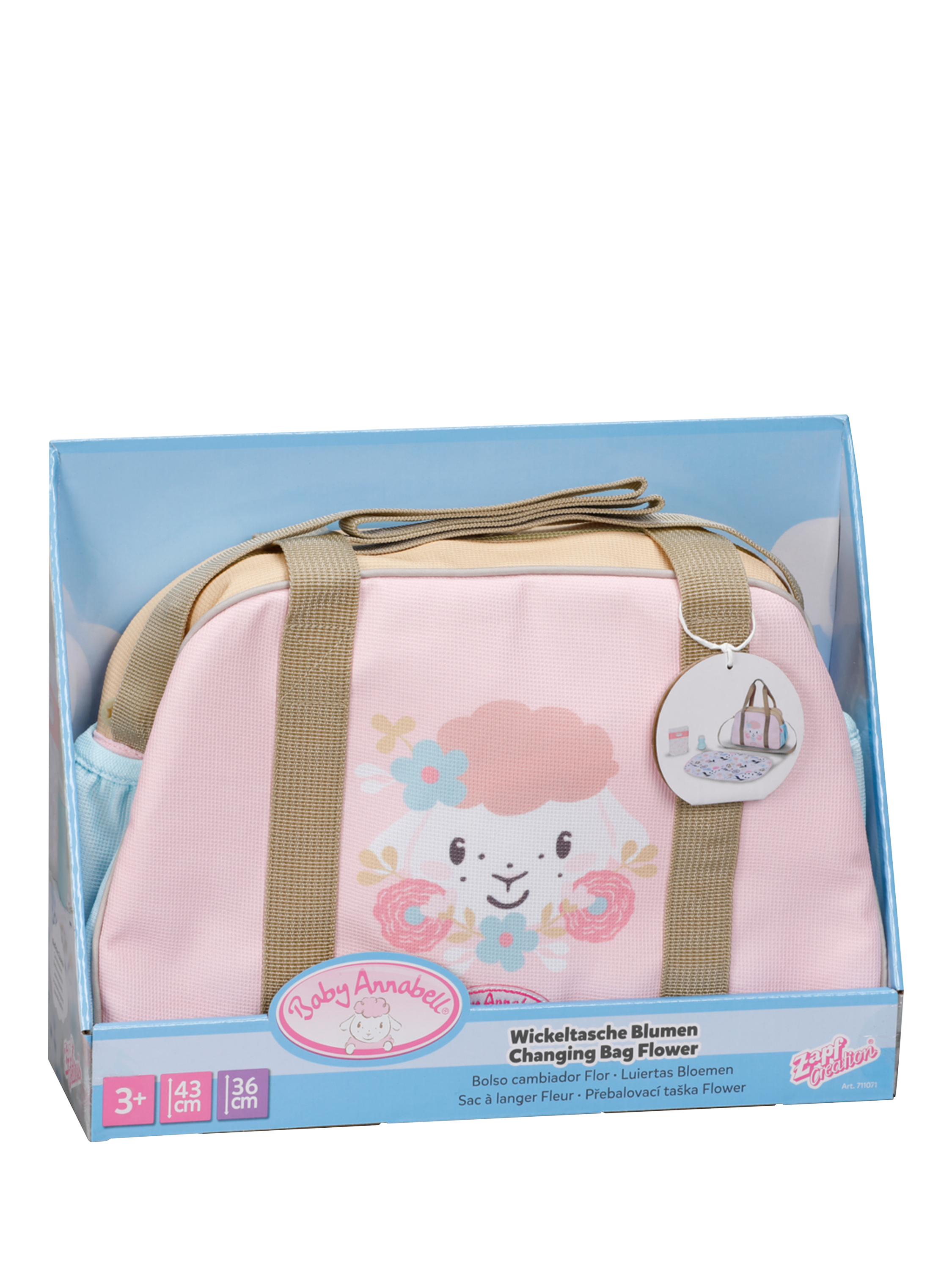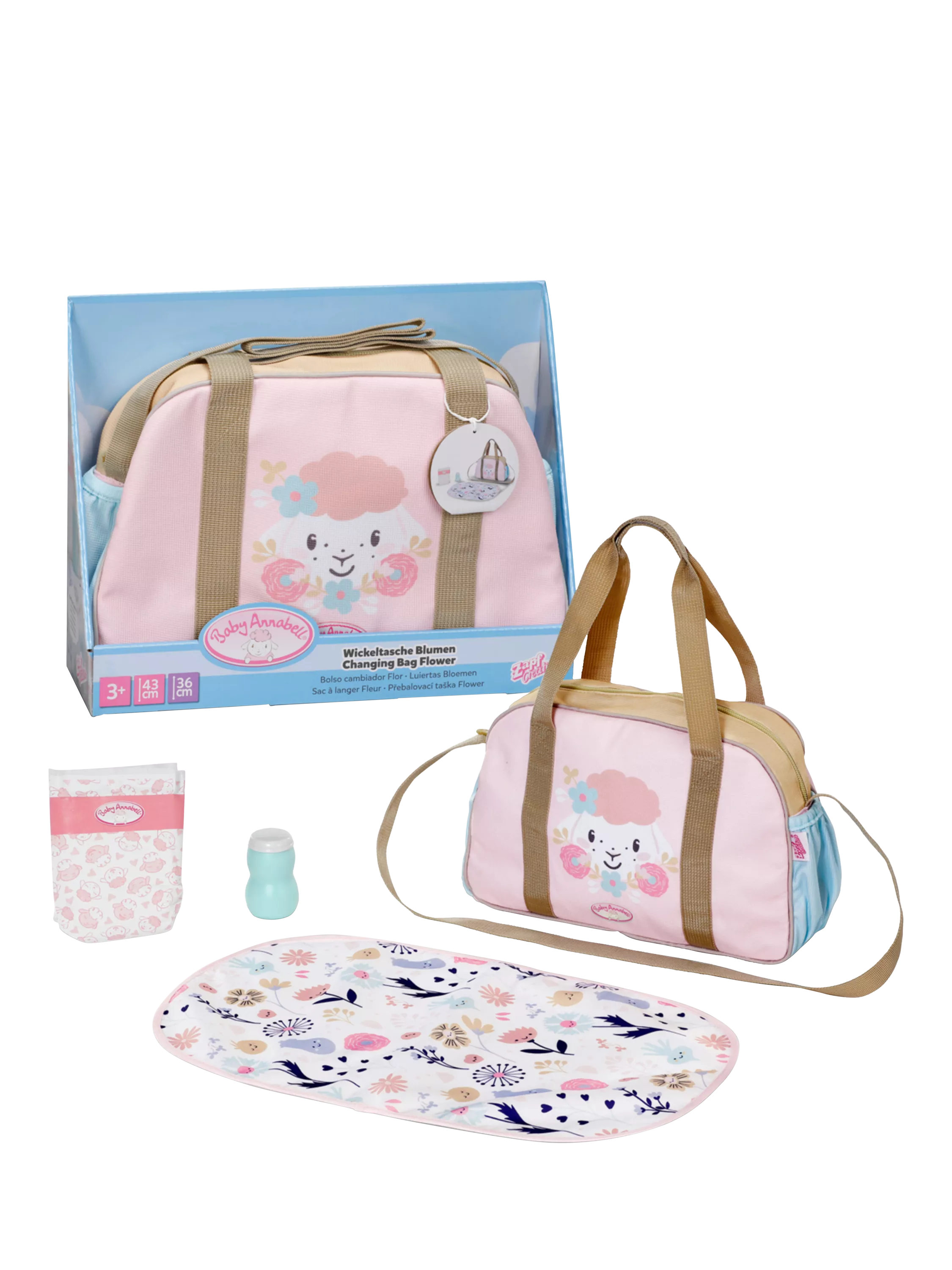 Featuring a charming sheep and owl design, light pastel colours and a shoulder strap for easy holding, the Changing Bag includes a changing mat, pretend lotion bottle and a nappy.
