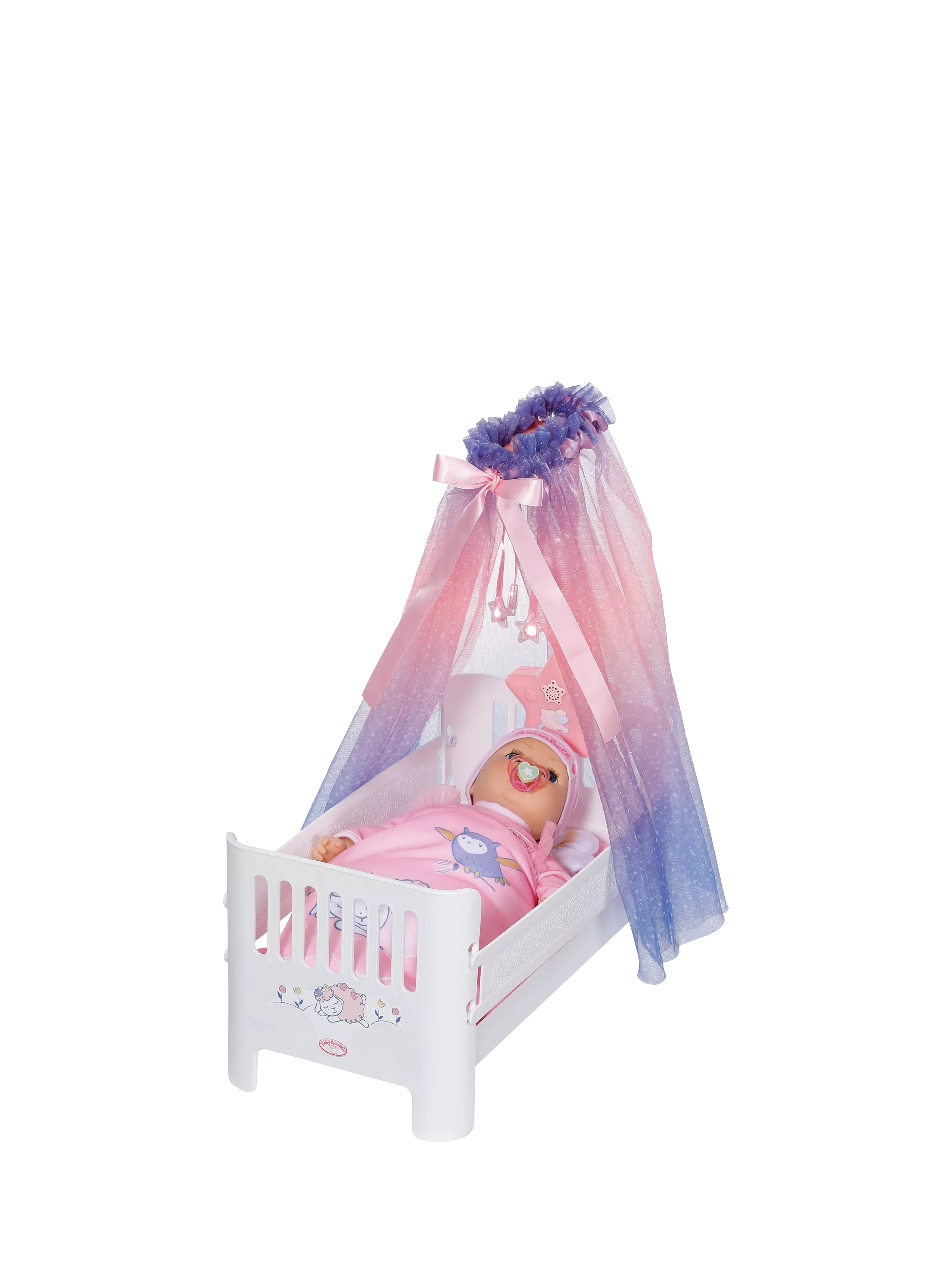 Introducing Baby Annabell’s new Sweet Dreams Bed! A magical place for doll babies to drift off to sleep with a soothing melody and starry night sky canopy.