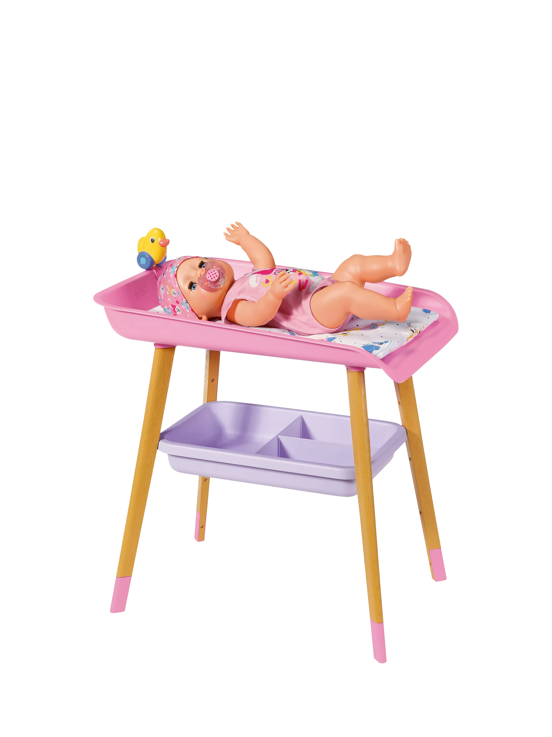 This gorgeously designed changing table is the perfect baby care accessory. With a changing mat and tissue dispenser, as well as wooden legs, it’s modern in design. It also has extra storage space underneath to keep all the essentials needed to keep Baby Born clean and content. Plus, her favourite duck sits on the changing table to keep her amused while your little one does the all-important nappy change!