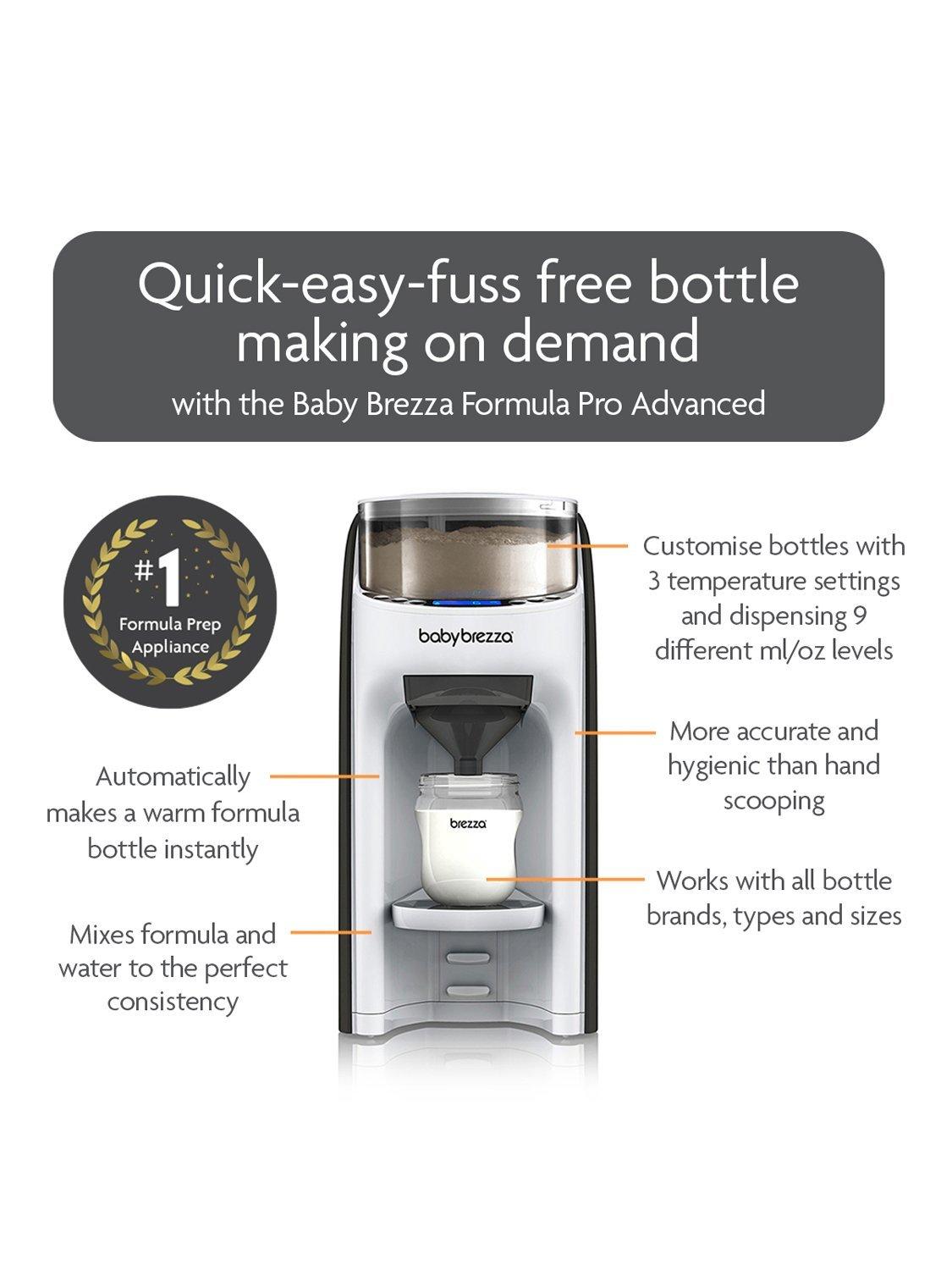 The Formula Pro Advanced makes your baby’s bottle with no messy measuring, no mixing, and no waiting for the water to be the correct temperature. Simply set the machine up then all it needs is a press of a button to make the bottle. You can customise the perfect bottle for your baby by choosing an amount of formula from 2-10oz in 1oz increments. Then there is a choice of 3 temperature settings (or water dispensing only). It works with virtually all brands of formula and all bottle brands and sizes.