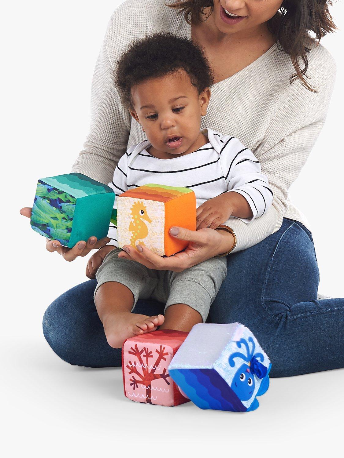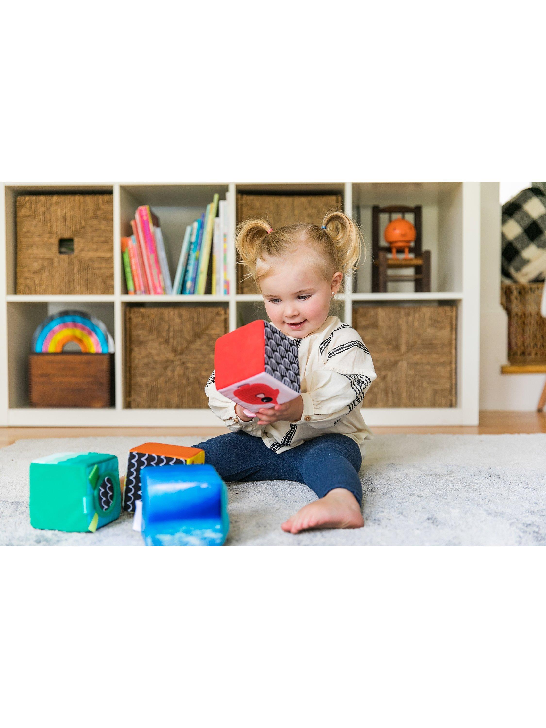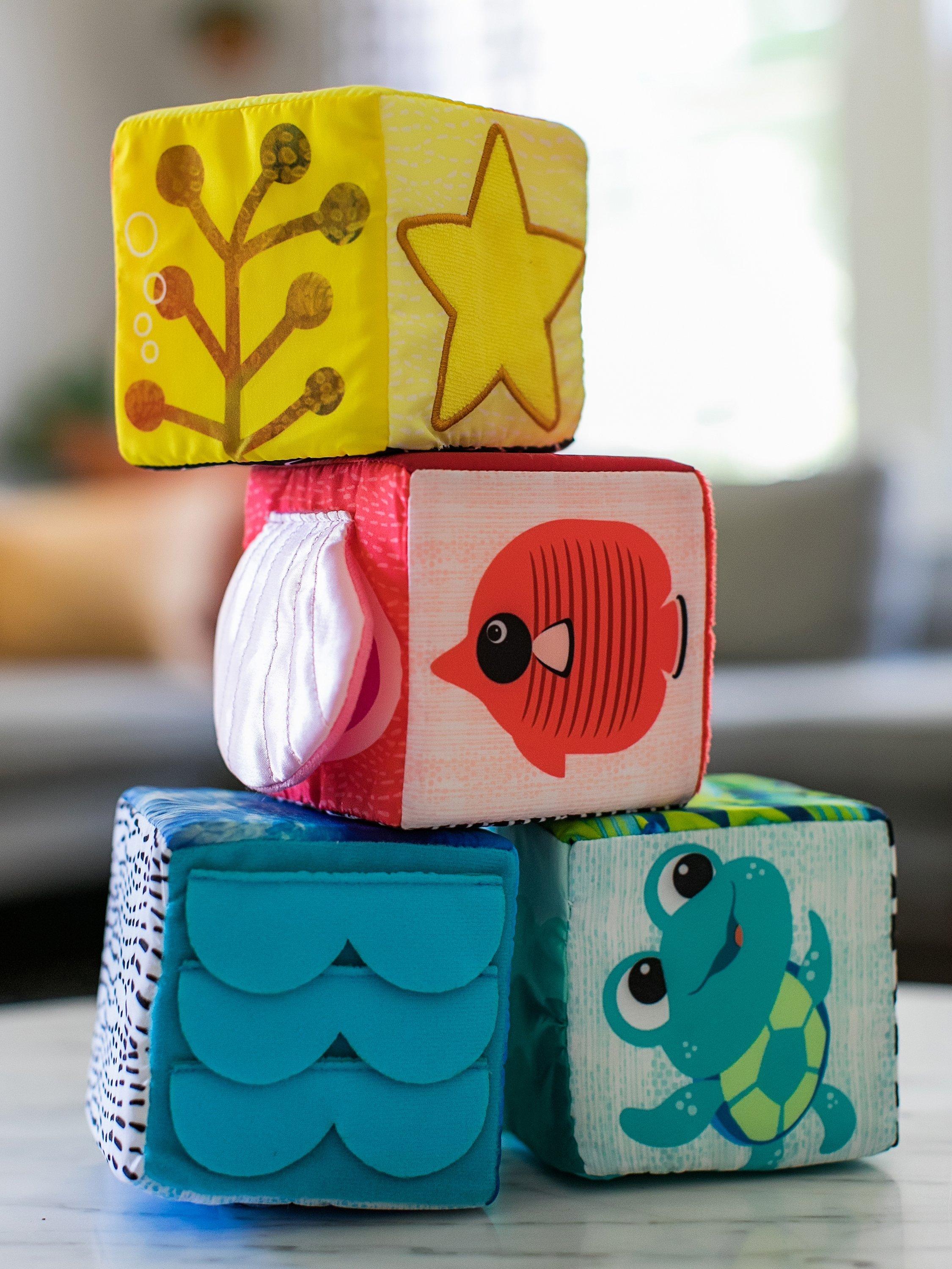 The Baby Einstein Explore & Discover Soft Blocks are made for little hands to squeeze, stack, toss and tumble. Each colourful block is a powerful discovery tool with multi-sensory activity that your baby will love. Discover the baby-safe mirror tucked under the peek-a-boo sun. Tug on the friendly frog’s leg and watch it spring back! These stacking toy blocks are made to engage and entertain baby, and their soft design makes this an ideal activity for quiet places. With this soft block toy set, baby will build a tower filled with fun and learning.