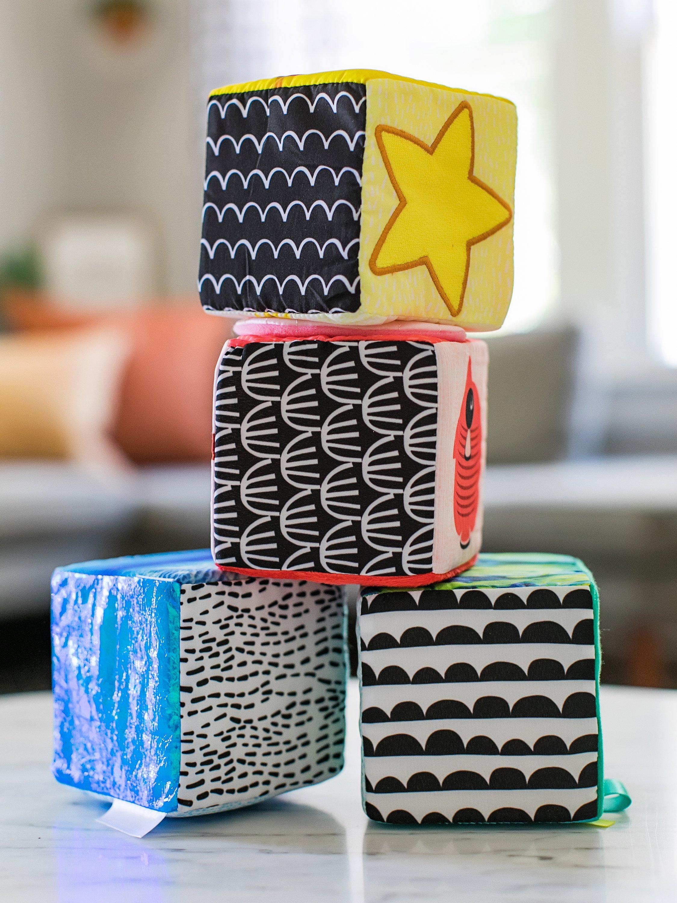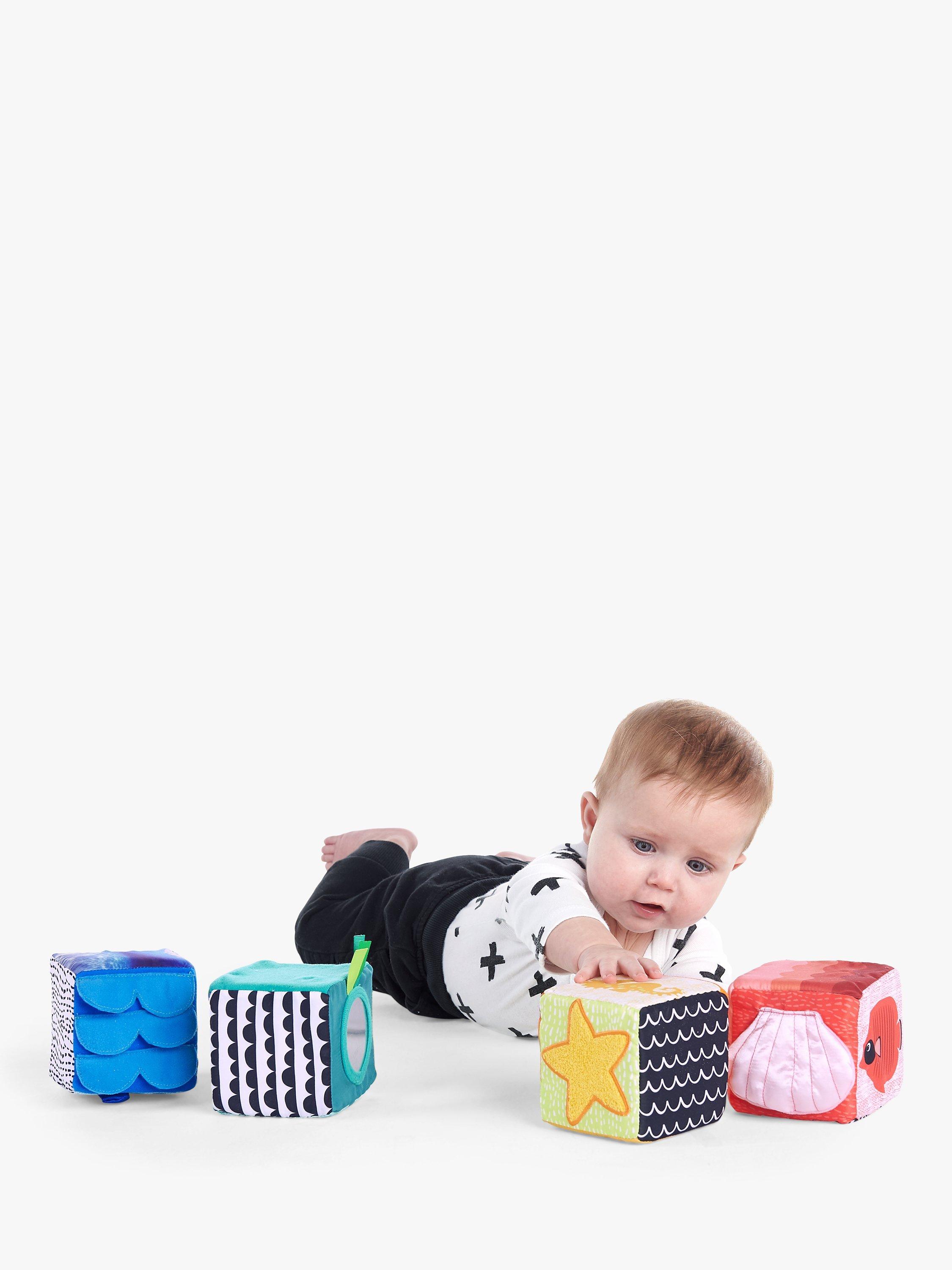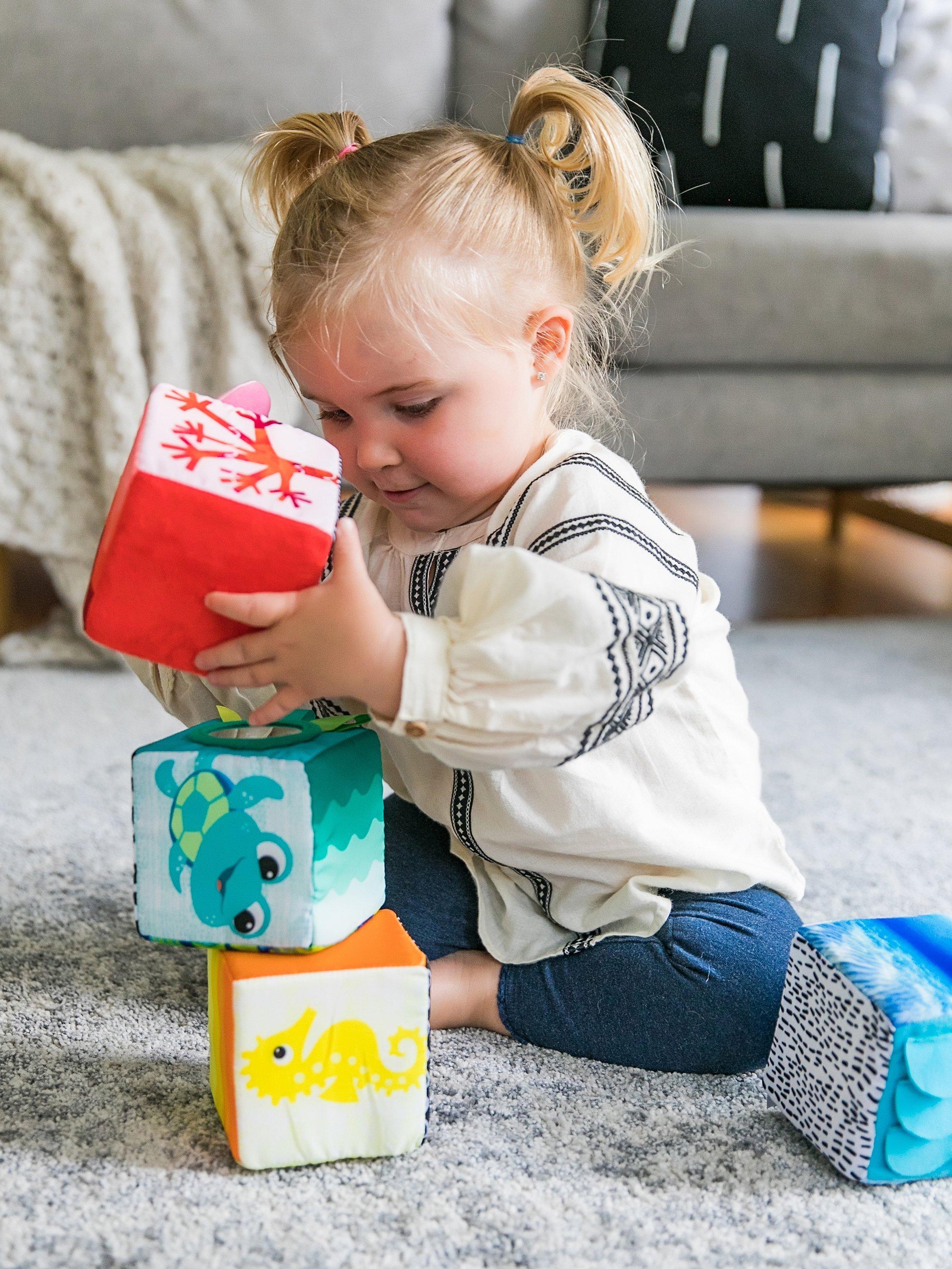 The Baby Einstein Explore & Discover Soft Blocks are made for little hands to squeeze, stack, toss and tumble. Each colourful block is a powerful discovery tool with multi-sensory activity that your baby will love. Discover the baby-safe mirror tucked under the peek-a-boo sun. Tug on the friendly frog’s leg and watch it spring back! These stacking toy blocks are made to engage and entertain baby, and their soft design makes this an ideal activity for quiet places. With this soft block toy set, baby will build a tower filled with fun and learning.