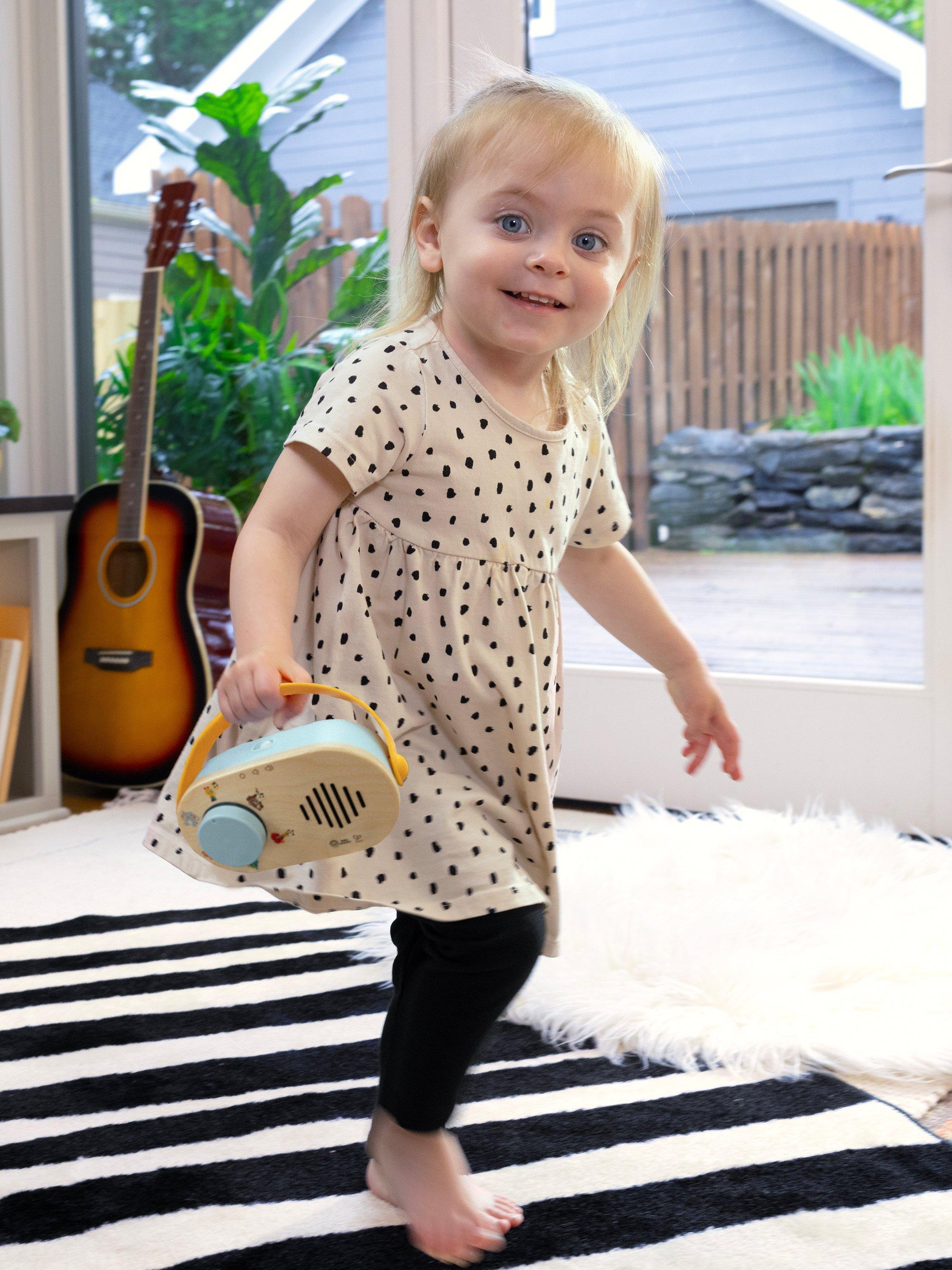 This Montessori-inspired toy radio encourages baby to explore new sounds as they twist and press the dial. Small and easy to grasp, the radio features a classic design and a flexible strap to help baby take discovery on the go. Features low and high volume levels for baby’s comfort and parent's peace of mind.