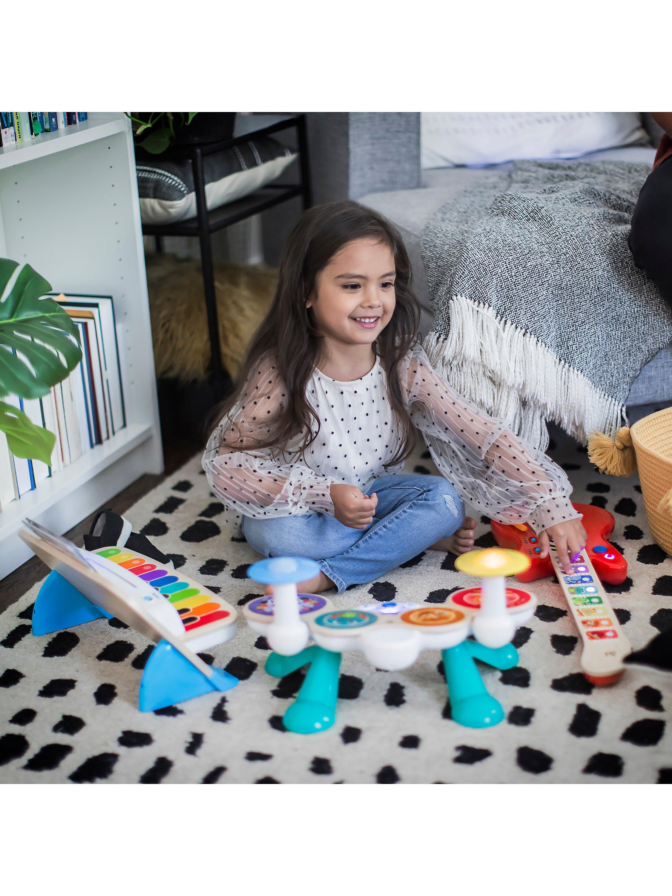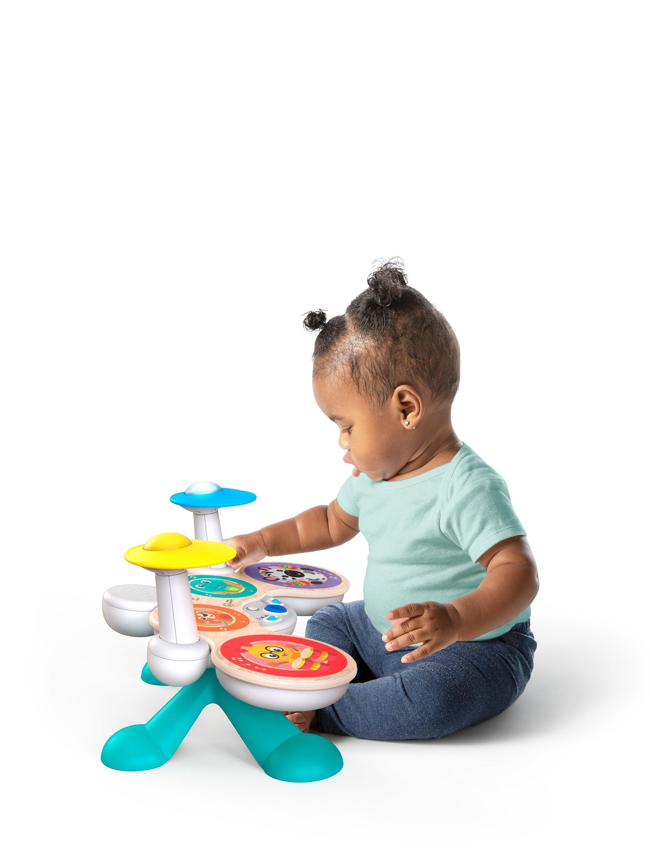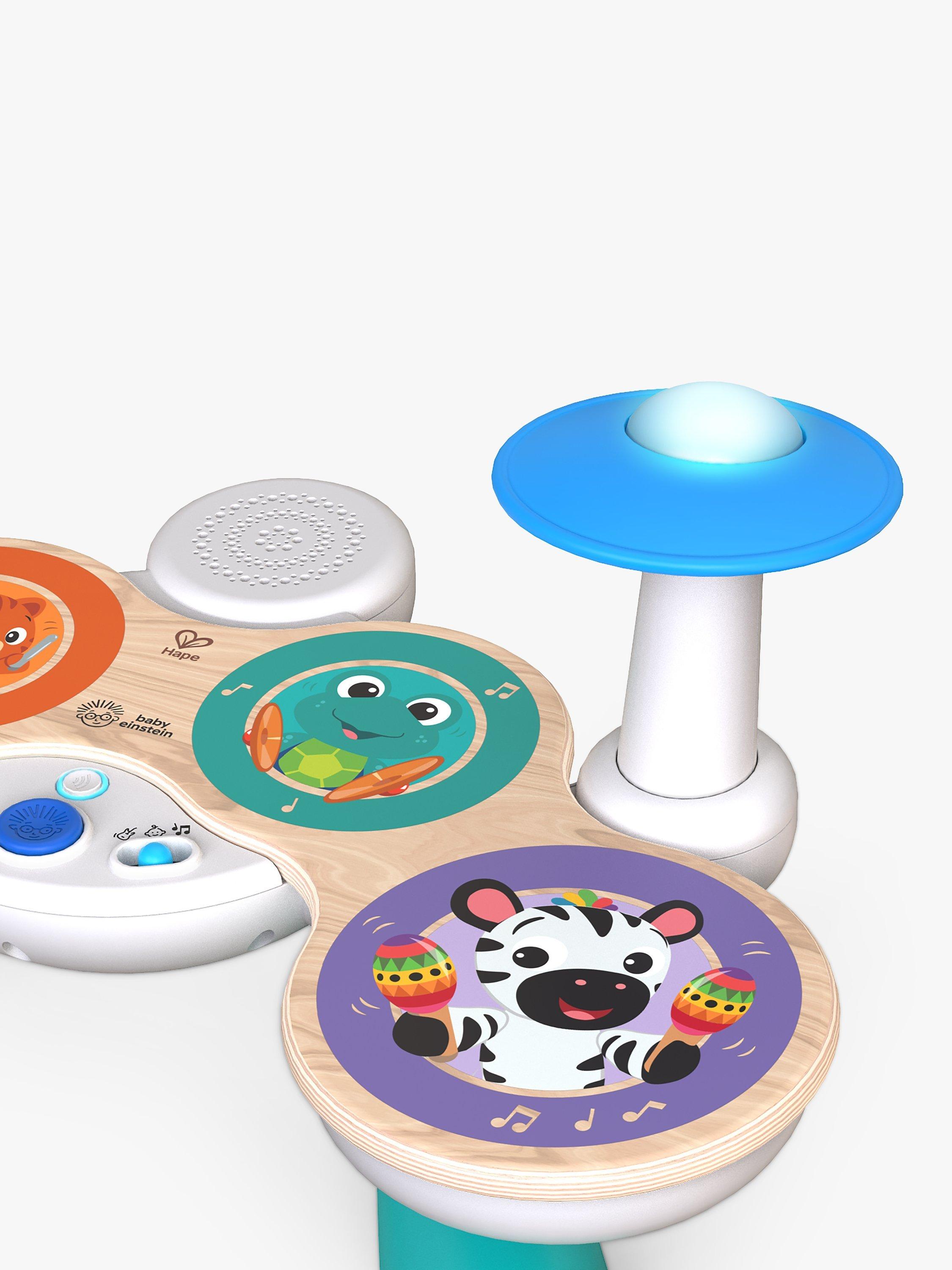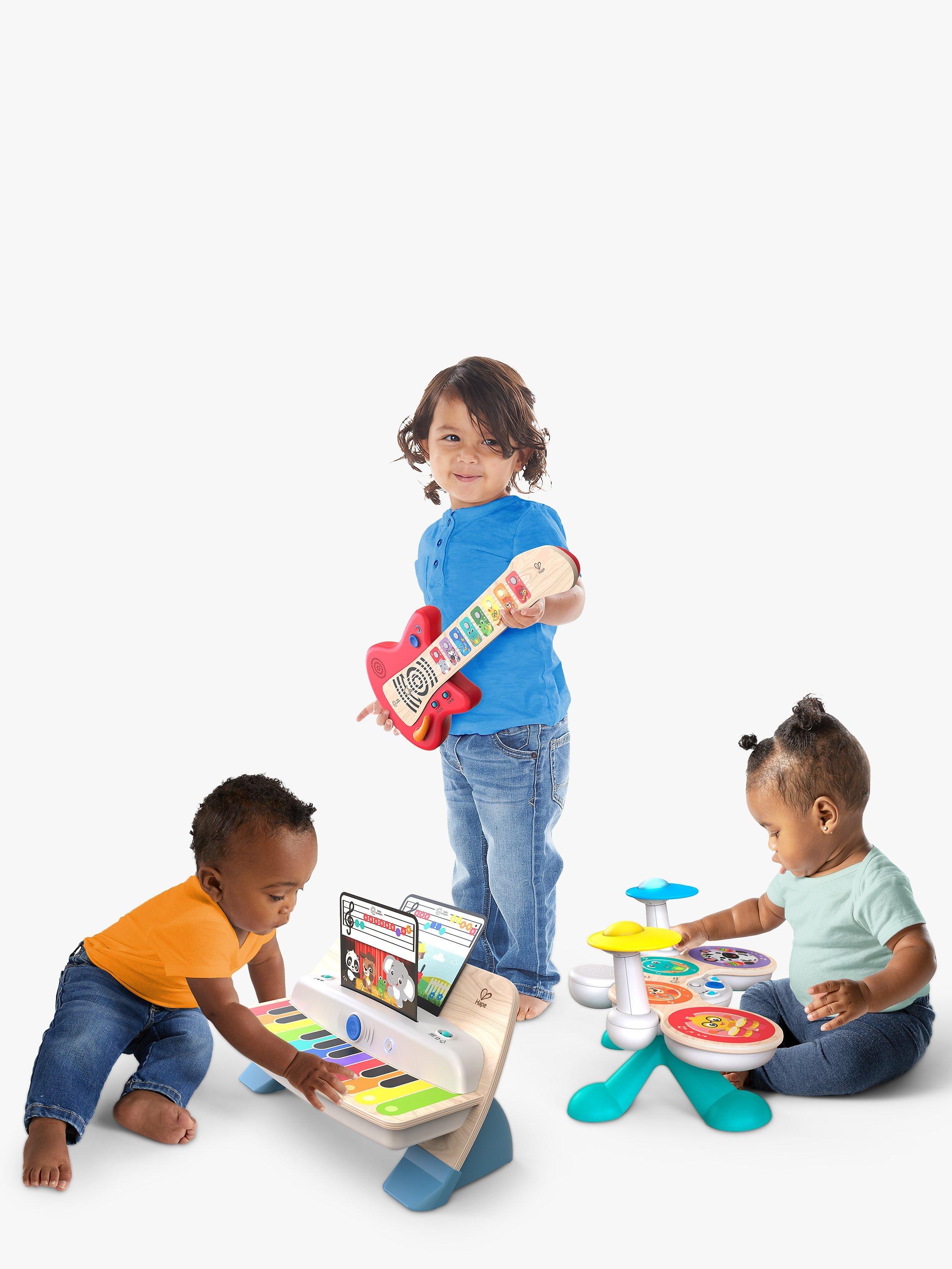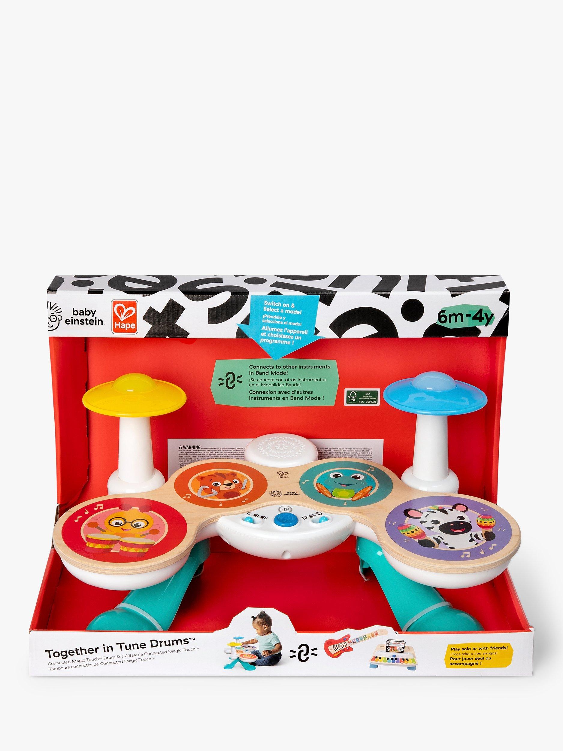 The safe wireless link between the drum set, piano, and guitar (sold separately) works like a walkie talkie, via radio signals. A collaboration between Hape™ and Baby Einstein™, this child-safe toy drum set encourages the development of fine motor skills. Magic Touch™ technology combines the durability and keepsake value of a classic wooden toy with today’s latest musical toy technology. Even the gentlest tap on the painted drum pads makes real drum sounds. Featuring 4 modes (Discover Mode; Perform Mode; Playful Mode; Band Mode) and 10 popular melodies, the drum toy gives baby the freedom to create their own beats, layer riffs and silly sounds, and master their favourite songs. If you’re looking for a musical cause and effect toy to gift at a baby shower or first birthday, this is the perfect one.