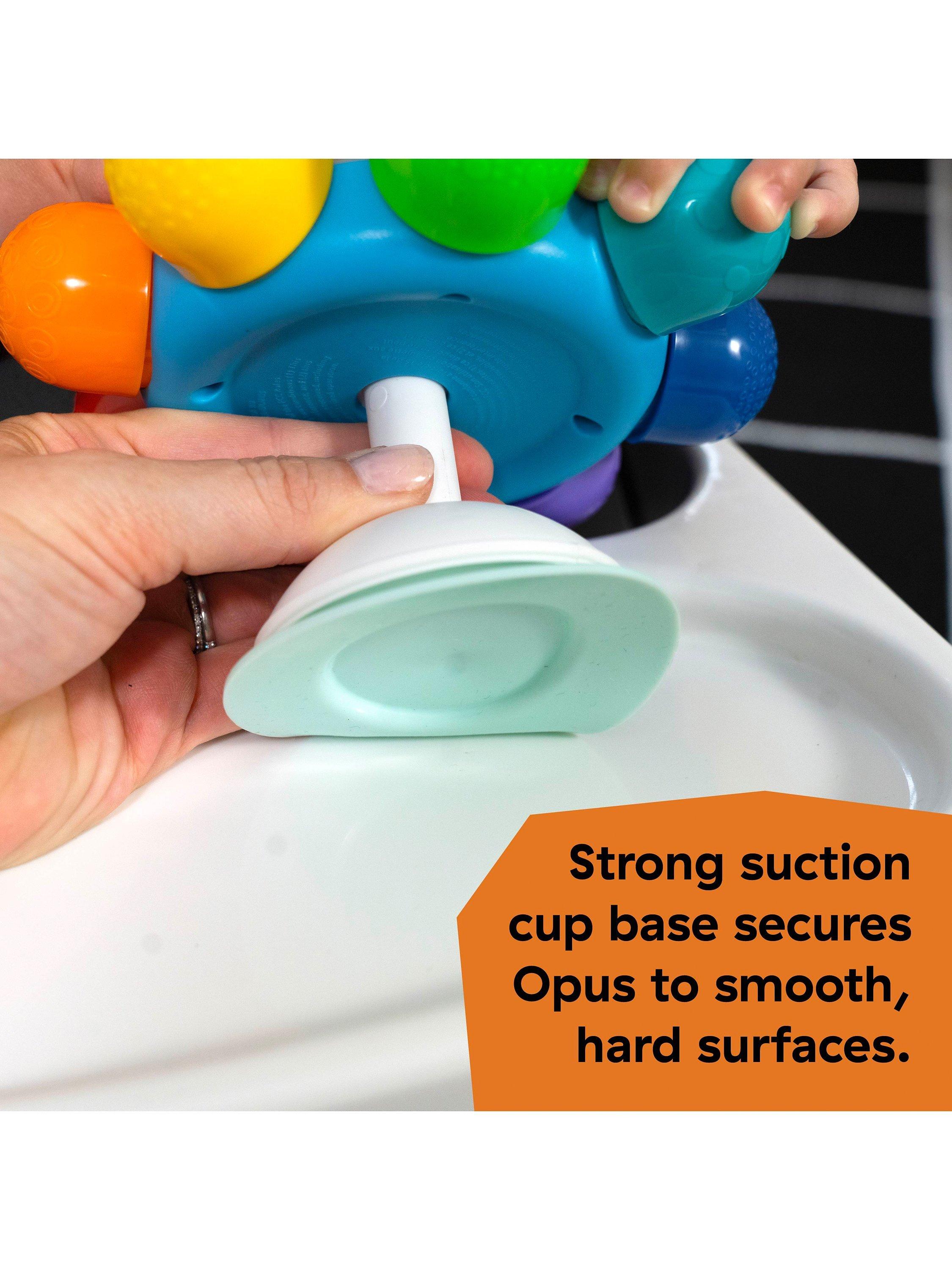 A strong suction cup base secures Opus to most smooth, hard surfaces, helping baby press, spin, and learn at home or on the go. It features Opus the Octopus from Baby Einstein Ocean Explorers programming. The toy wipes clean easily and requires 3 AAA batteries that are included.