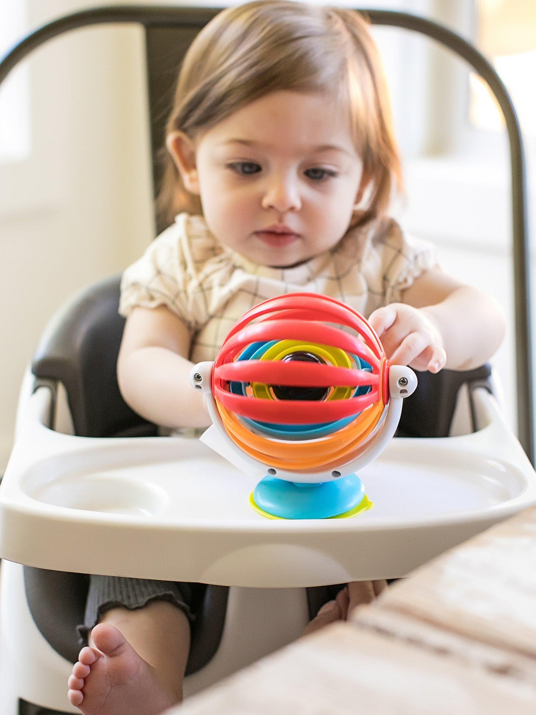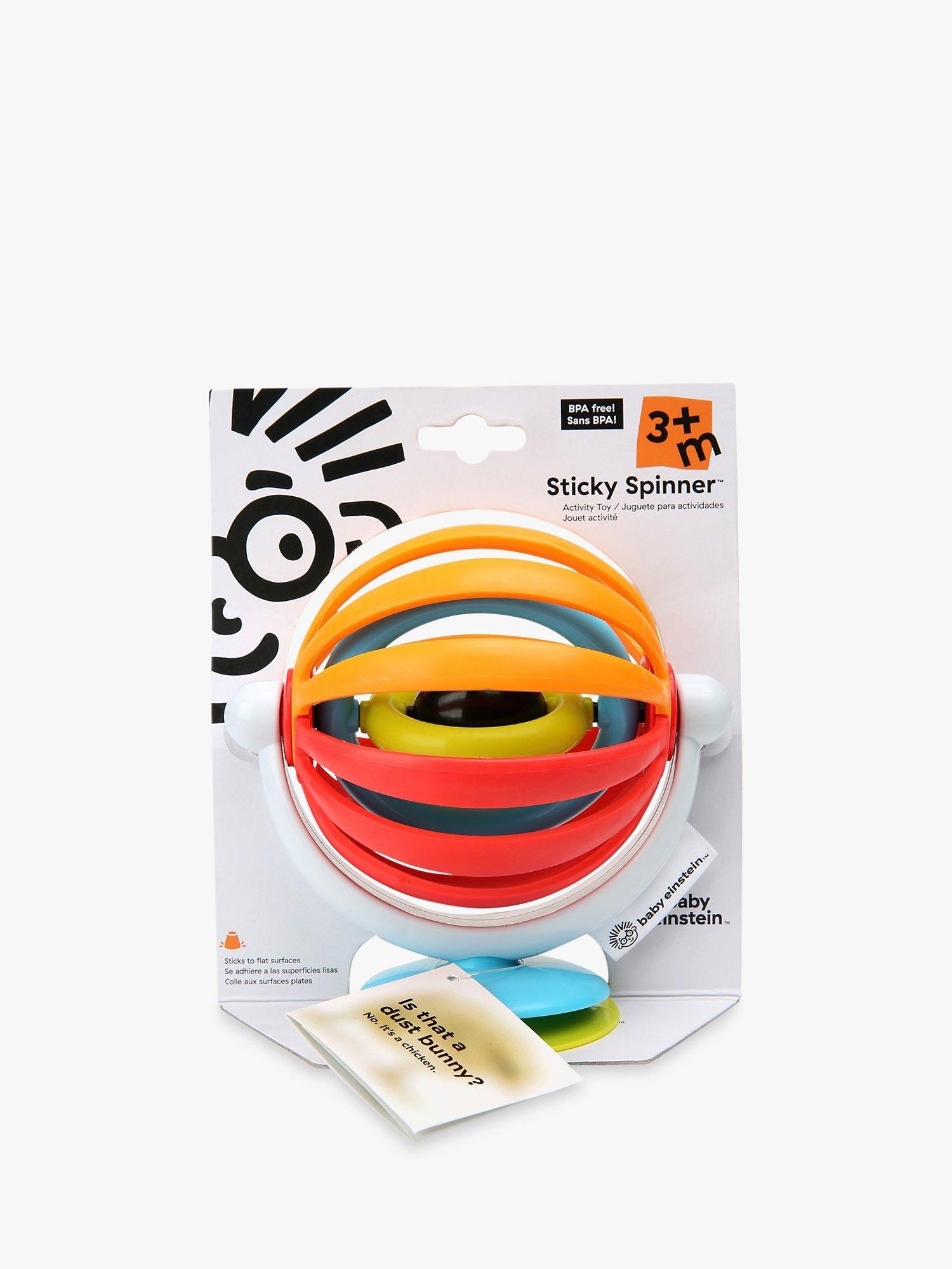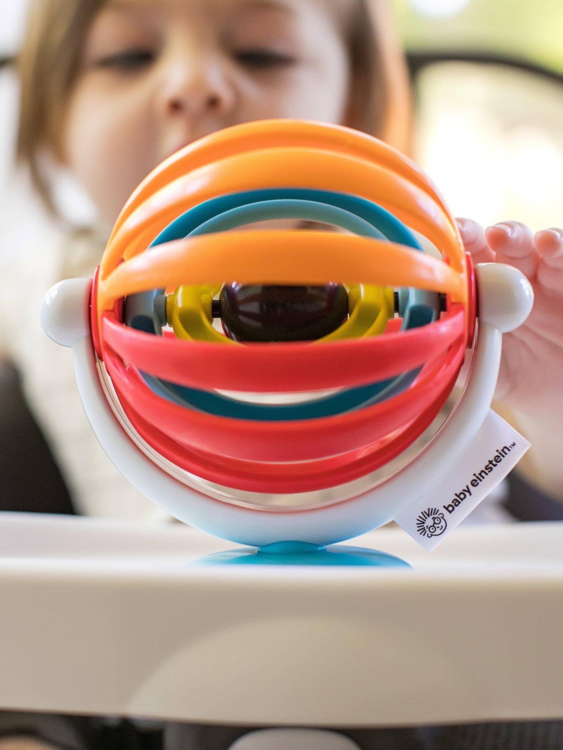 From mealtime to travel time, your baby will be utterly captivated by Baby Einstein’s Sticky Spinner toy. As this table toy spins and swirls, the brightly coloured loops will whip up a visually stimulating experience. See baby focus as he curiously watches the inner-ball and loops spin in opposite directions. Those colourful bands are fun to grab and spin, which will help encourage hand-eye coordination and fine motor skills.