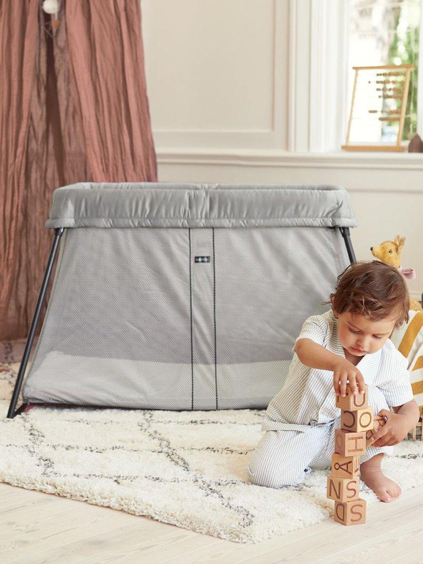 The travel cot only weighs 6 kilos and has no loose parts that need to be attached. The built-in base keeps the cot standing firmly on the floor. Plus it's easy to move around your home and is convenient to take with you on trips or overnight visits to family and friends.