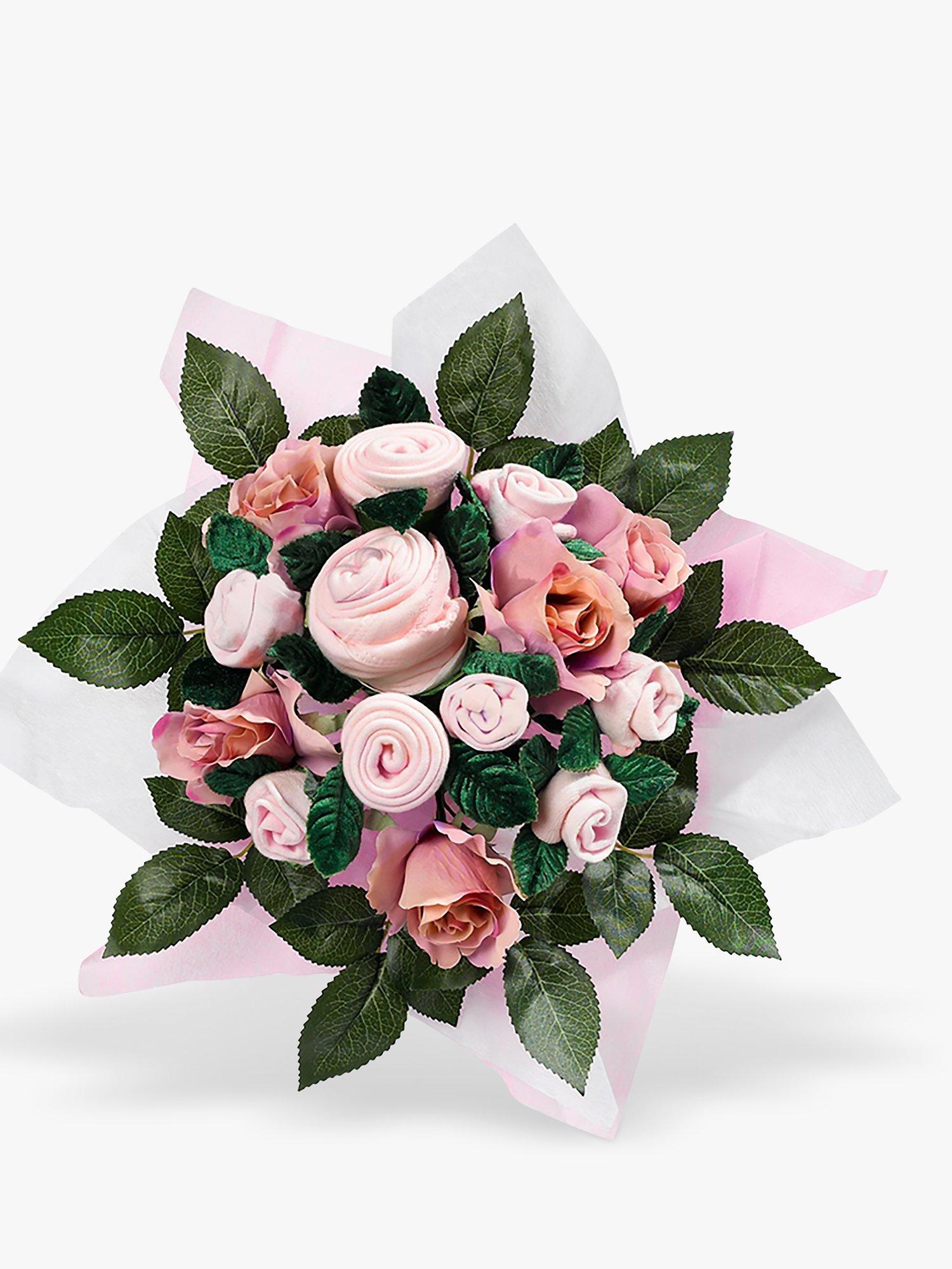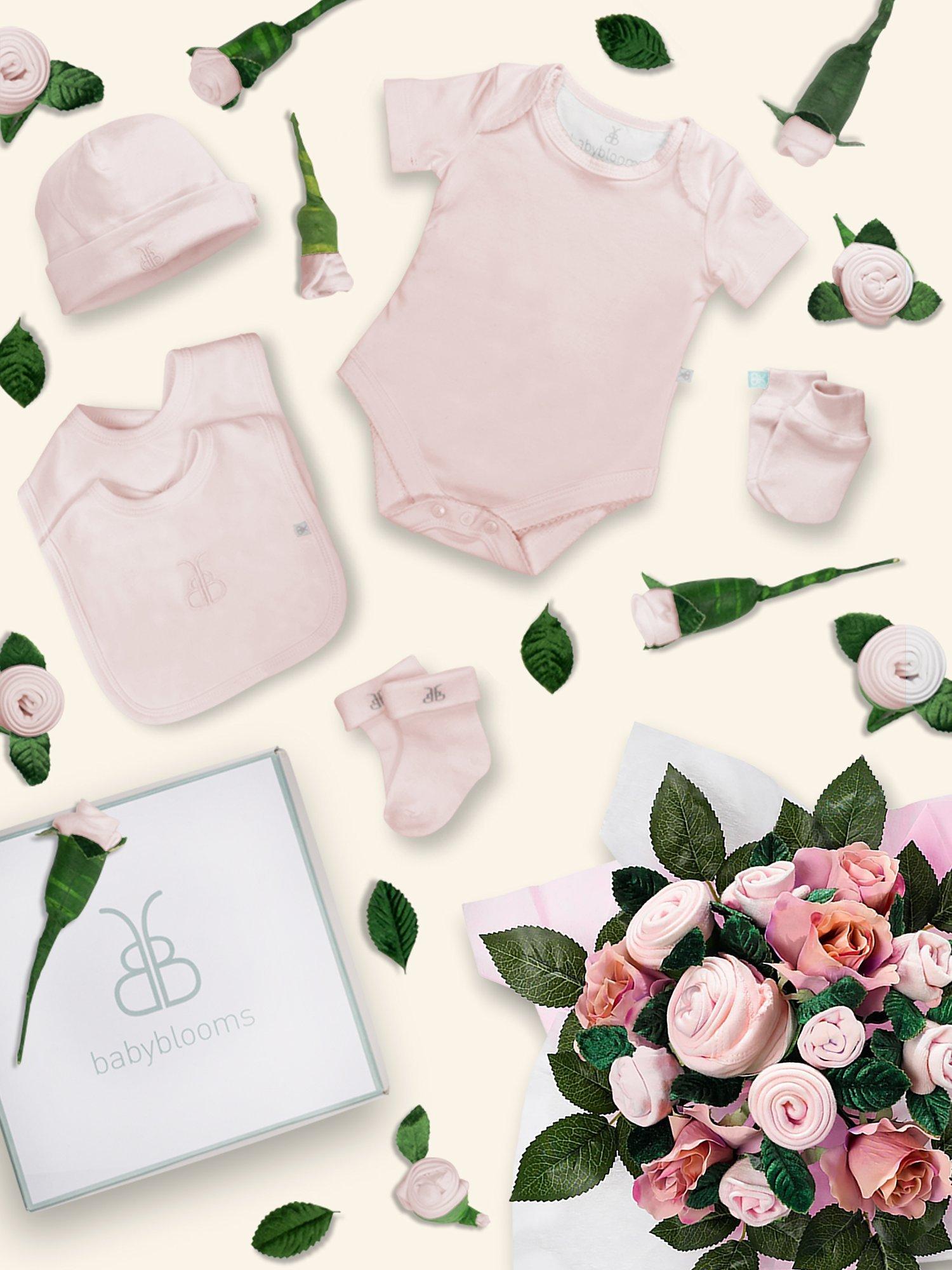 Beautiful and practical, this baby clothes bouquet from Babyblooms makes for a lovely gift for a new mum and baby. With a selection of soft cotton baby clothes, cleverly rolled to resemble a bouquet of flowers, the baby garments are interspersed with delicate silk roses which can be kept by the parents as a lasting keepsake.