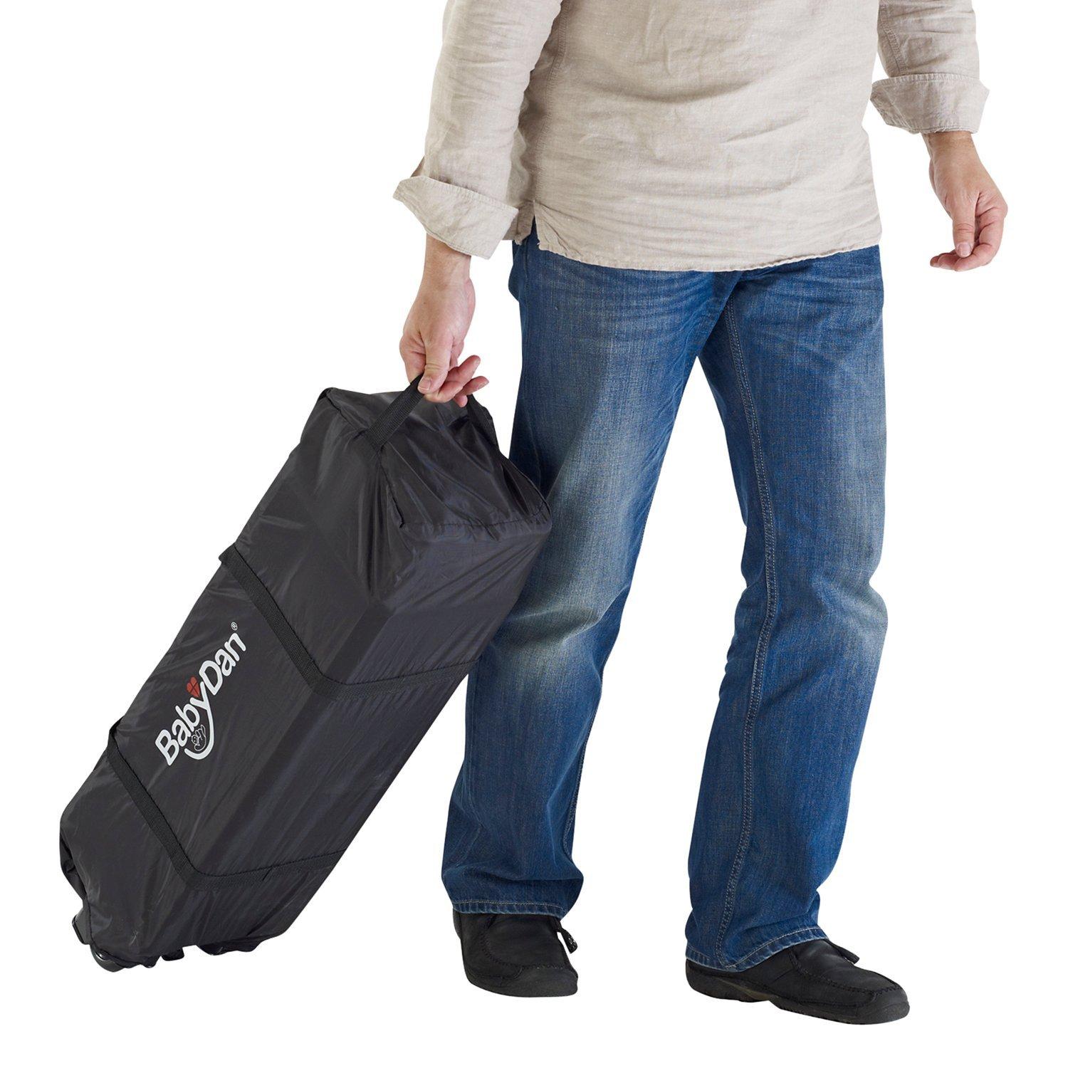 The BabyDan travel cot is a full size, spacious cot measuring 120 x 78 x 60cm. The cot comes complete with a padded mattress and travel bag so it can easily be transported. The travel cot features a large storage pouch and clear sides so it can be used as a play pen.