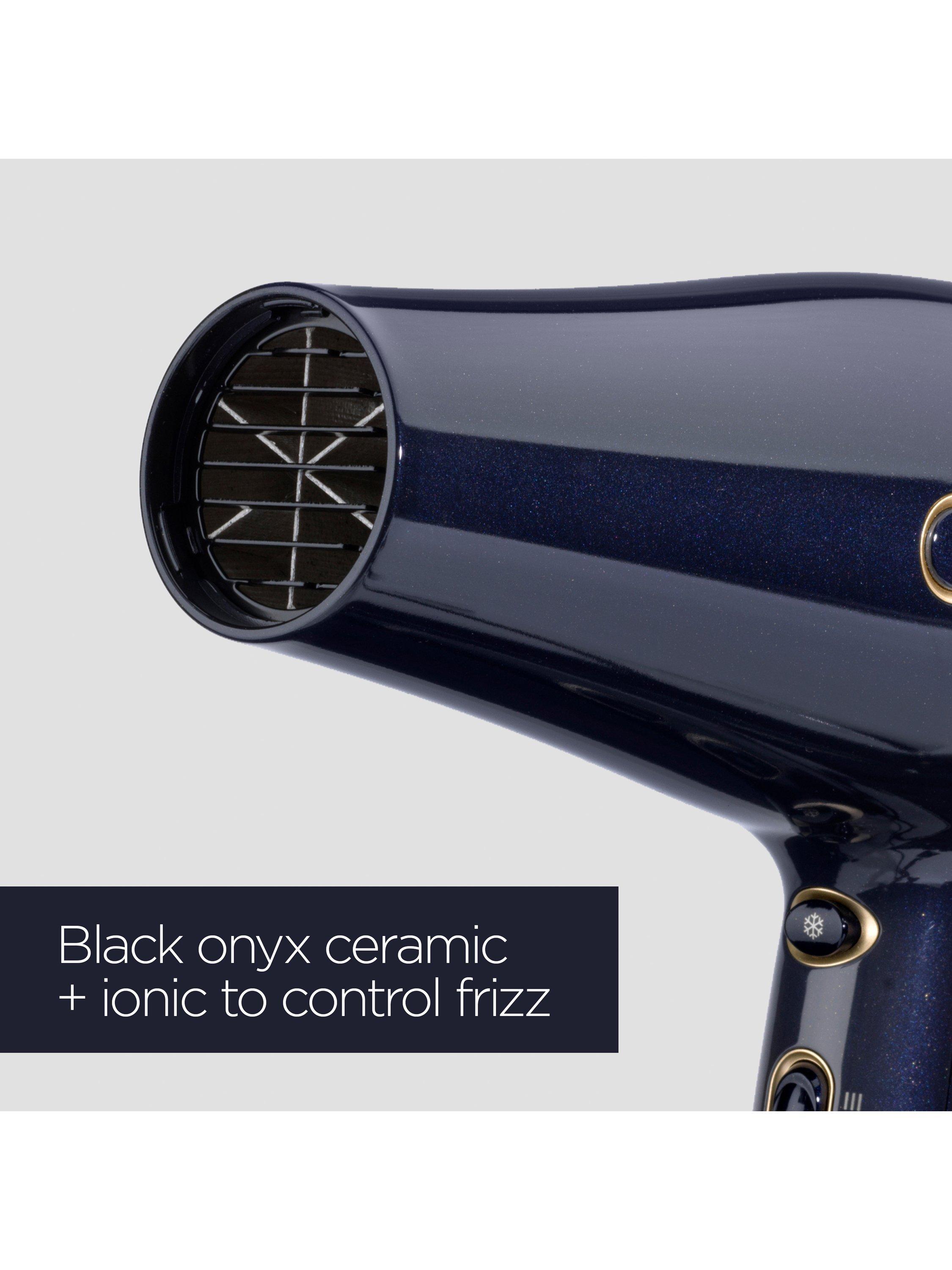 With a salon-grade AC motor producing a super-fast airflow and a top setting of 2400W it delivers high-speed drying even on thicker hair. Ionic technology with black onyx infused ceramic controls frizz and leaves hair ultra smooth with a beautifully shiny finish.