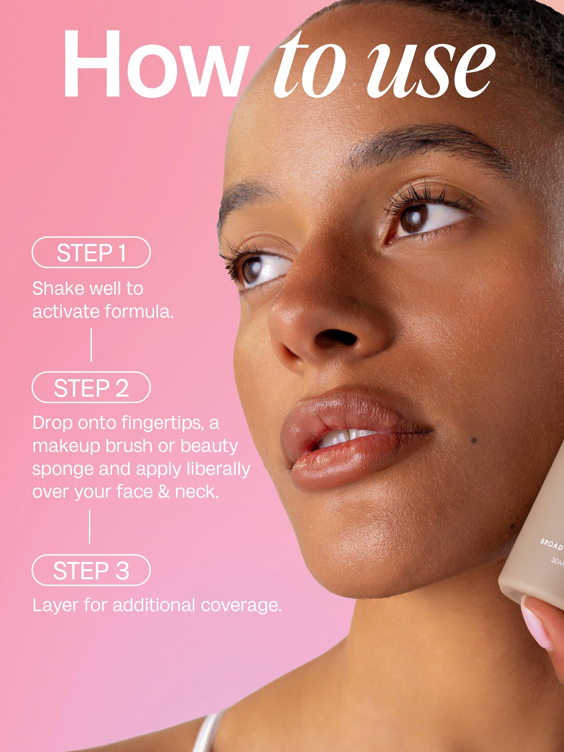Shake well to activate the formula. Drop onto fingertips, a makeup brush or a beauty sponge and apply liberally over your face and neck. Layer for additional coverage.