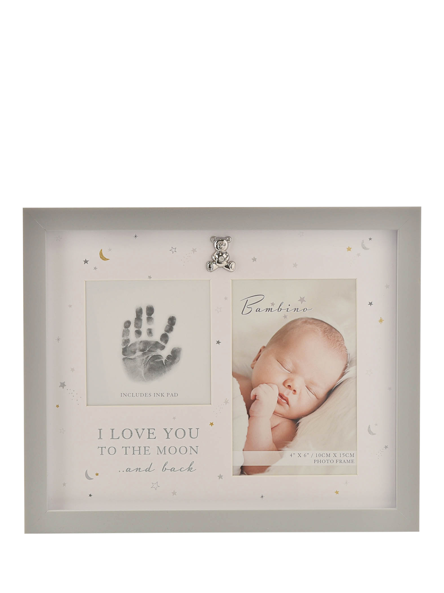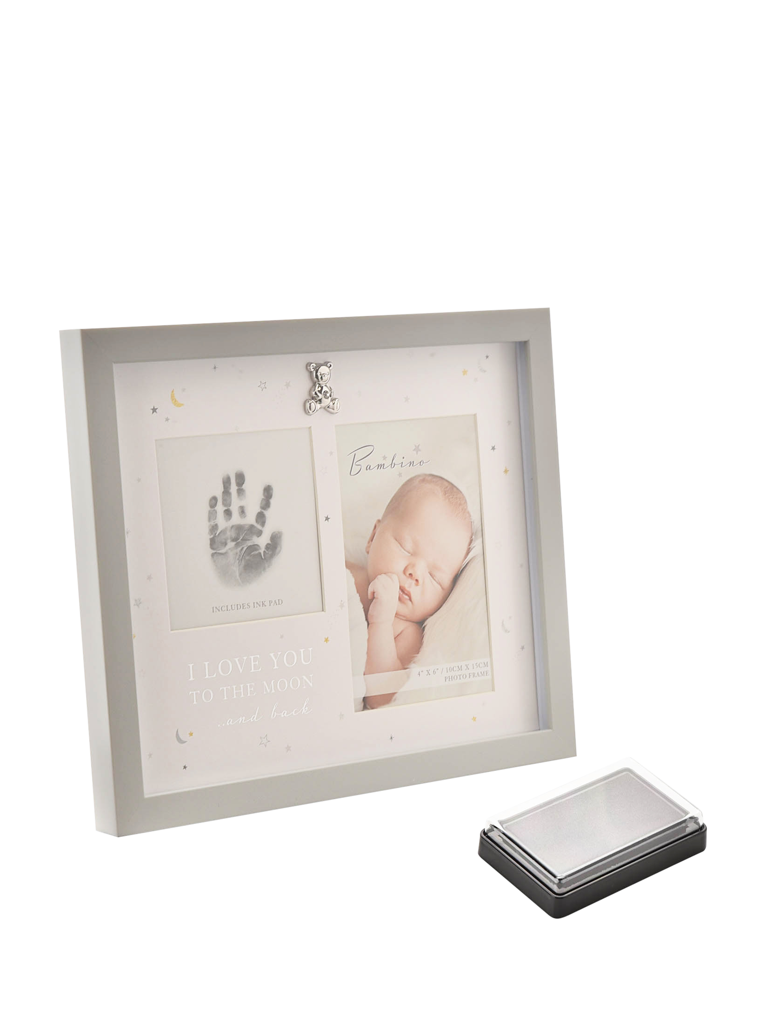 A handprint frame with ink pad from BAMBINO BY JULIANA®. This heart-warming frame captures the perfect print of little hands, which will last forever. The wooden frame has a matt white finish, complete with decorative mount and crystal-encrusted, silver-plated teddy bear icon. It features two apertures which can be displayed either freestanding or upon the wall: one portrait, to present a baby photo and one square, for presenting an ink print of a hand using the kit provided. The frame is packaged in a branded closed box.