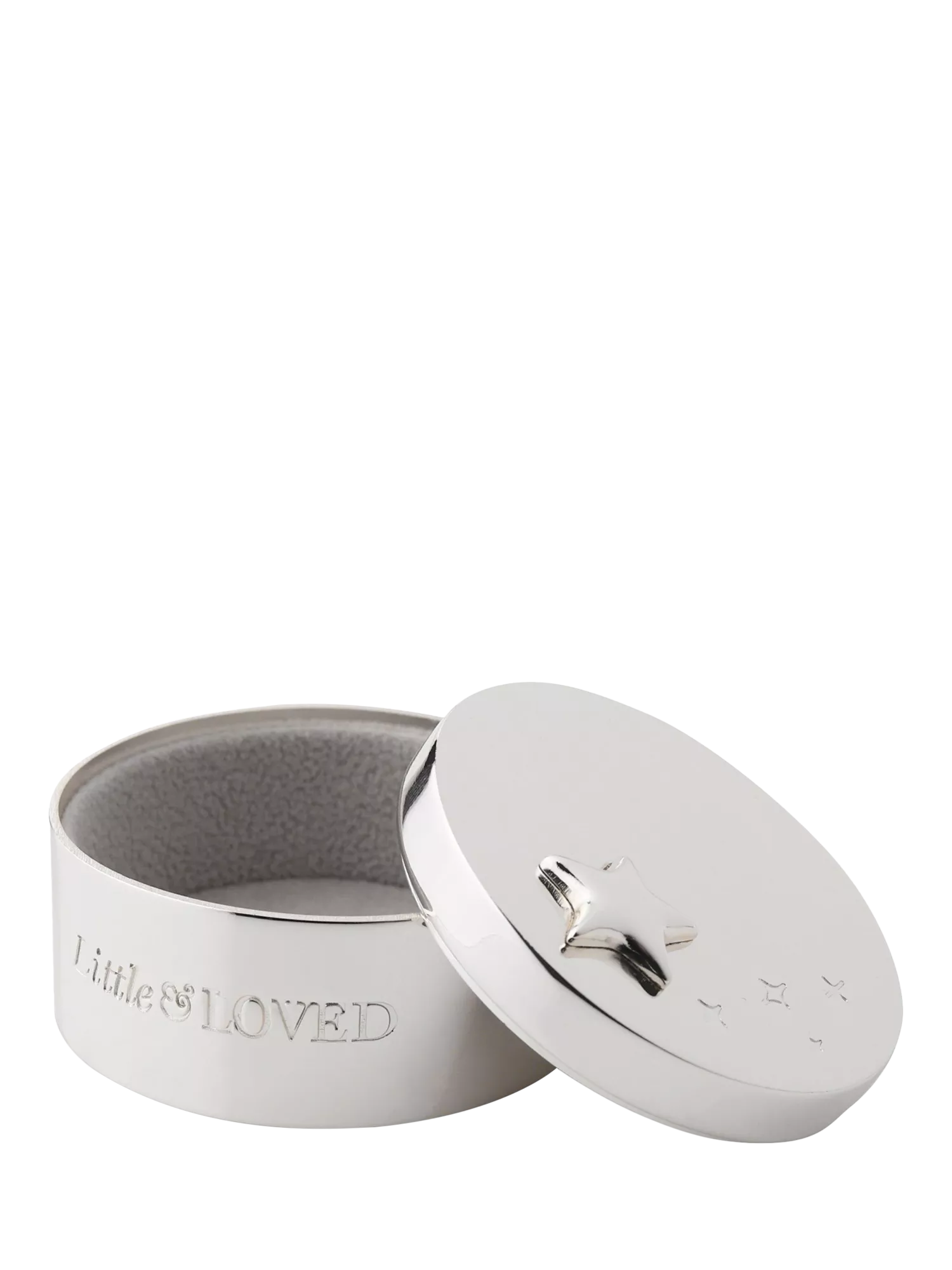 Introducing the Bambino Silver-Plated Little & Loved Keepsake Box by Juliana® - a charming and elegant addition to a child's nursery. The compact and cylindrical design makes it an ideal choice for storing the most precious moments. On the side you'll find a heartfelt engraving that reads 'Little & LOVED'. The shiny silver-plated exterior enhances the durability and gives this box an attractive look.