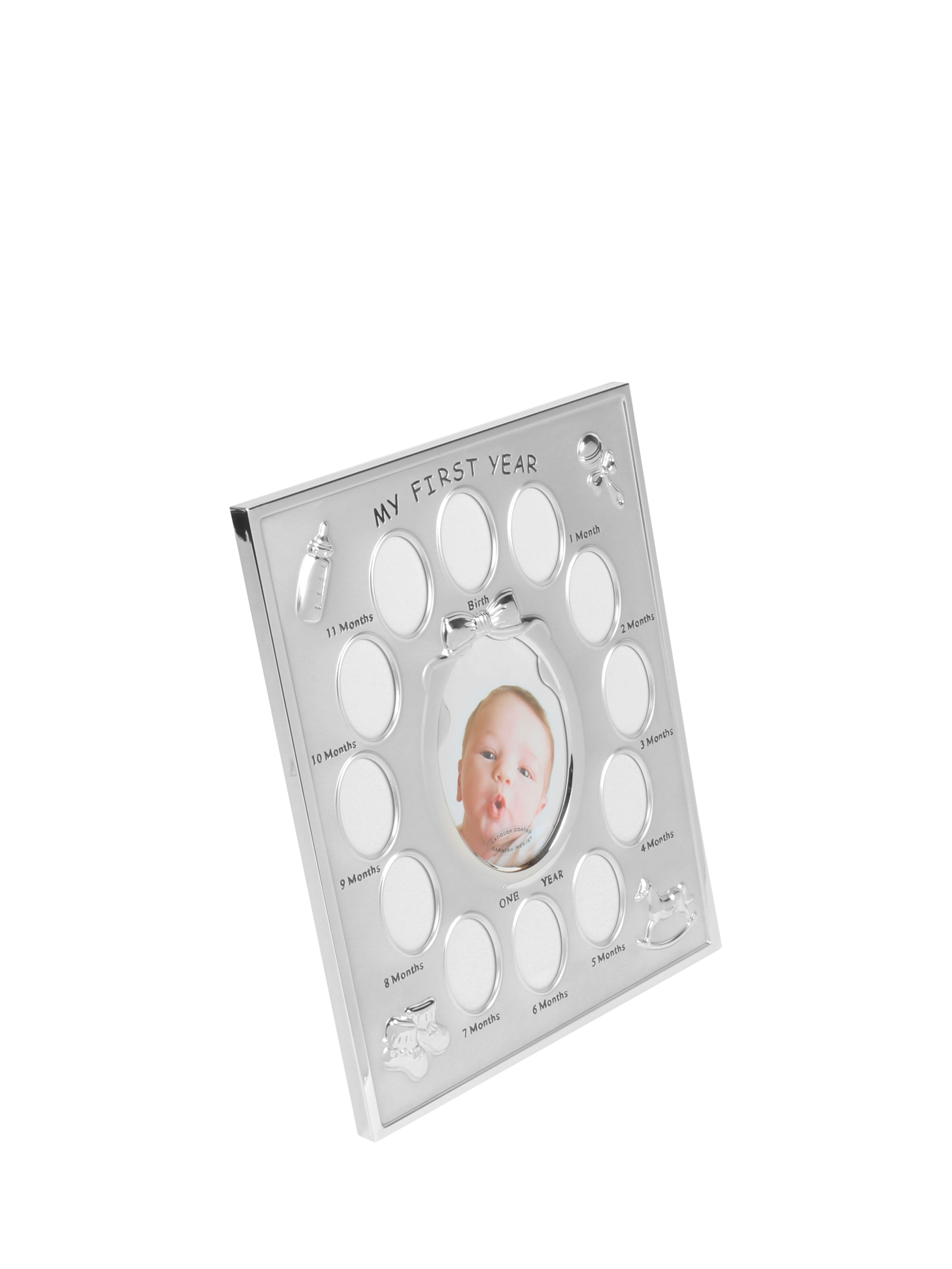 A gorgeous 'My First Year' photo frame with 13 apertures. Every parent loves to cherish the memory of their baby's first year, and with this gorgeous photo frame they can do just that. The months go by too quickly but this beautiful silver-plated frame displays 12 monthly inserts from birth and a large aperture for a general photo. With a matt and shiny finish the frame is supported by an easel-style strut.