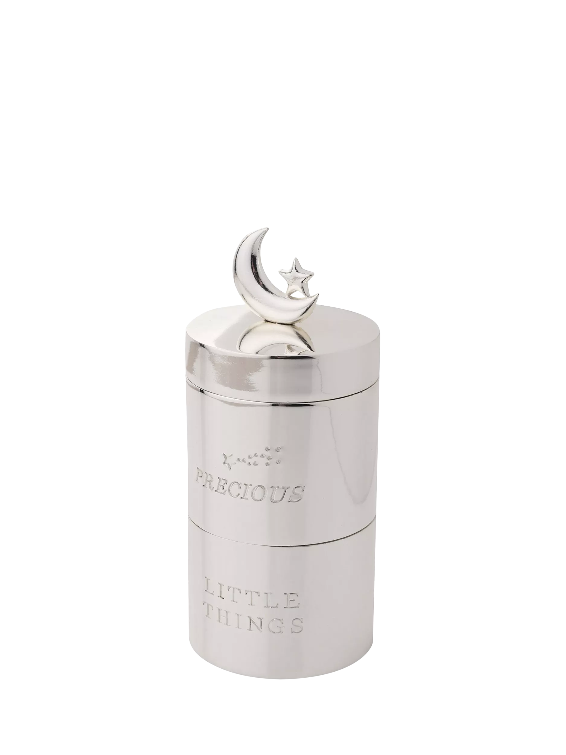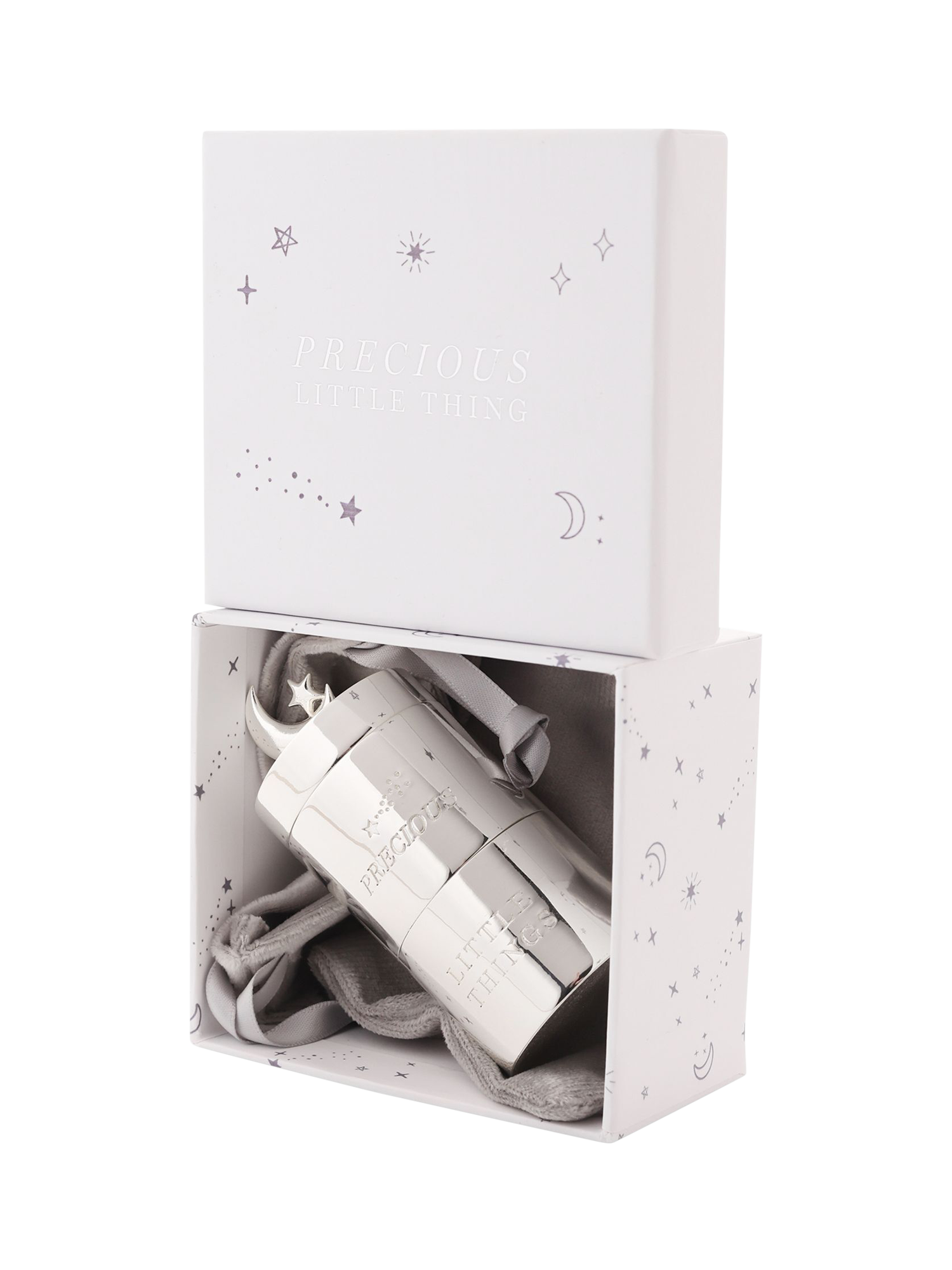 The compact and cylindrical design makes it an ideal choice for storing the most precious of moments. On the side, you'll find a heartfelt engraving that reads 'precious little things,' encapsulating the sentimentality of the cherished memories stored within. The shiny silver-plated exterior enhances the durability and look.
