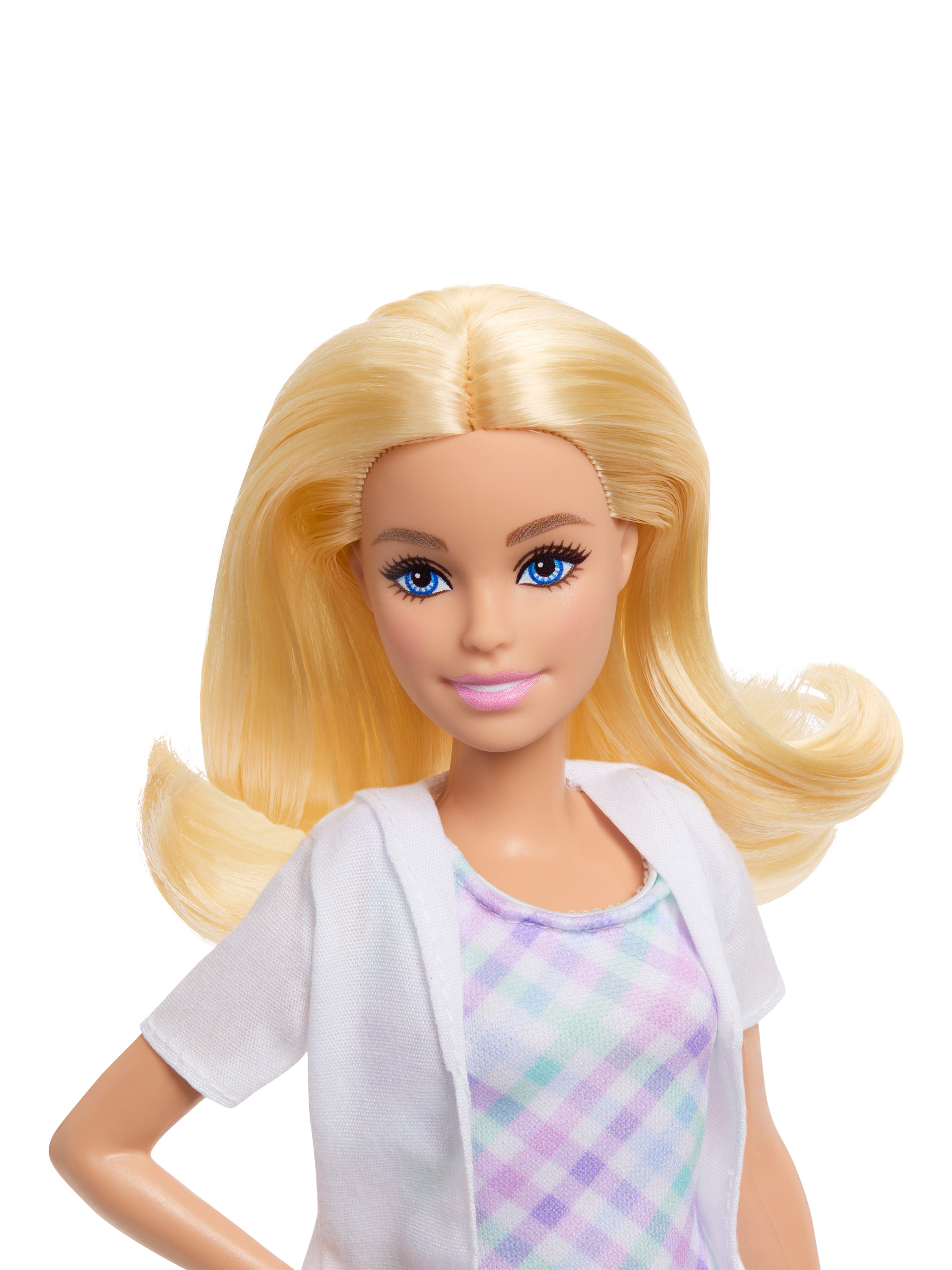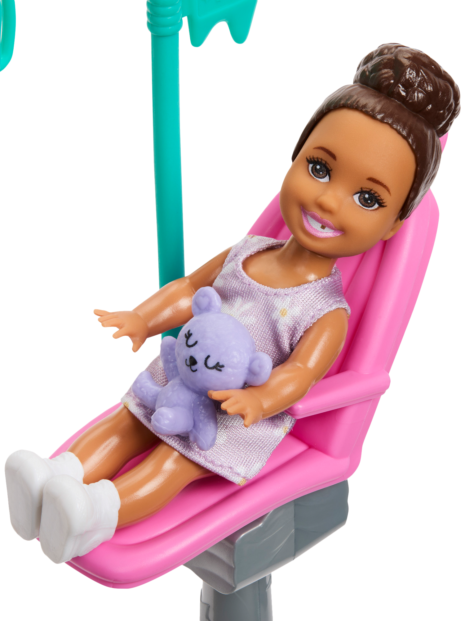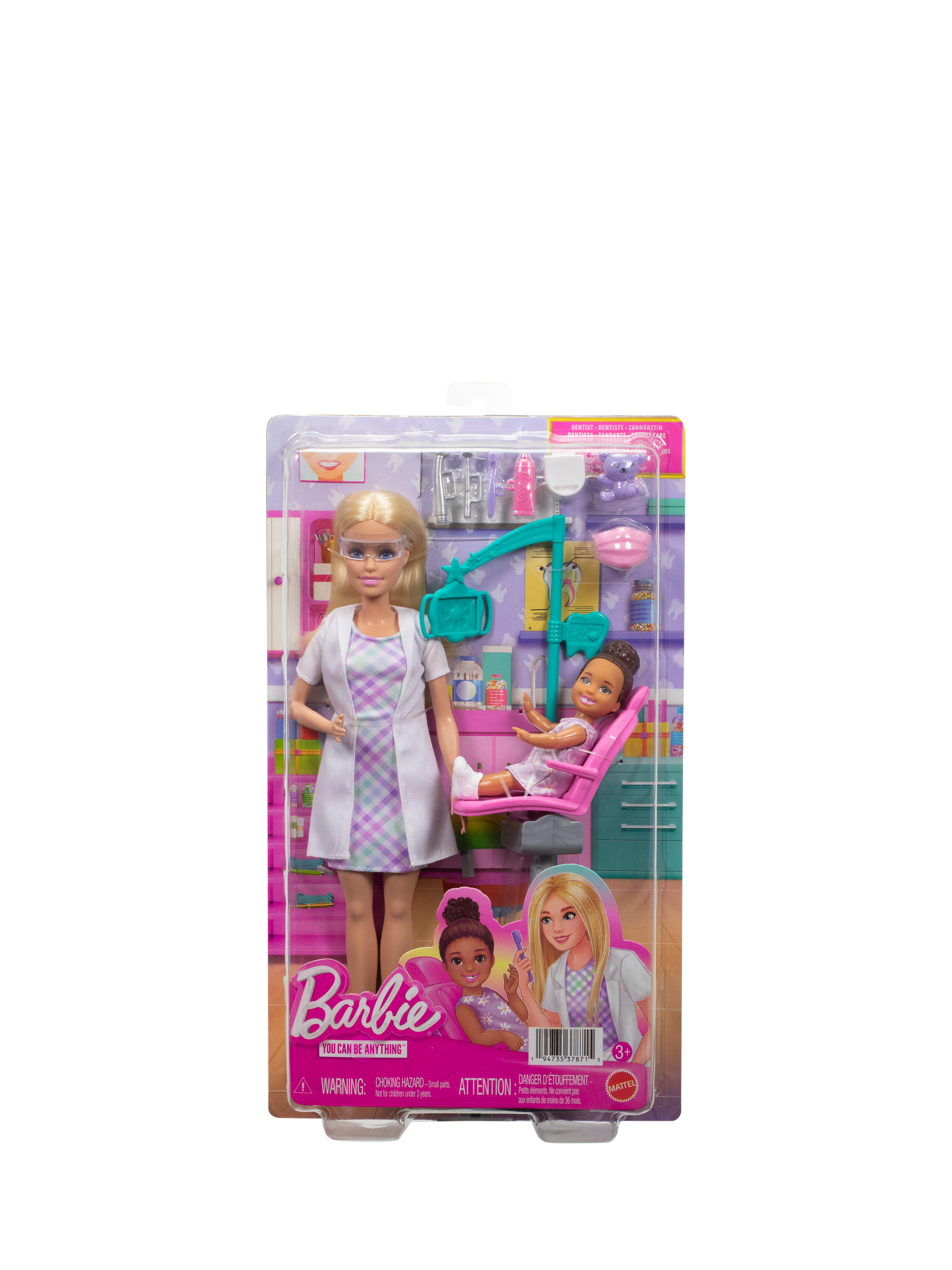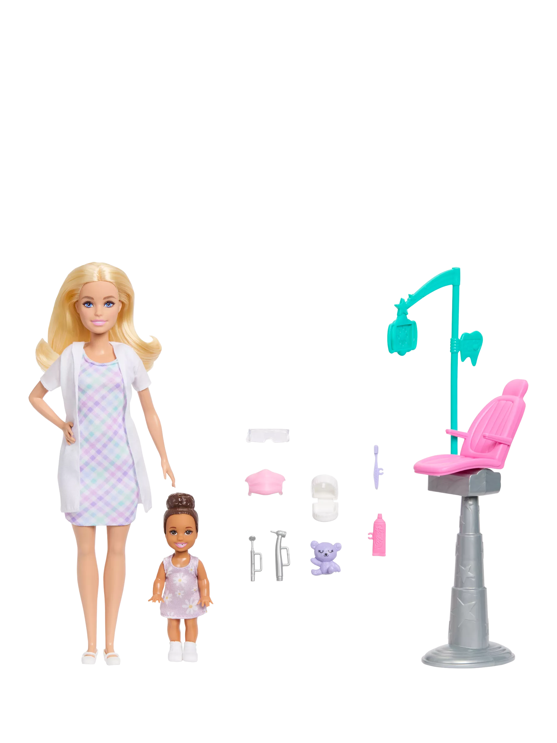 Includes Barbie doll wearing removable white coat, dress and shoes, plus 1 toddler doll, 1 examination chair, 2 tools, 1 toothbrush, 1 tube of toothpaste, 1 mask, 1 pair of glasses, 1 teddy bear and 1 set of model teeth.