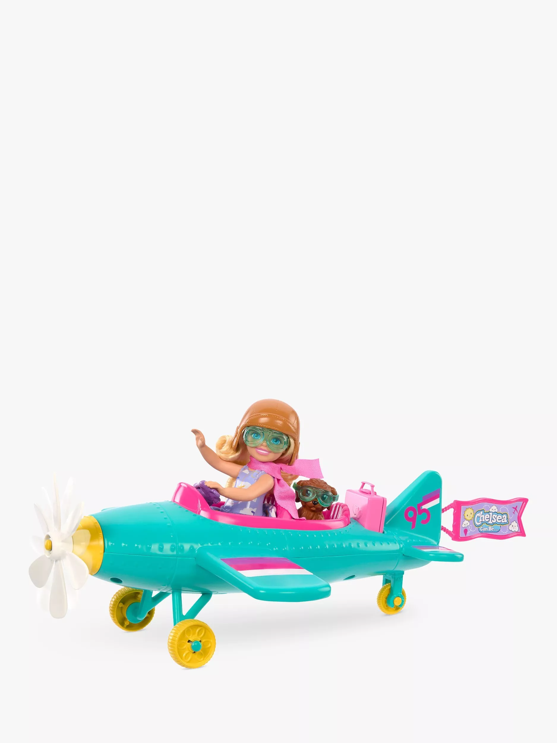 The Chelsea pilot doll is ready to take off with a two-seater plane perfect for her and her puppy push the aircraft on its wheels, spin the daisy-shaped propellor, then lift up and let the imaginations fly! Themed accessories, like luggage and stickers, encourage young minds to travel during playtime and explore a world of possibilities.