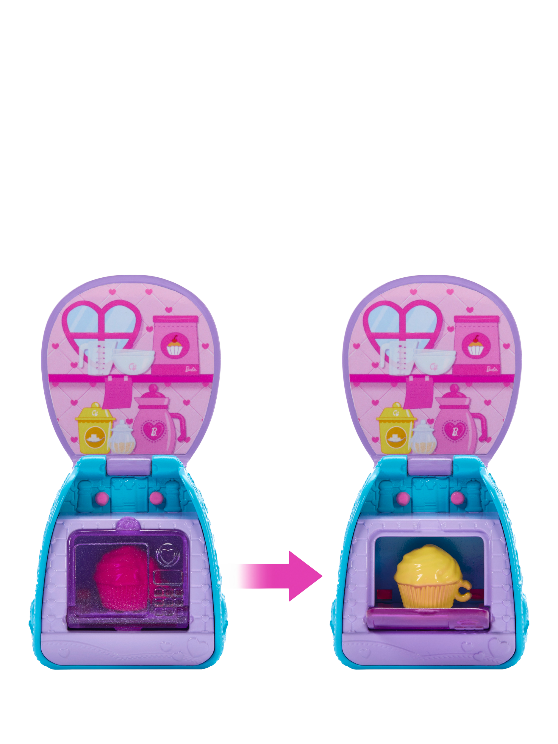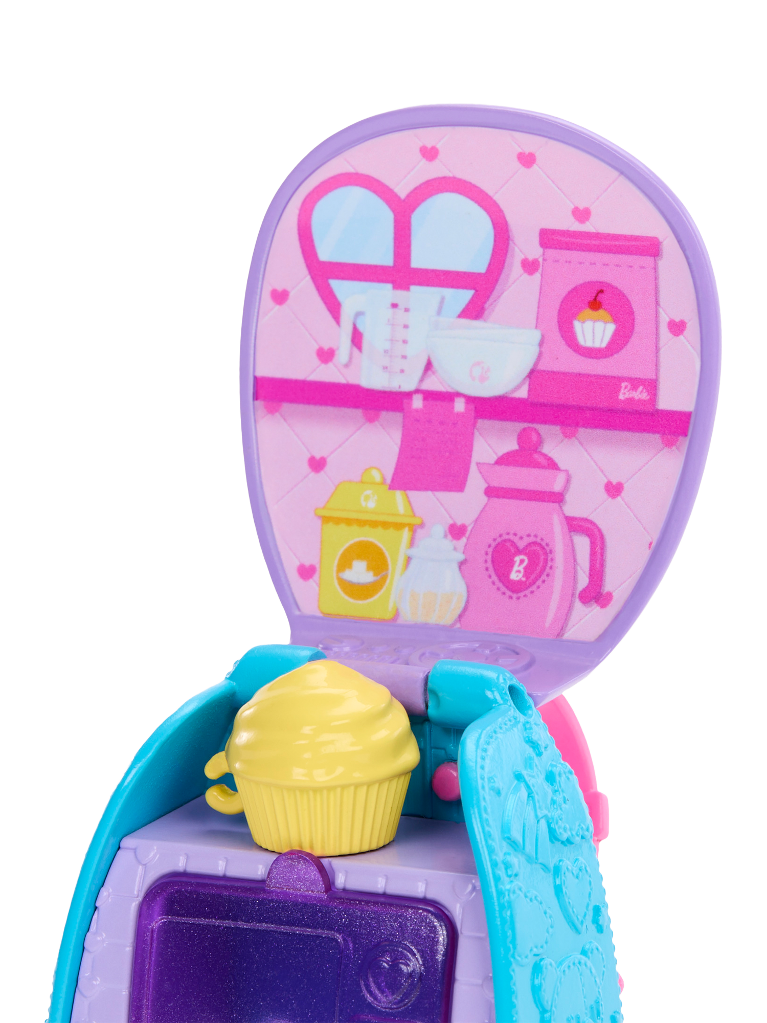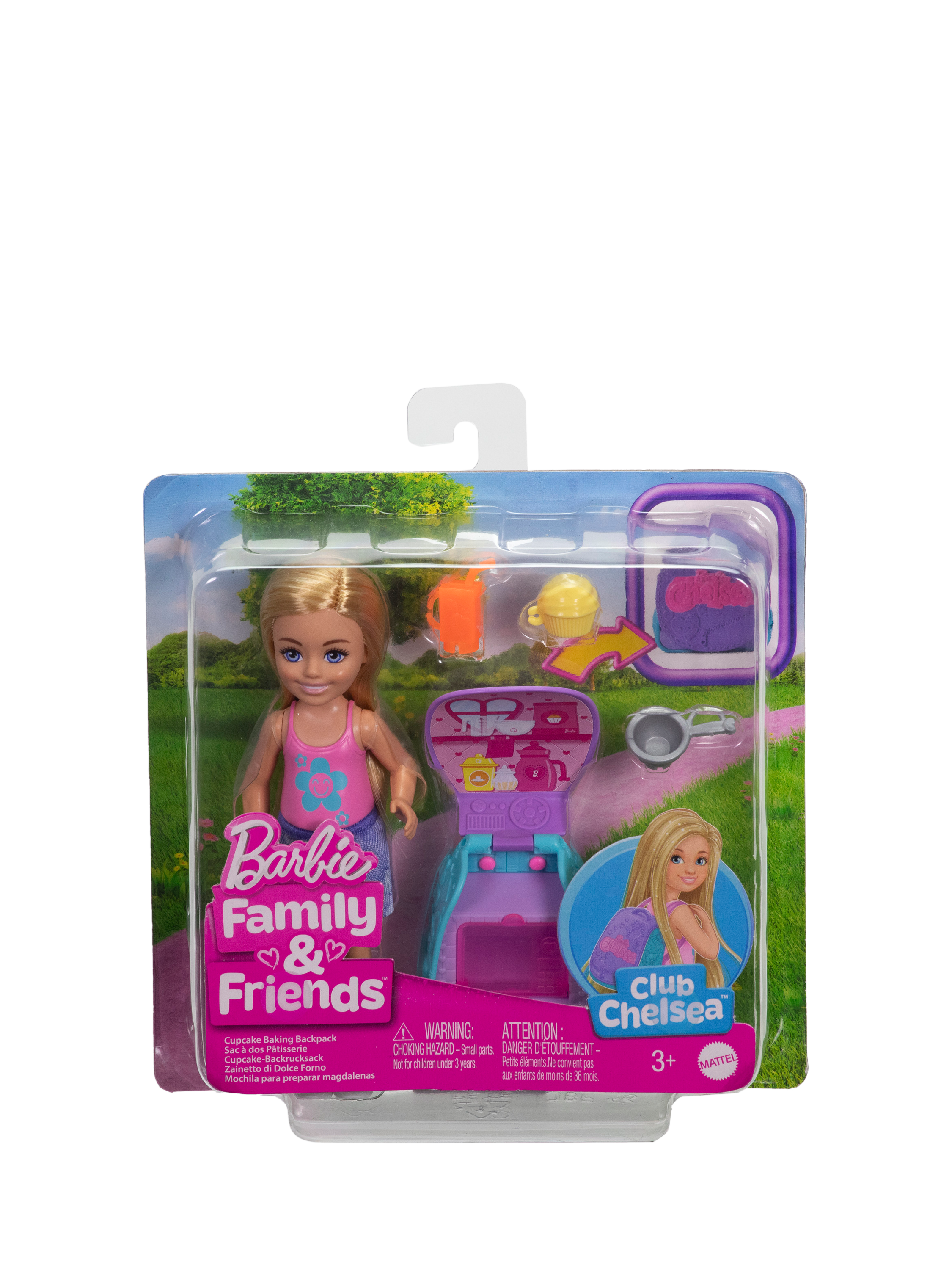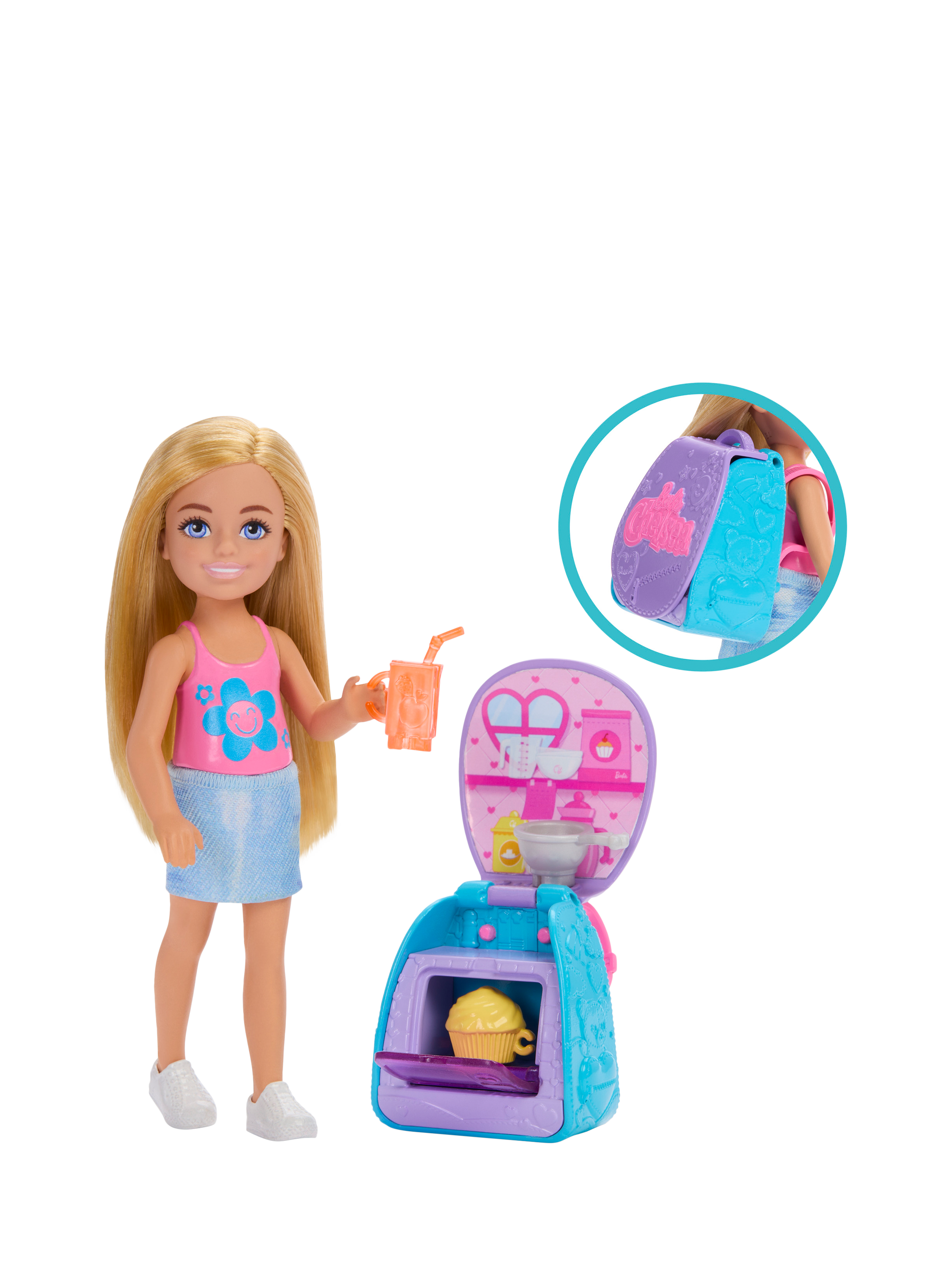 Chelsea and her backpack are ready to bake! Open Chelsea's backpack for a surprise she can use the oven to bake her cupcake. The backpack transforms into a playset. Chelsea also has a mixing bowl to help her bake and her beverage to drink.