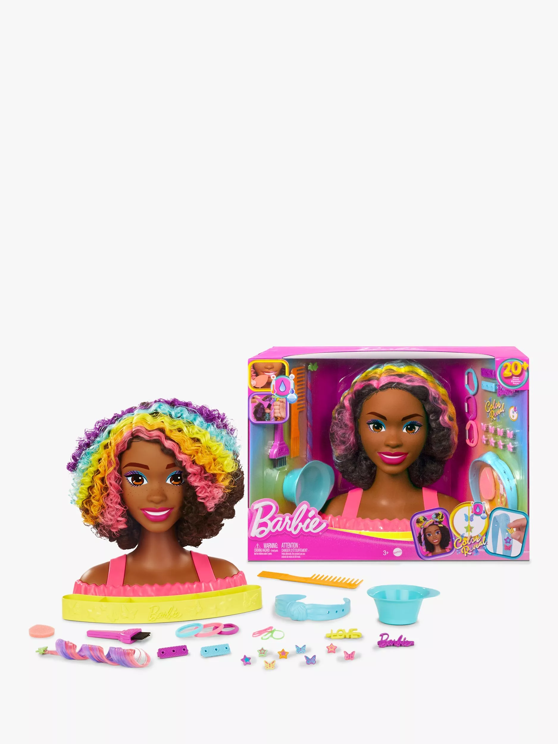 Anyone can be a hair stylist with Barbie Totally Hair styling heads! Colour change surprises add a touch of magic to playtime, while Colour Reveal accessories and customizable features allow for creative exploration. Choose from models with authentic hairstyles, and then let the fun begin with 22 styling pieces! The Barbie Totally Hair Neon Rainbow Deluxe Styling Heads also come with convenient storage at the base so that kids can put away their accessories after playtime is over! Each sold separately, subject to availability. Colours and decorations may vary.