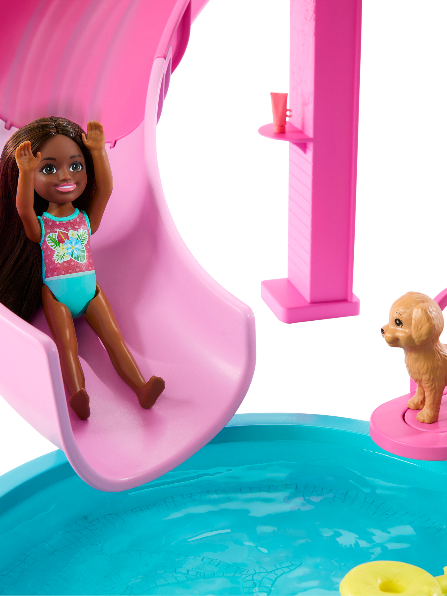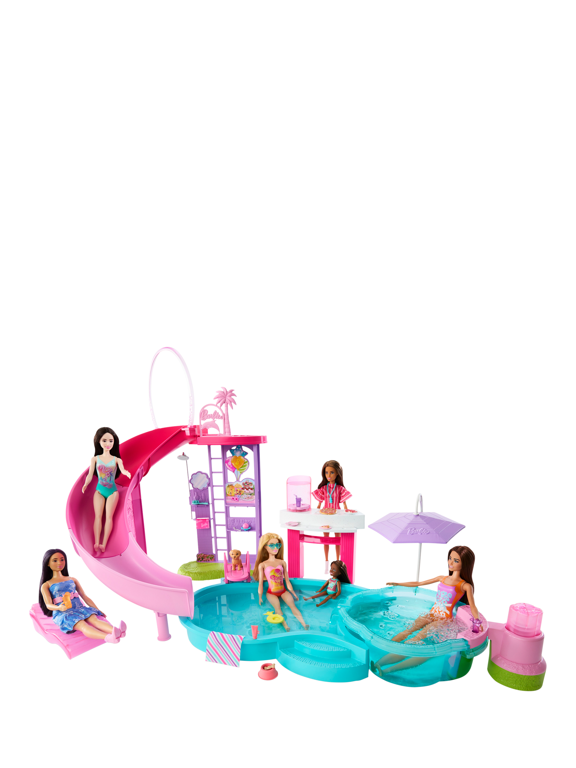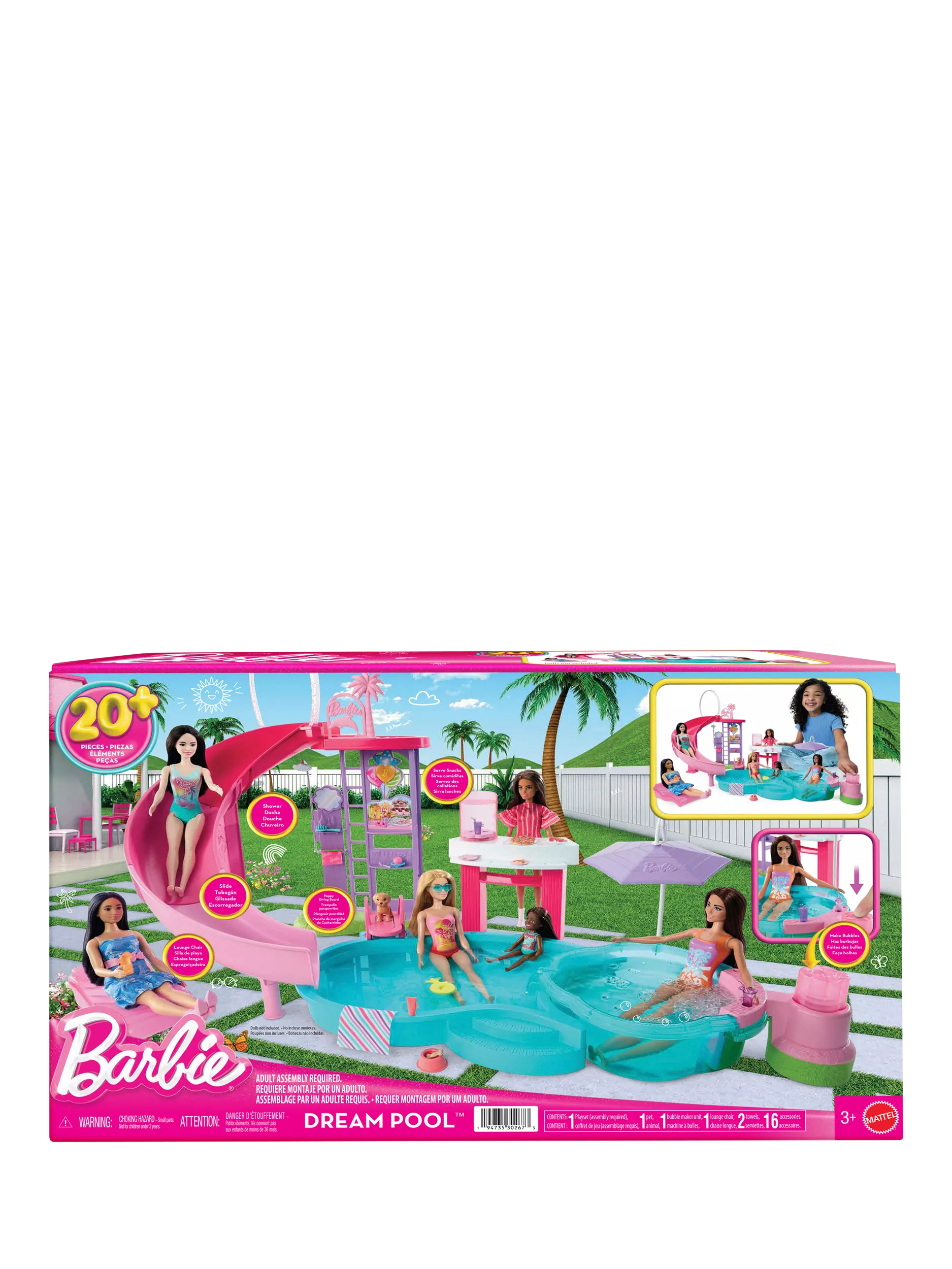 Welcome to the Barbie Dream Pool, where every day is the ultimate pool day! Kids can dive right into playtime with this set featuring six play areas - pool, slide, hot tub and snack station and there's more than twenty accessories. Fill the pool with water for an instant pool party, then send Barbie dolls (sold separately) down the slide to make a splash! Press the lever to see bubbles form in the hot tub, then head over to the snack station to serve up even more fun. Whether kids add this set to their Dream House or play with it on its own, the Barbie Dream Pool playset is a gift that will make a big splash at playtime.