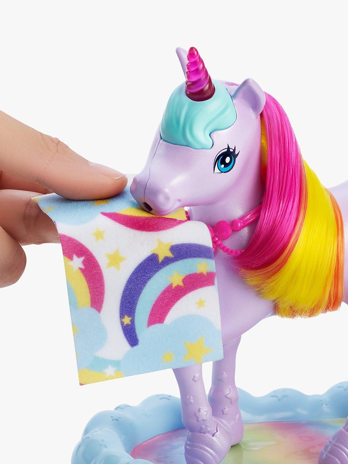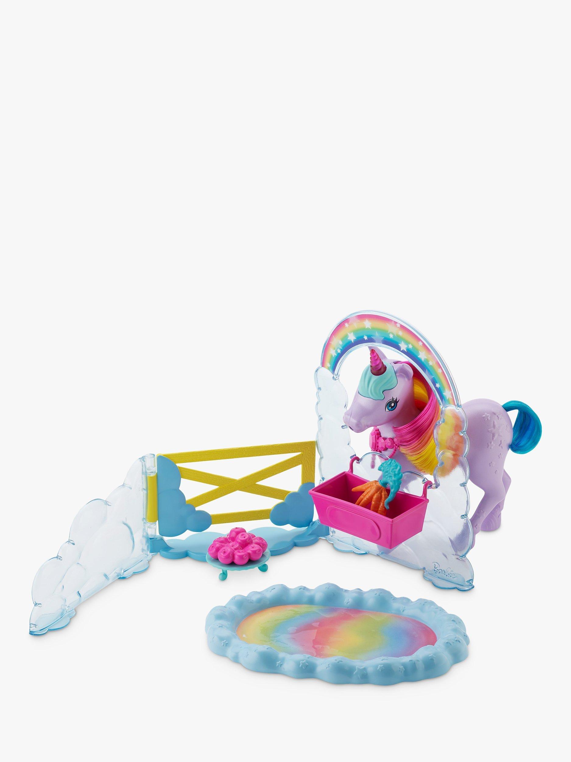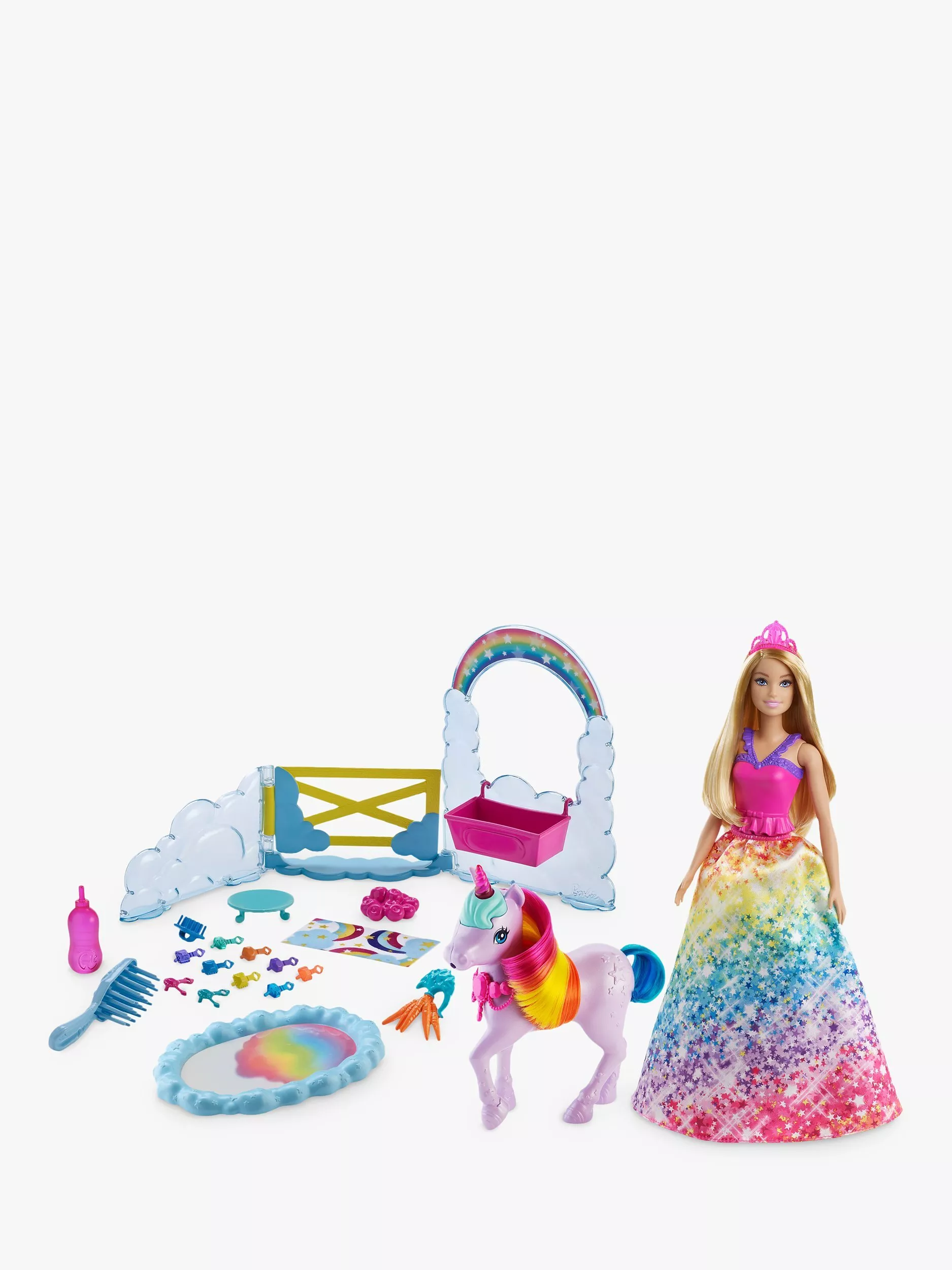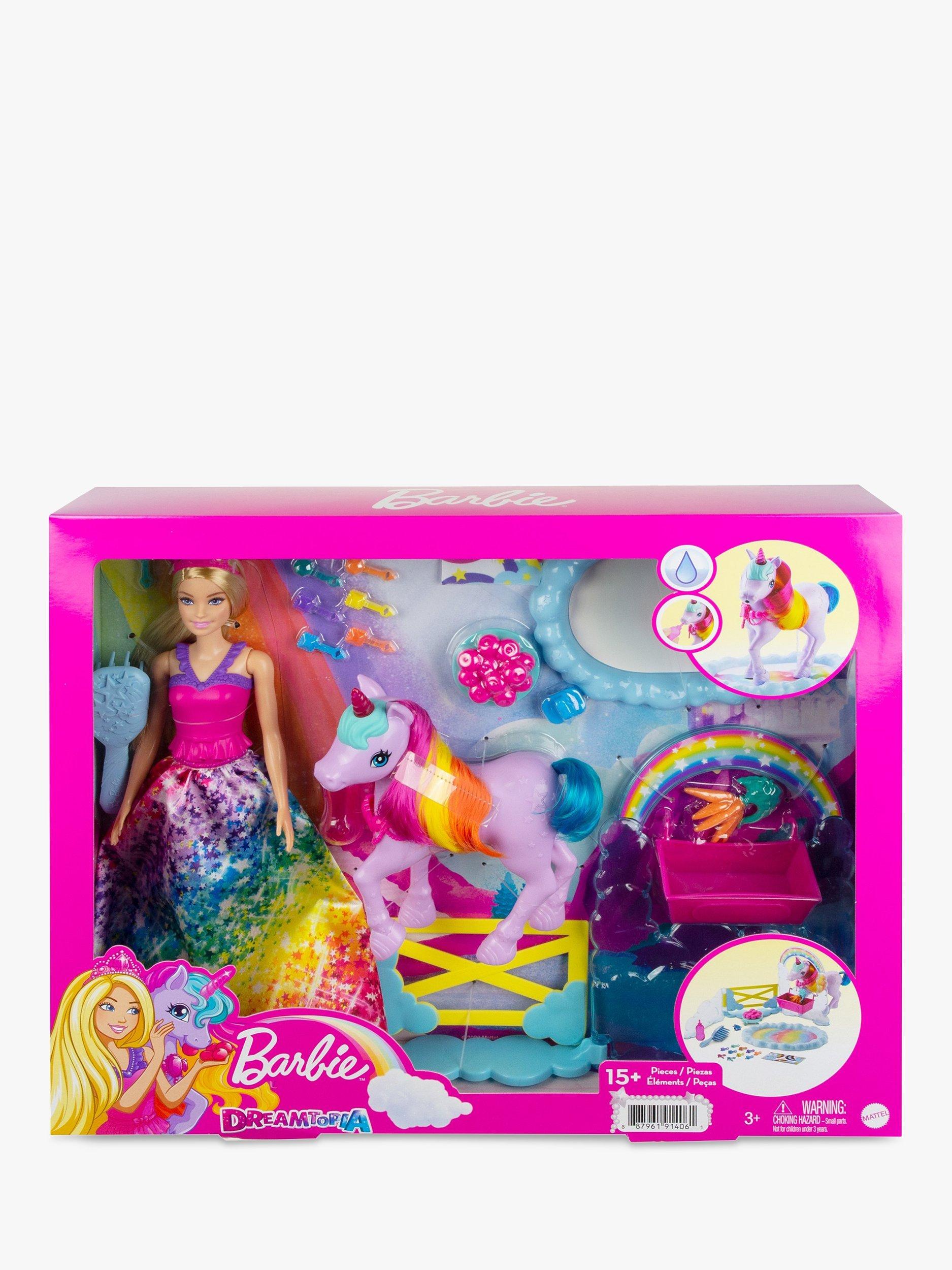 This Barbie Dreamtopia playset inspires kids to create all kinds of nurturing fairytale adventures! The Barbie princess doll can take care of her pet unicorn toy. Fill the bottle with water and help the Barbie doll feed her unicorn friend. The potty pad will change colour from white to a beautiful rainbow! This Barbie playset comes with a toy unicorn trough, snacks, hairbrushes (for Barbie princess and her unicorn) and 10 doll accessories for many imaginative play possibilities.