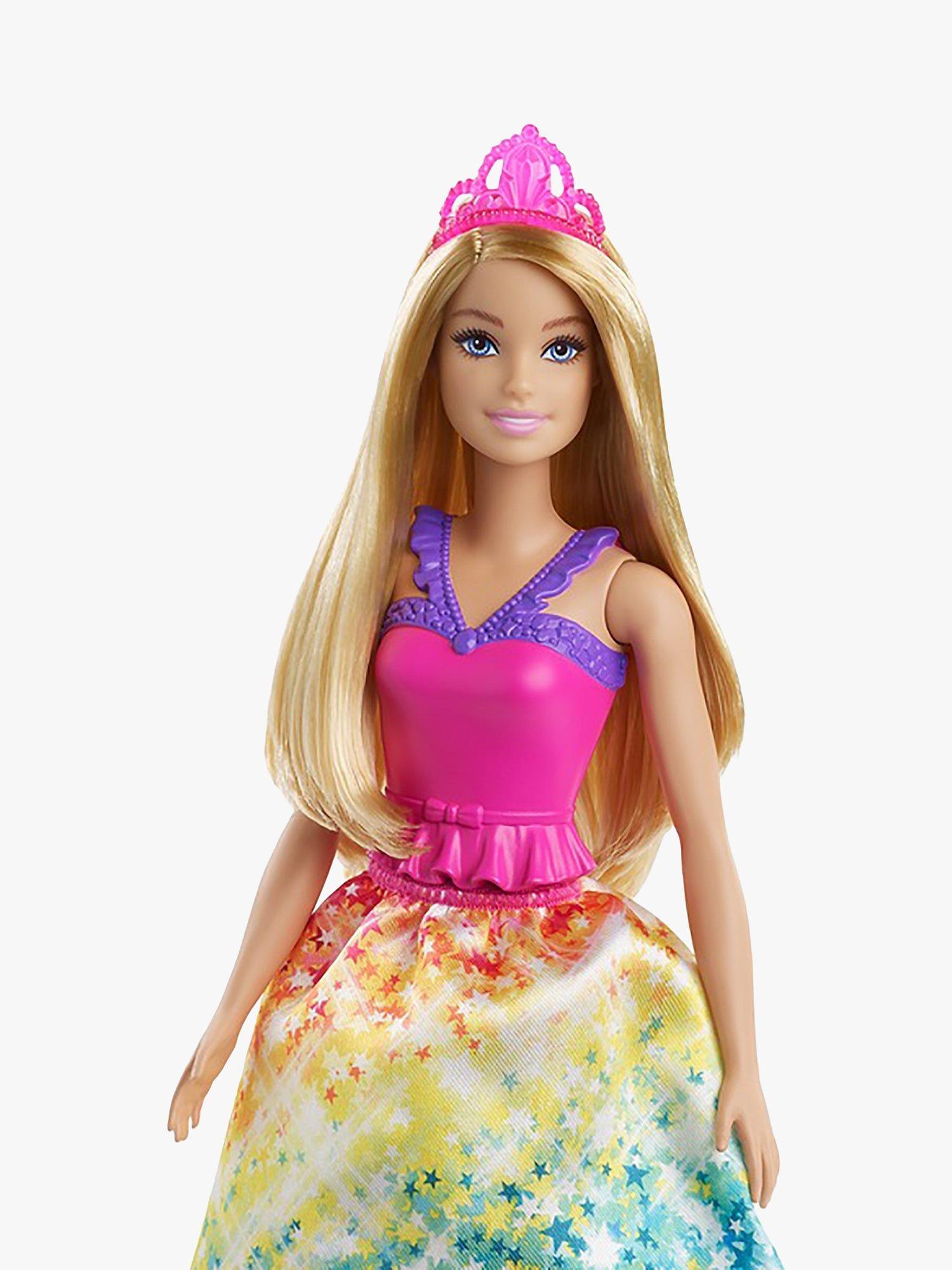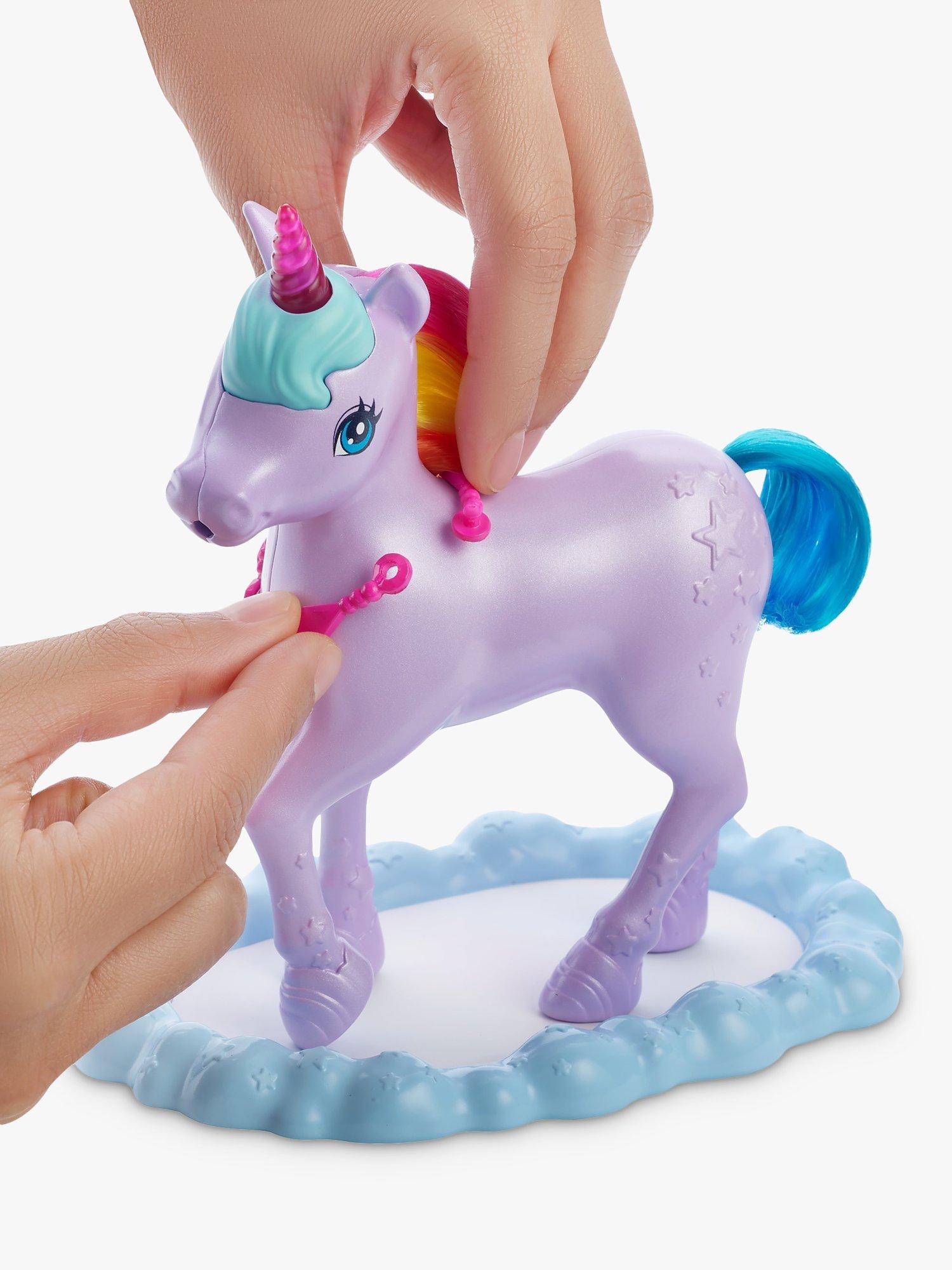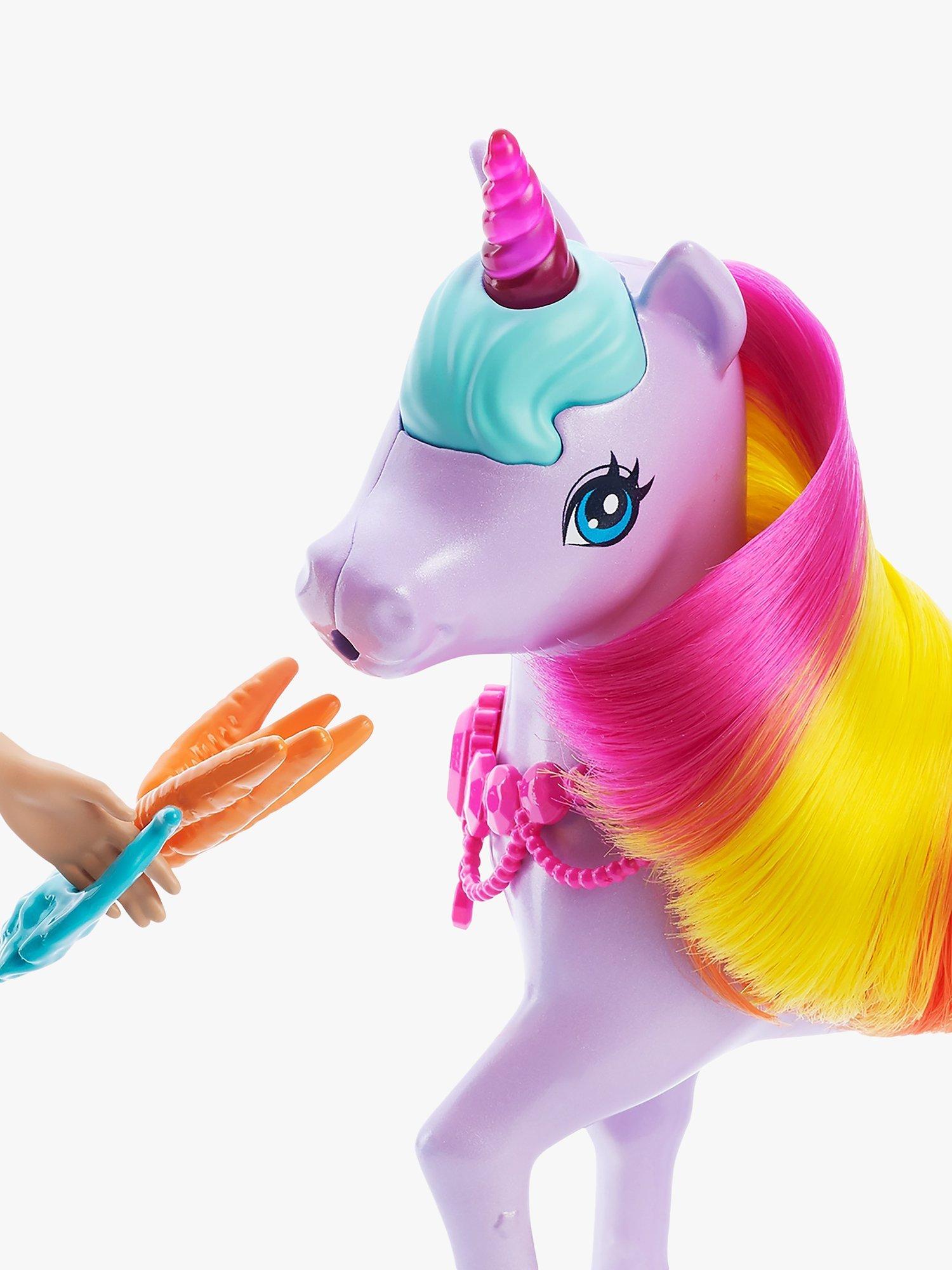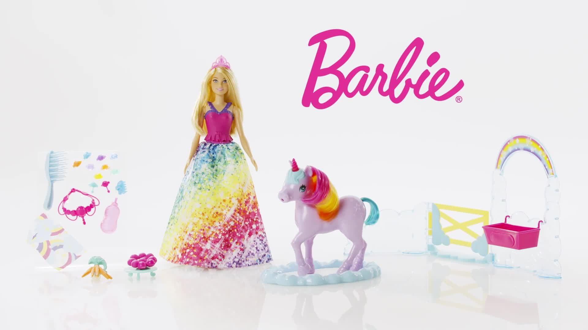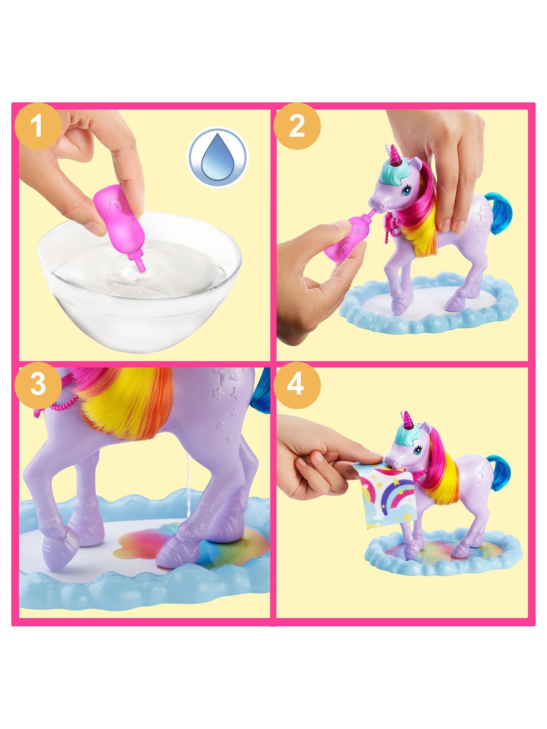 This Barbie Dreamtopia playset inspires kids to create all kinds of nurturing fairytale adventures! The Barbie princess doll can take care of her pet unicorn toy. Fill the bottle with water and help the Barbie doll feed her unicorn friend. The potty pad will change colour from white to a beautiful rainbow! This Barbie playset comes with a toy unicorn trough, snacks, hairbrushes (for Barbie princess and her unicorn) and 10 doll accessories for many imaginative play possibilities.