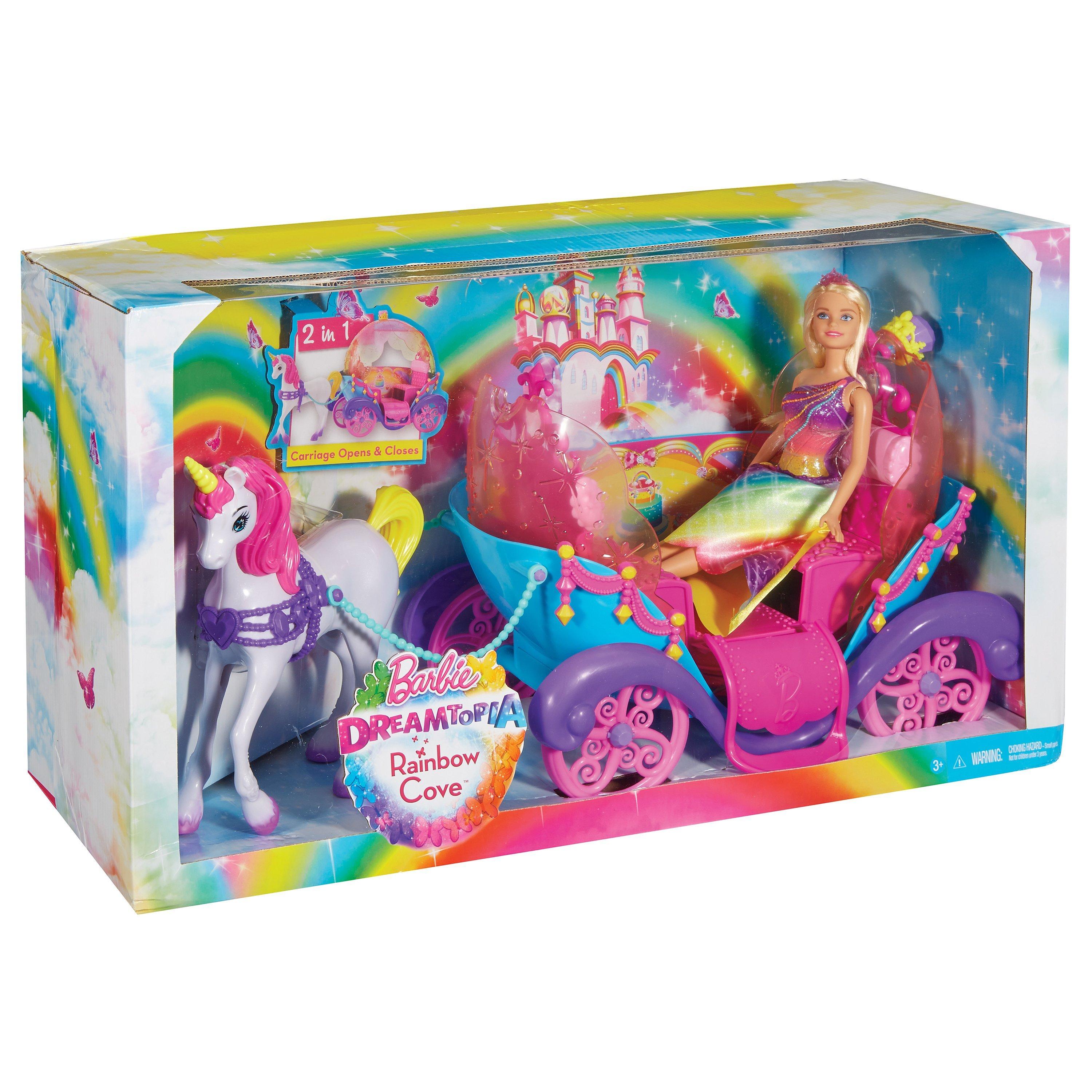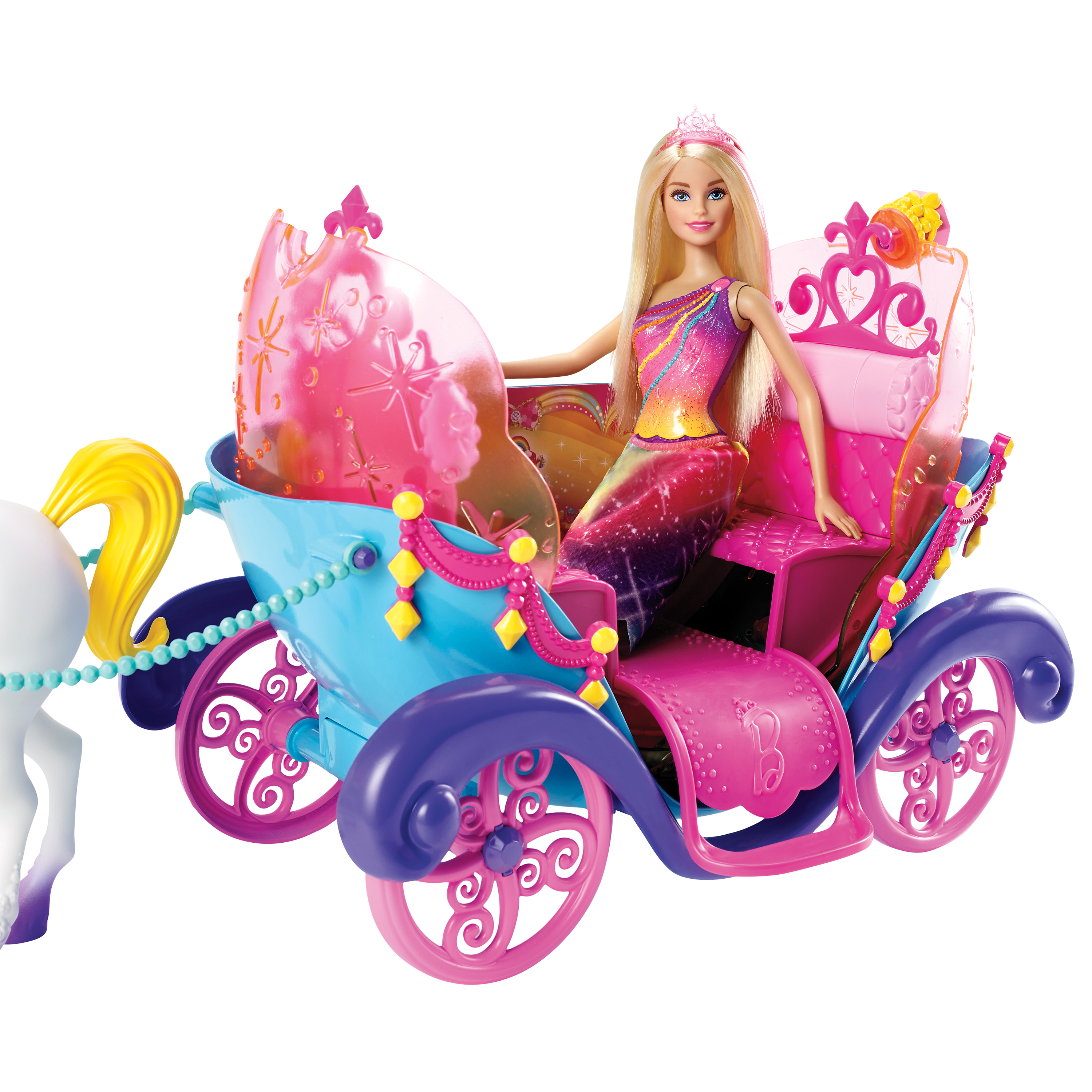 This set includes a Barbie doll wearing fashion and accessories, a luxurious carriage and a unicorn with a gem-decorated bridle and beaded reins. The doll cannot stand alone.