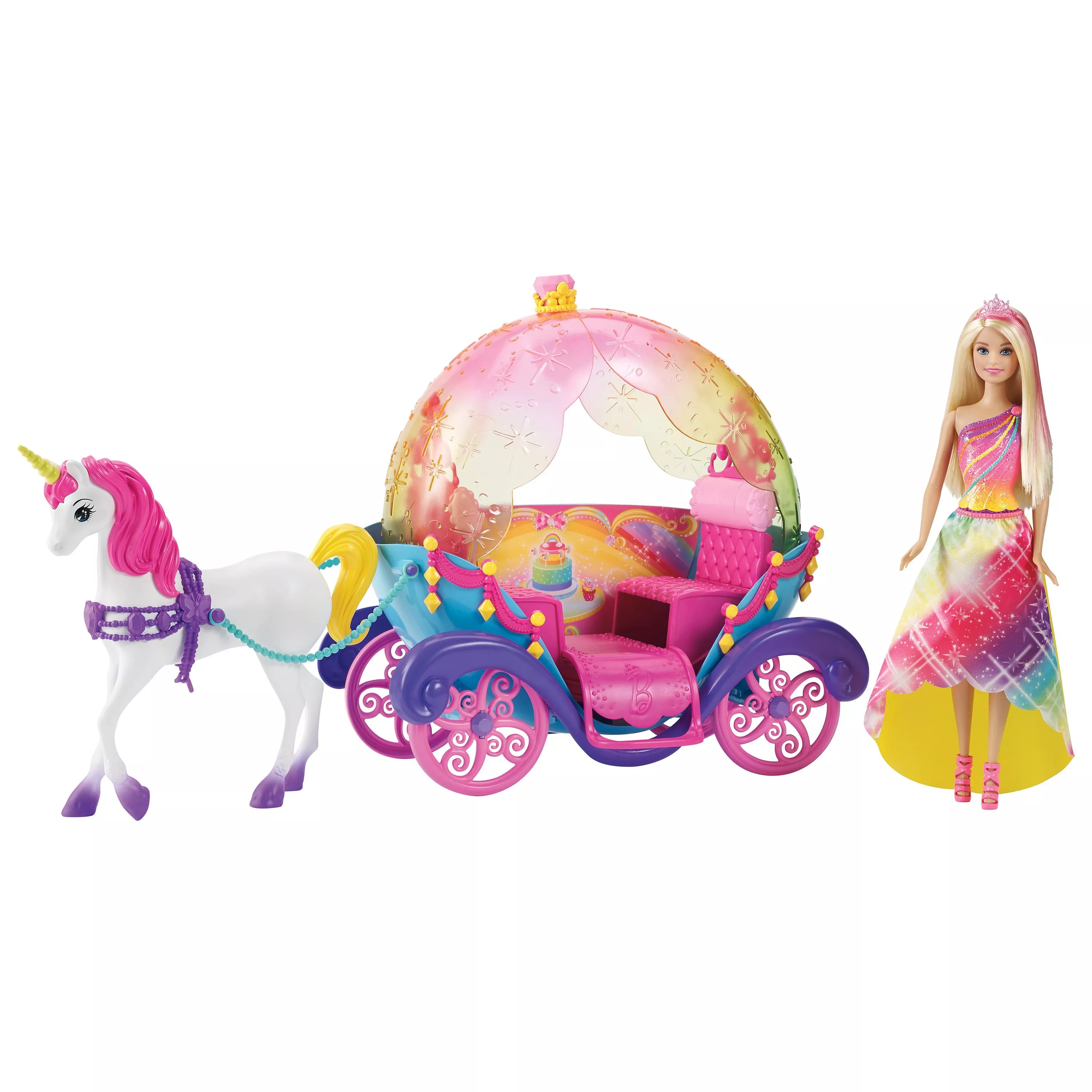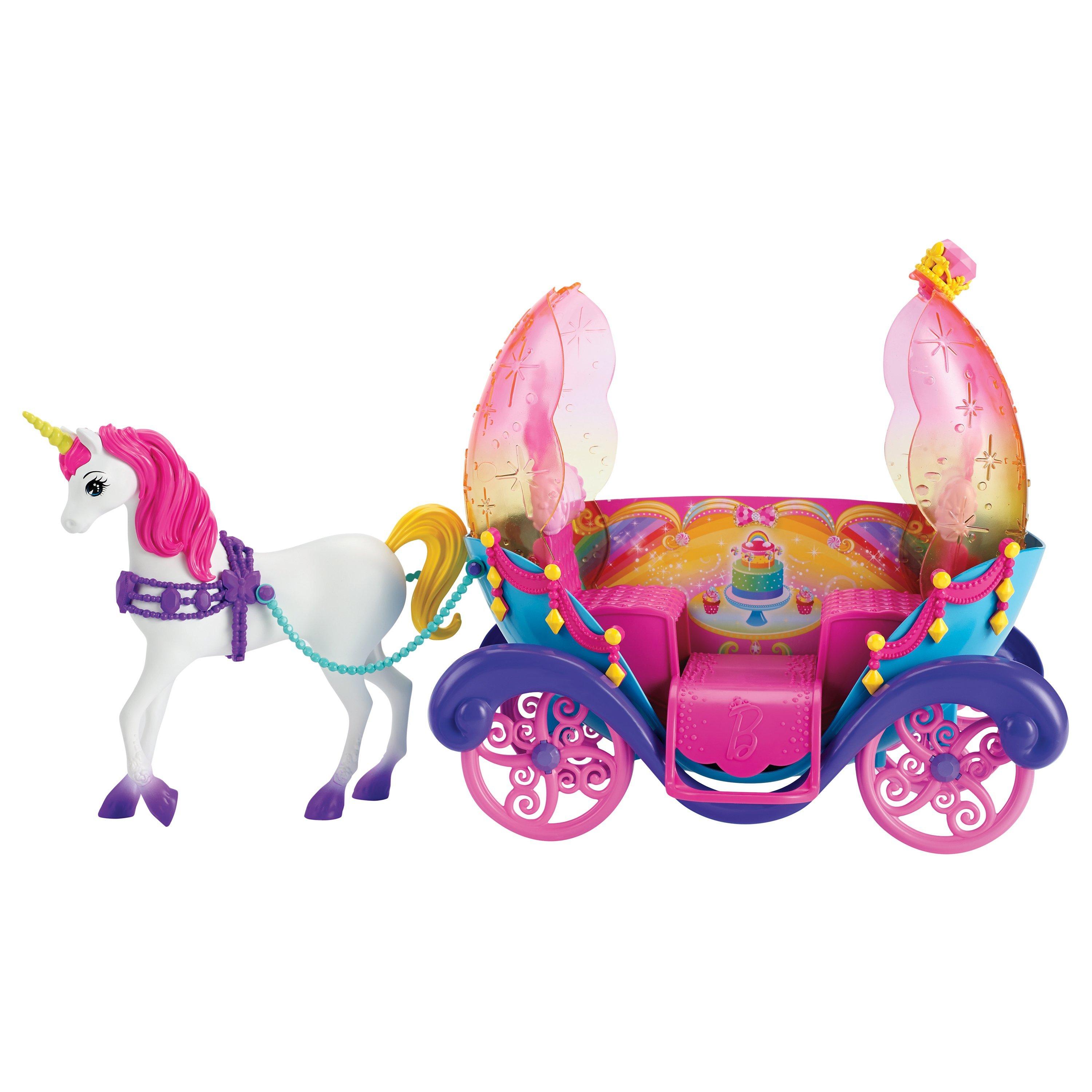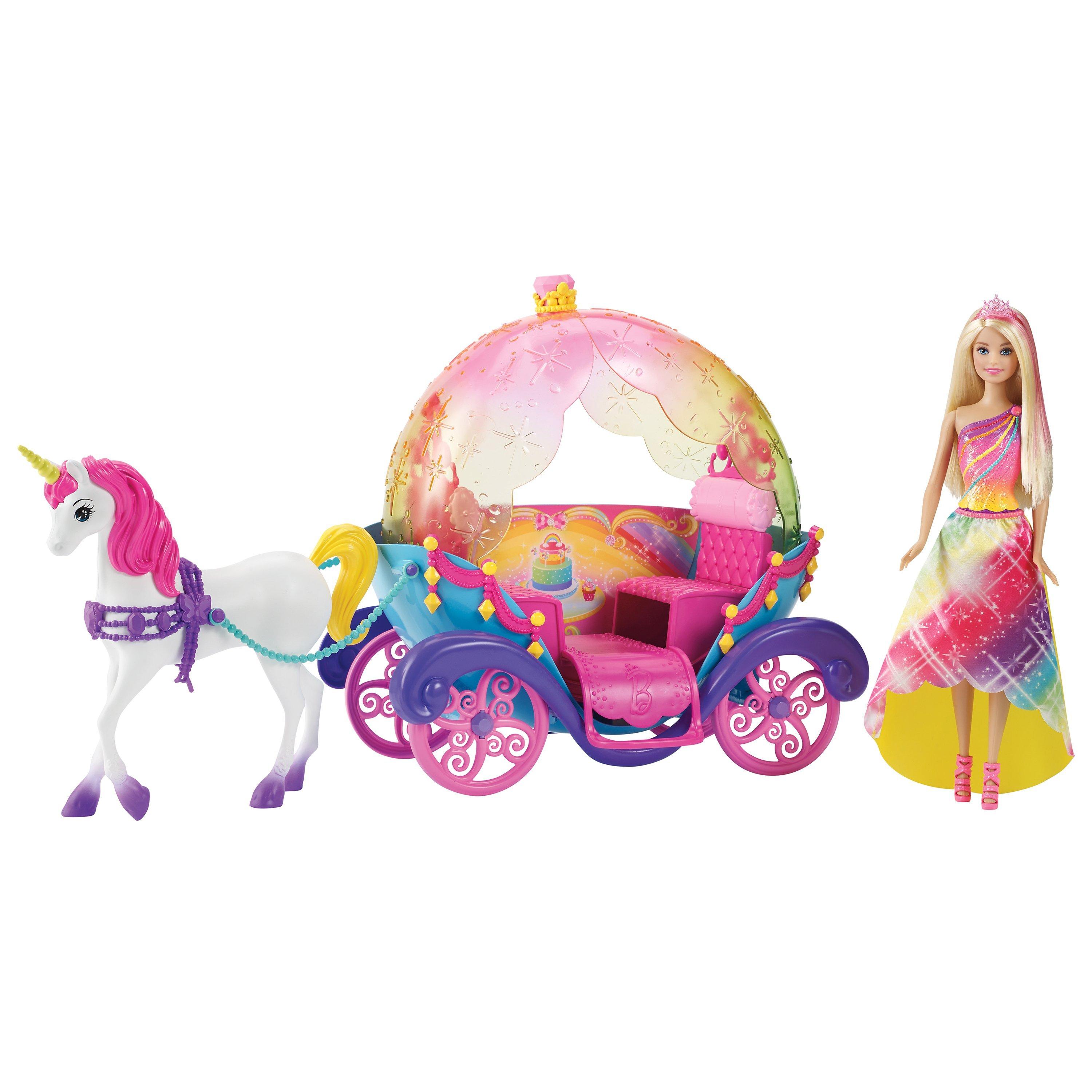 With this beautiful set, Barbie lives the life of a princess. She has her own rainbow carriage with rolling wheels, pulled by a pretty unicorn with a bright pink mane.