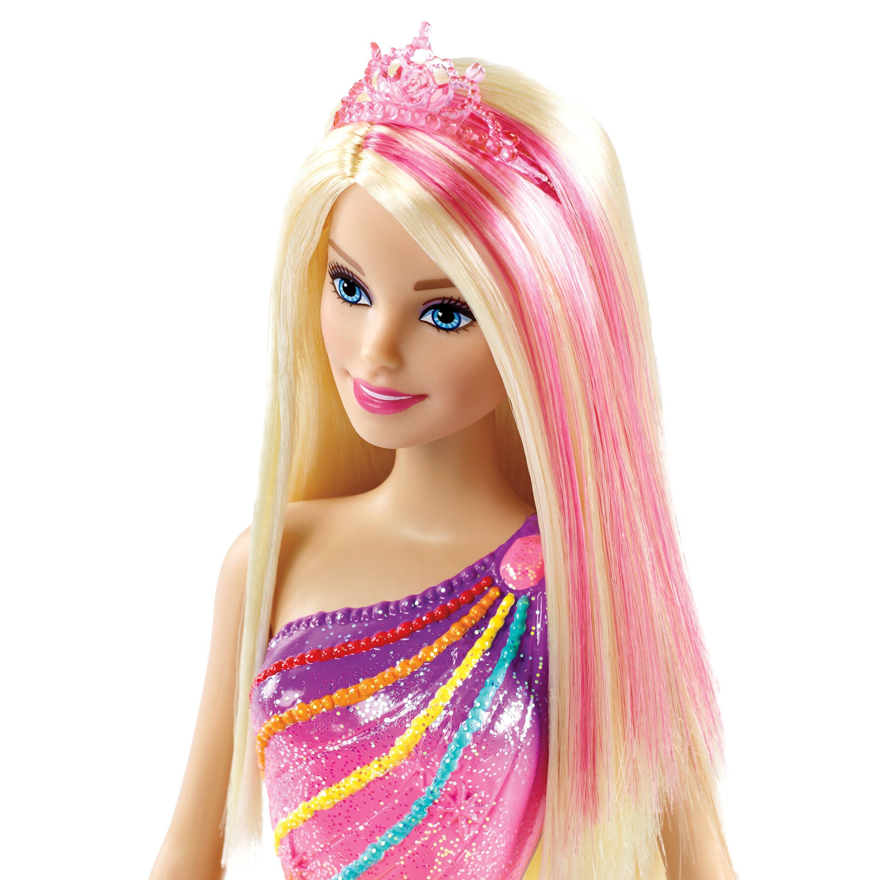 There’s room for 2 (other dolls sold separately) in the ornate carriage and you can play with the dome roof open or closed. Barbie has never been so colourfully dressed with rainbow beads on her shaded bodice, a removable skirt and pink royal tiara.