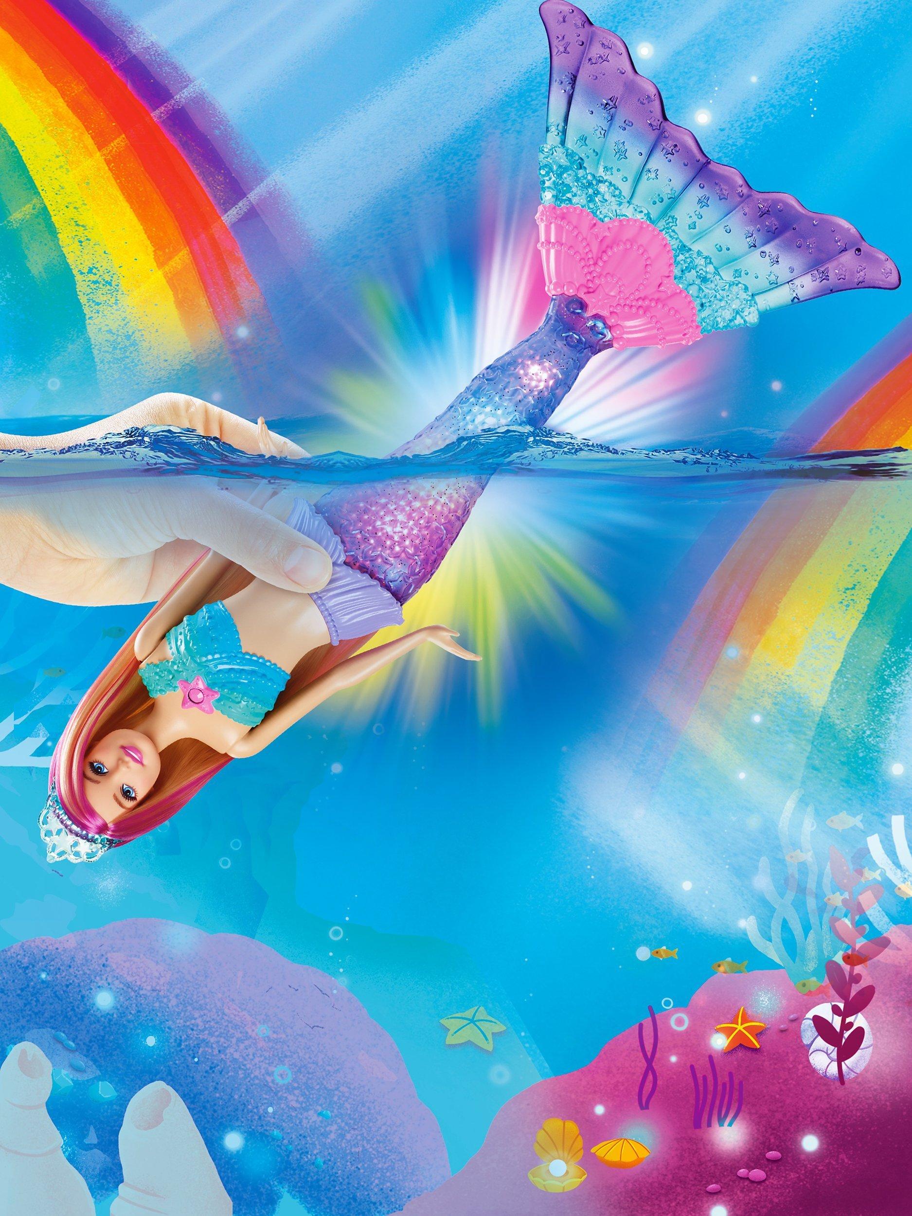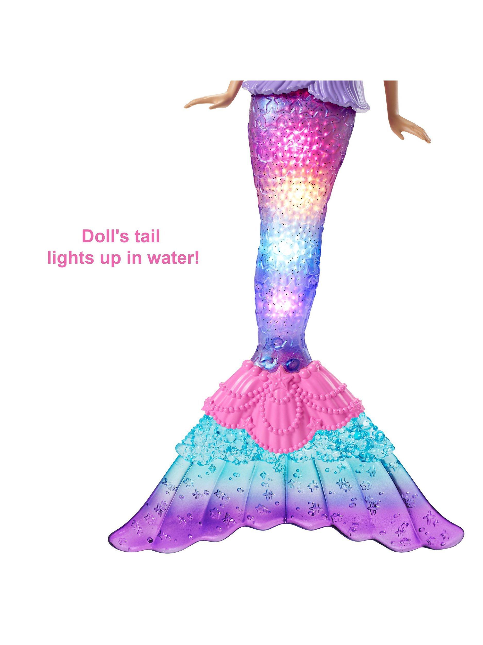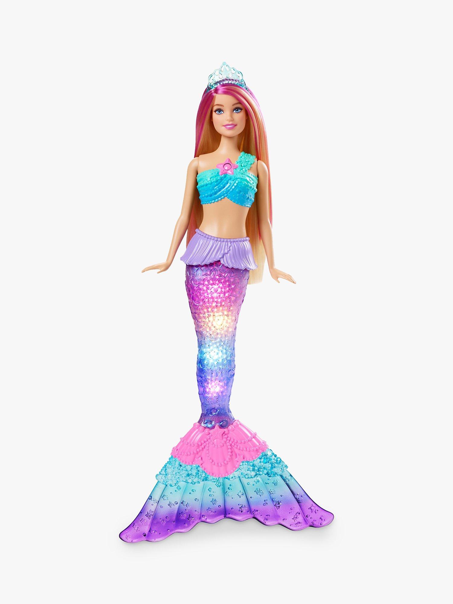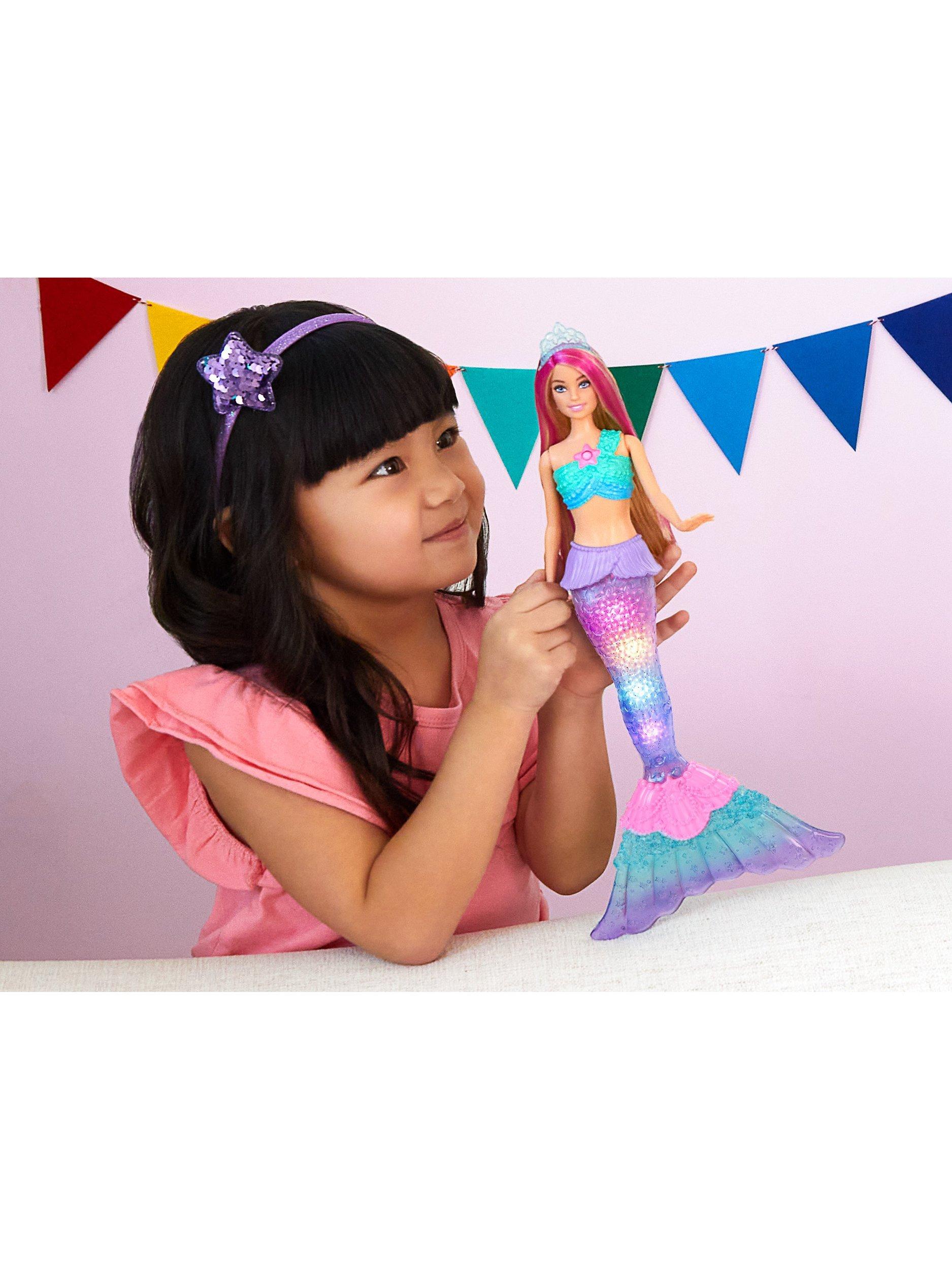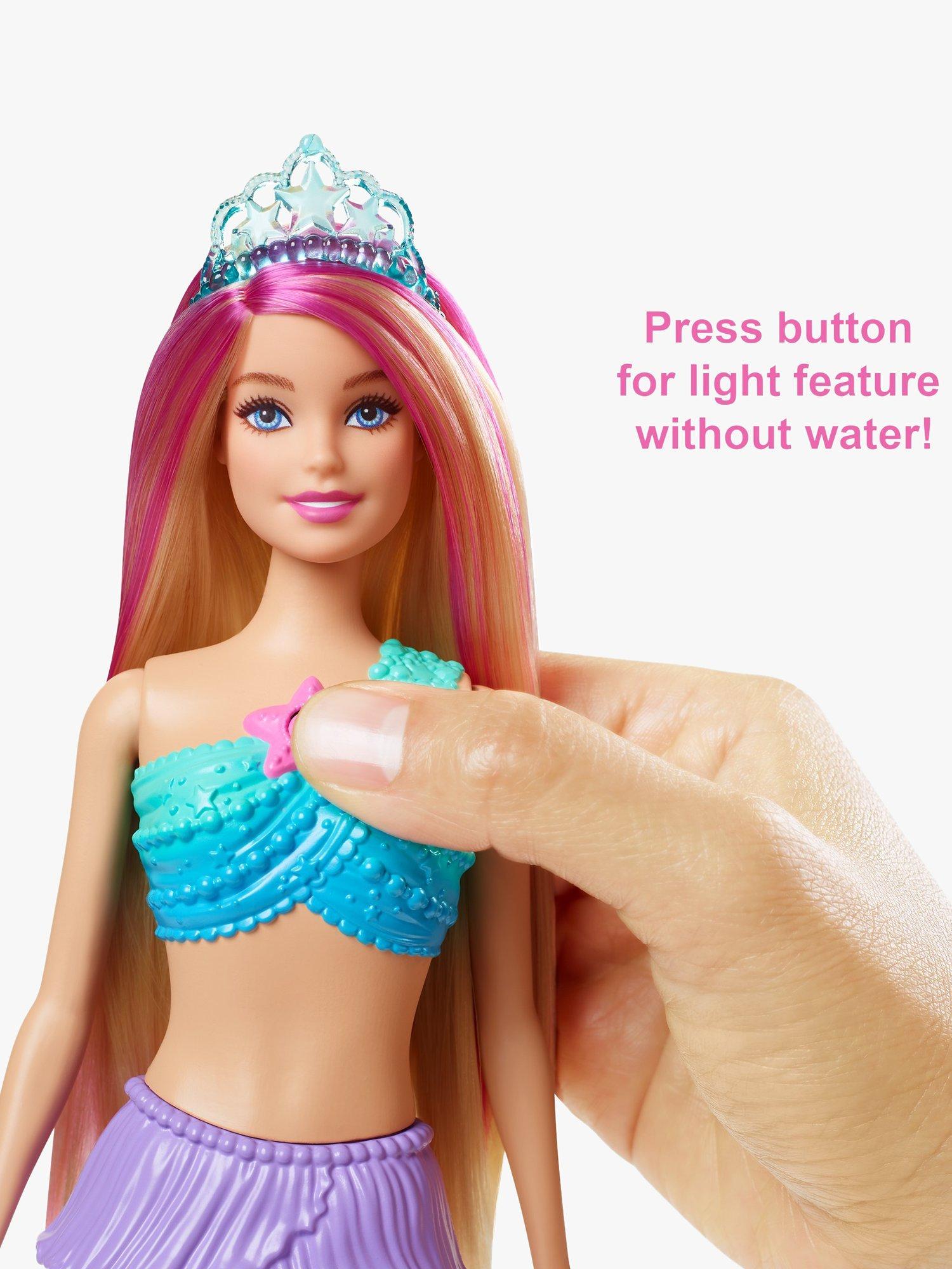 Imaginations can dive into storytelling with this light-up Barbie doll! Dip her in water to see her pearlescent tail glimmer with one of four colourful light shows.