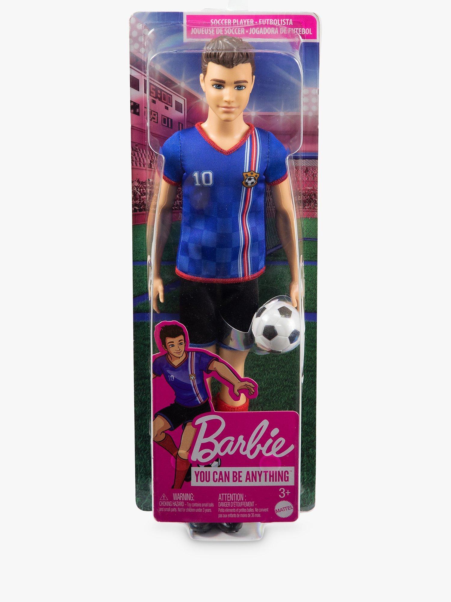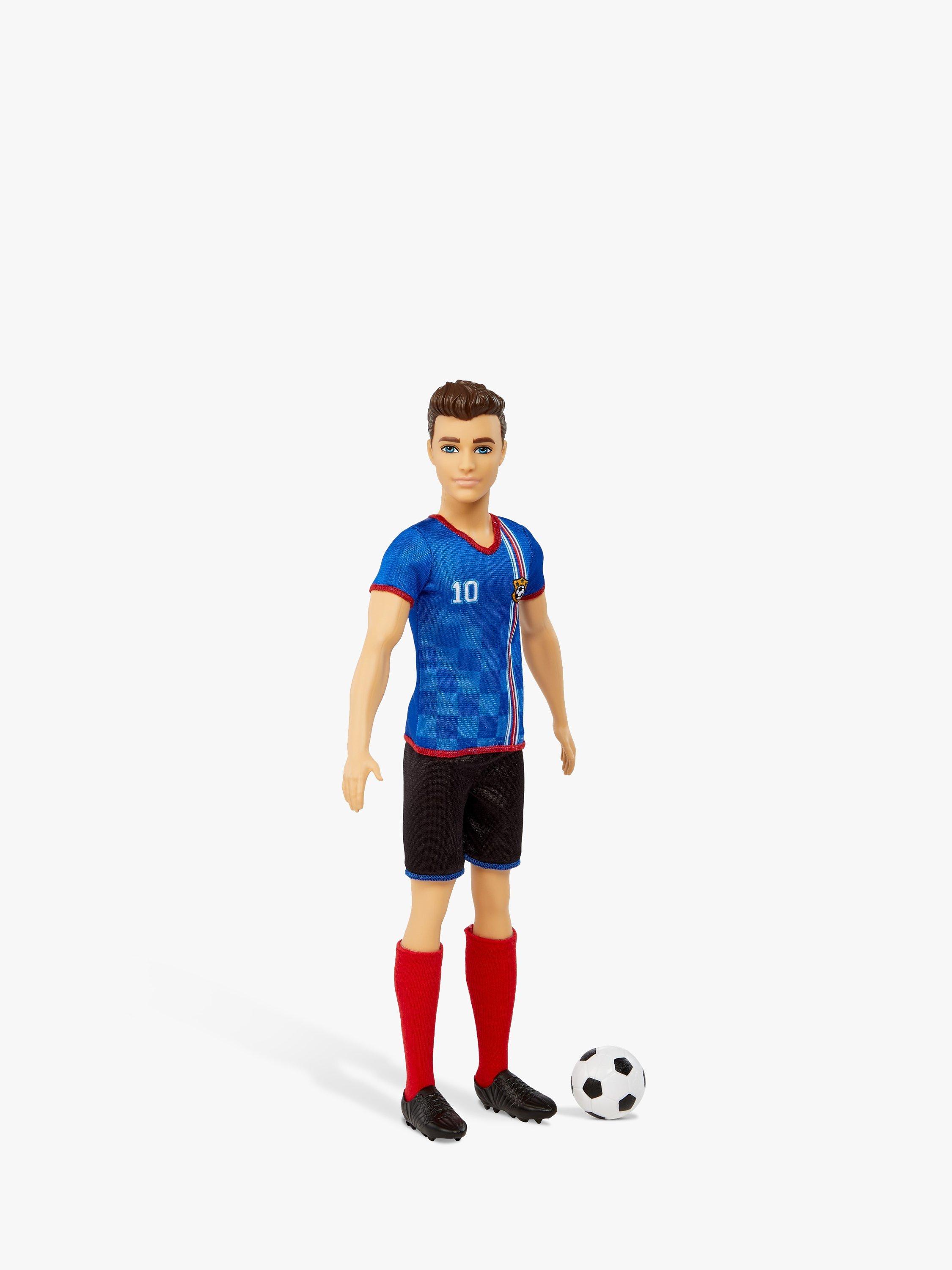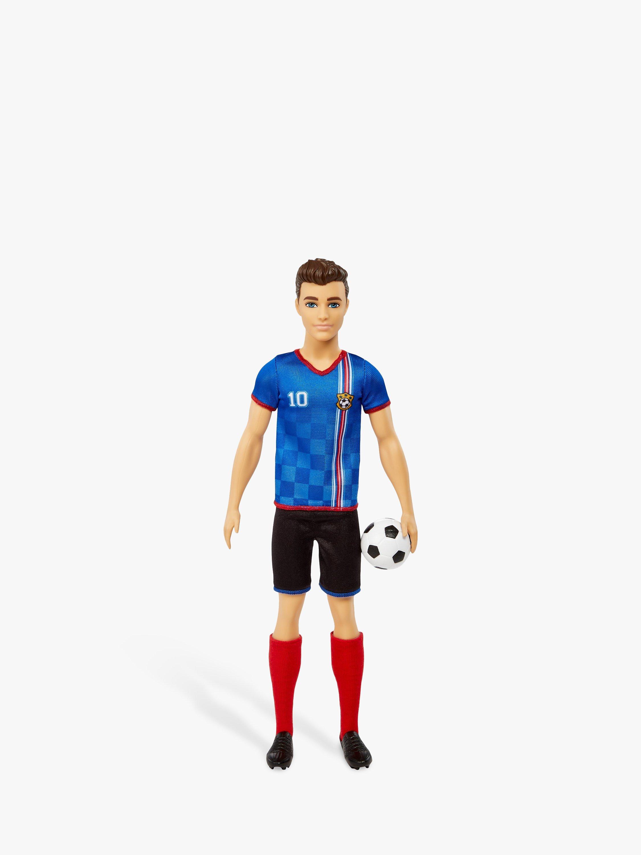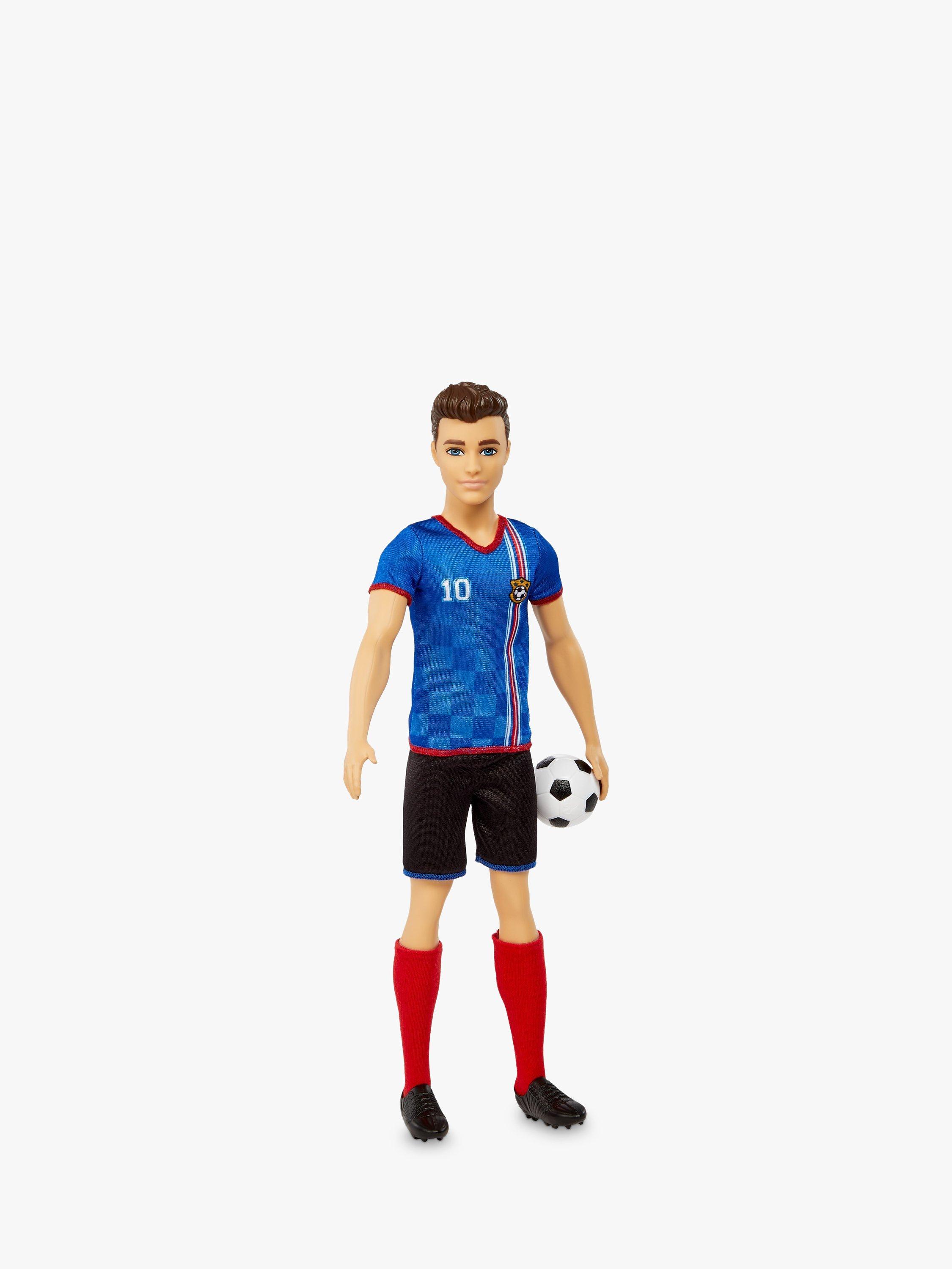 Get ready to celebrate one of kids' favourite sports with this Barbie Ken football doll. Inspired by a globally popular colour scheme, Ken wears a kit consisting of a blue shirt with a stripe, the number '10' and a team patch plus black shorts, cleats and tall red socks.