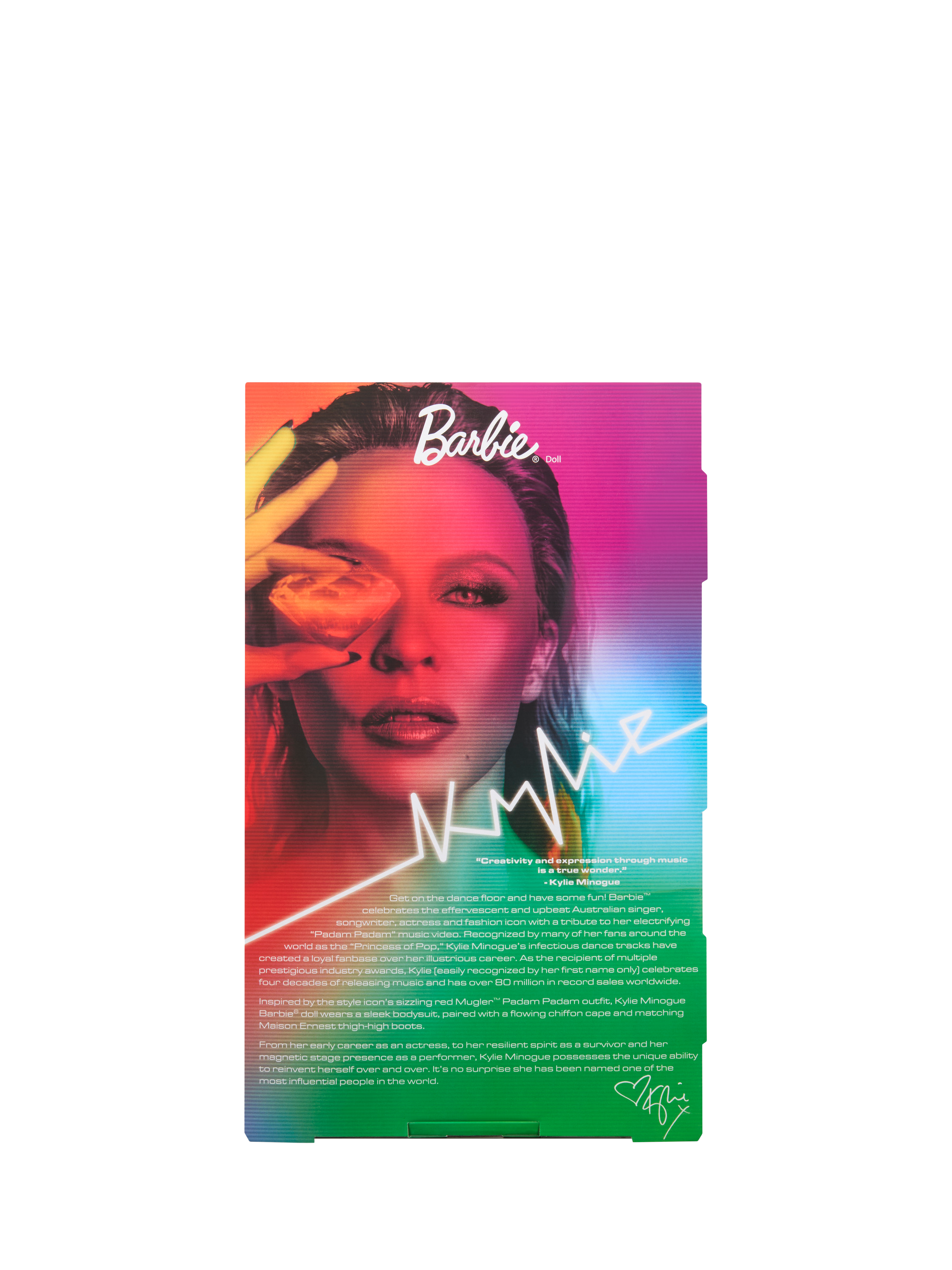 This collector Barbie doll celebrates the global pop sensation, Kylie Minogue. Throughout her illustrious career, she has won the hearts of millions around the world as both a visionary artist and an inspiring individual. From her iconic tracks and magnetic stage presence to her authentic nature and passionate dedication, it’s no surprise that she was named one of the most influential people in the world.
