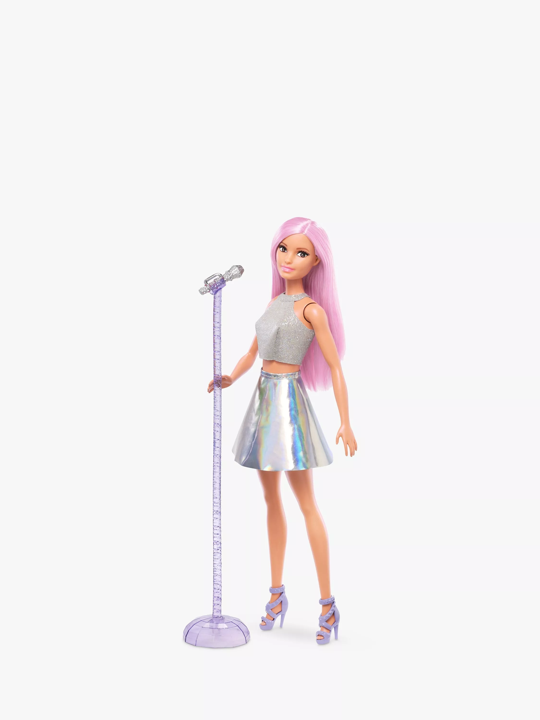 Includes pop star doll wearing fashions and shoes, plus microphone and microphone stand. Doll cannot stand alone. Colours and decorations may vary.